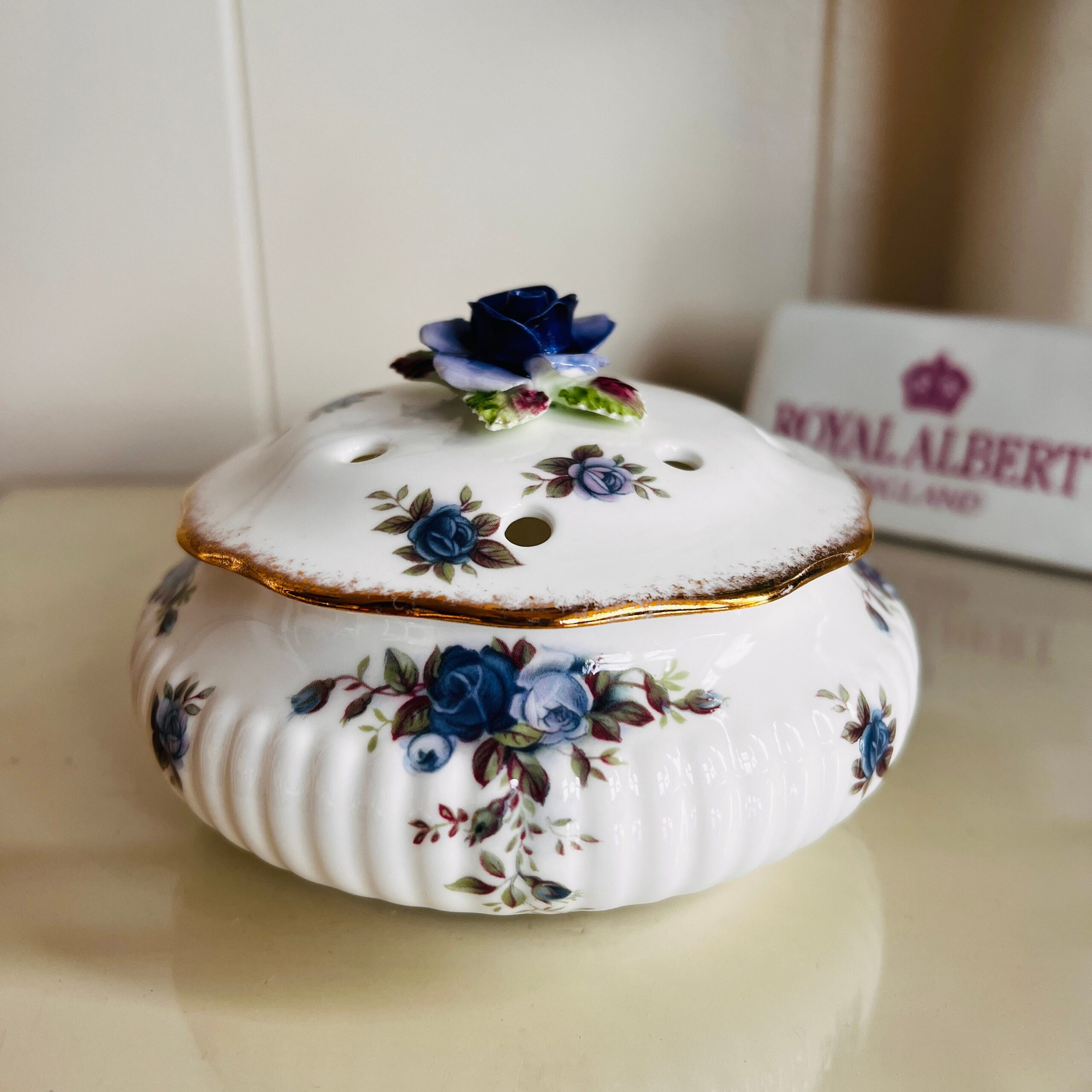 Rich in detail and sealed with charm, this Royal Albert Moonlight Rose lidded bowl from 1987 is a refined example of English bone china. Featuring the beloved cobalt blue rose motif and trimmed in gleaming gold, it’s a graceful piece for collectors or those who cherish timeless tableware. Use it to serve sugar or sweets, or simply display it on your shelf as a floral accent with heirloom appeal.