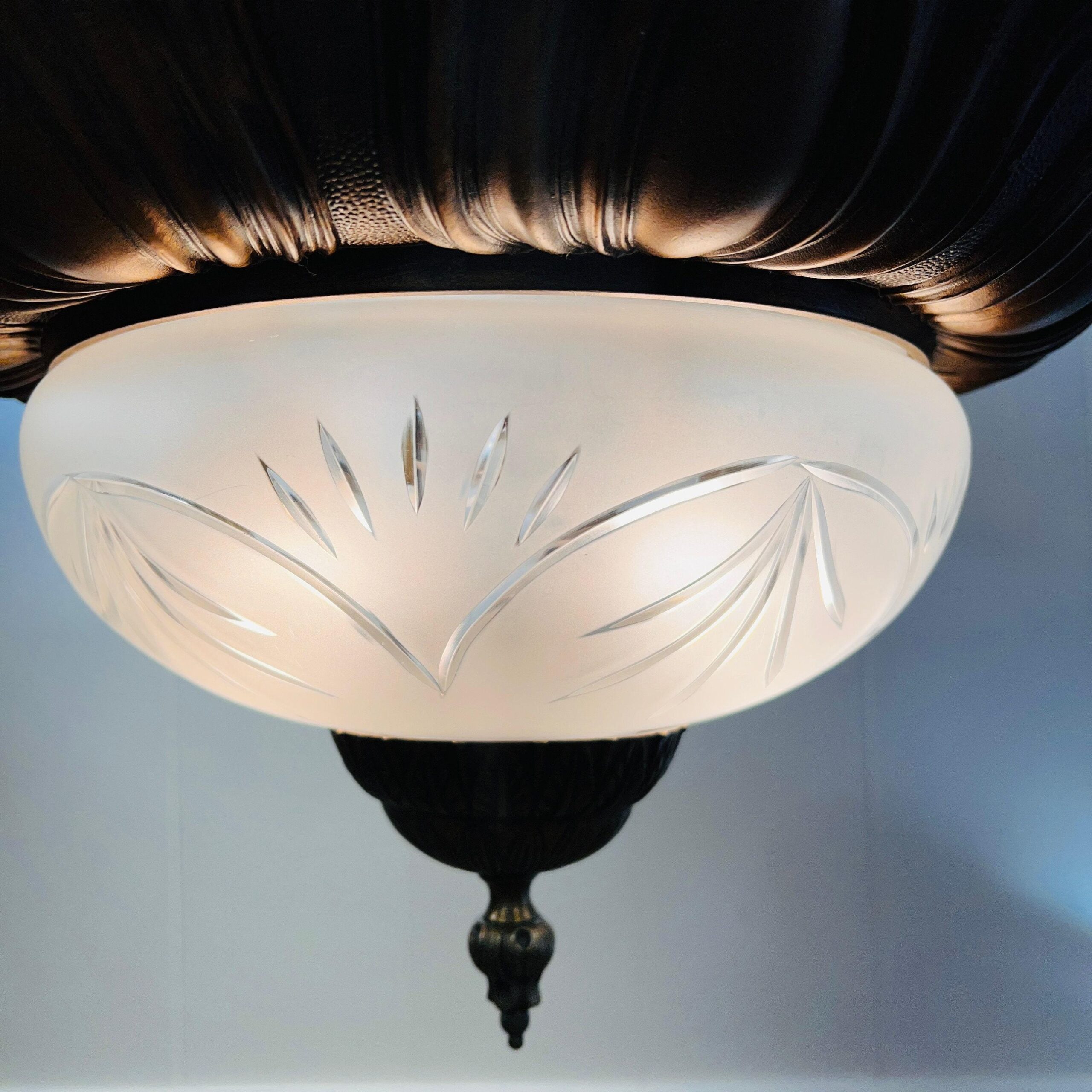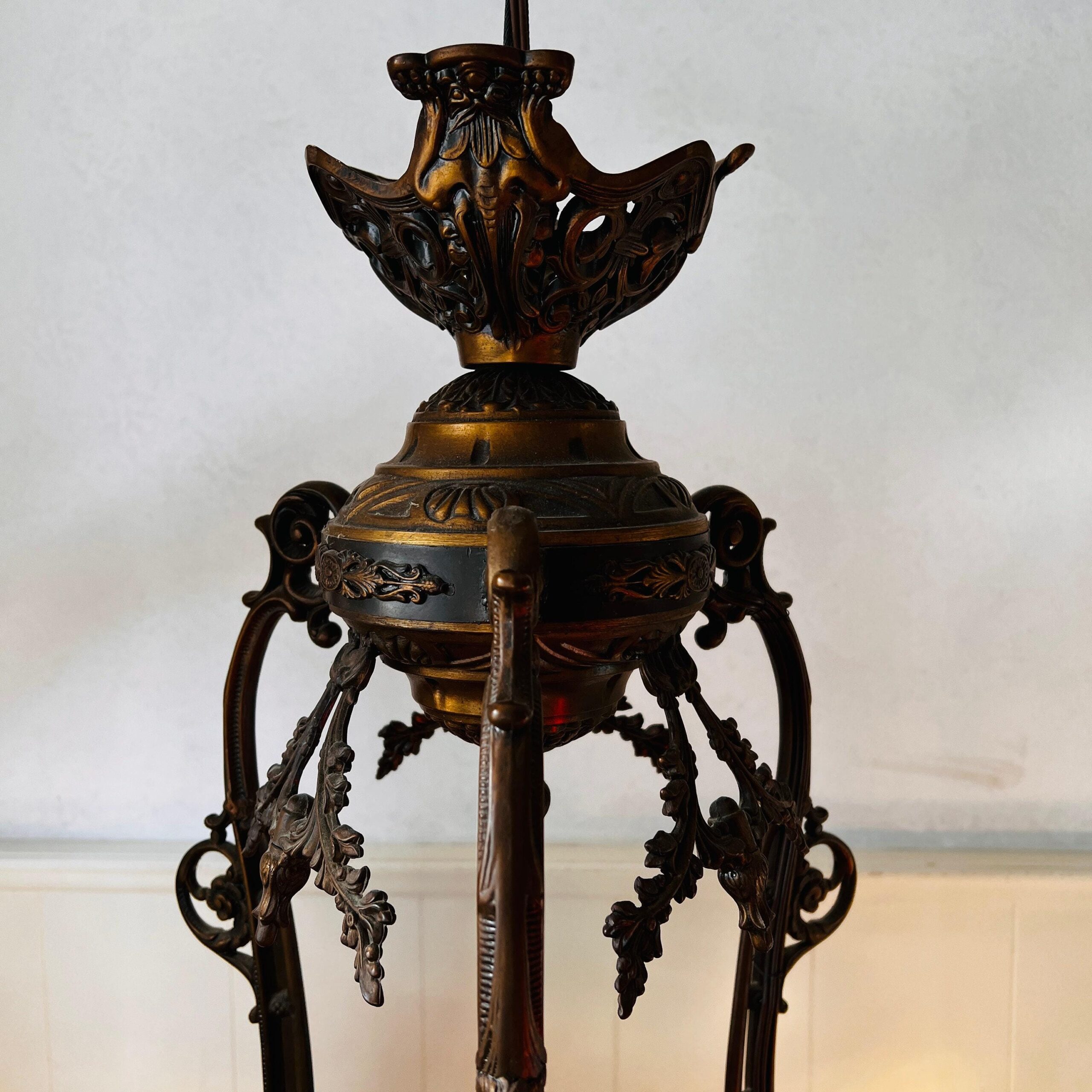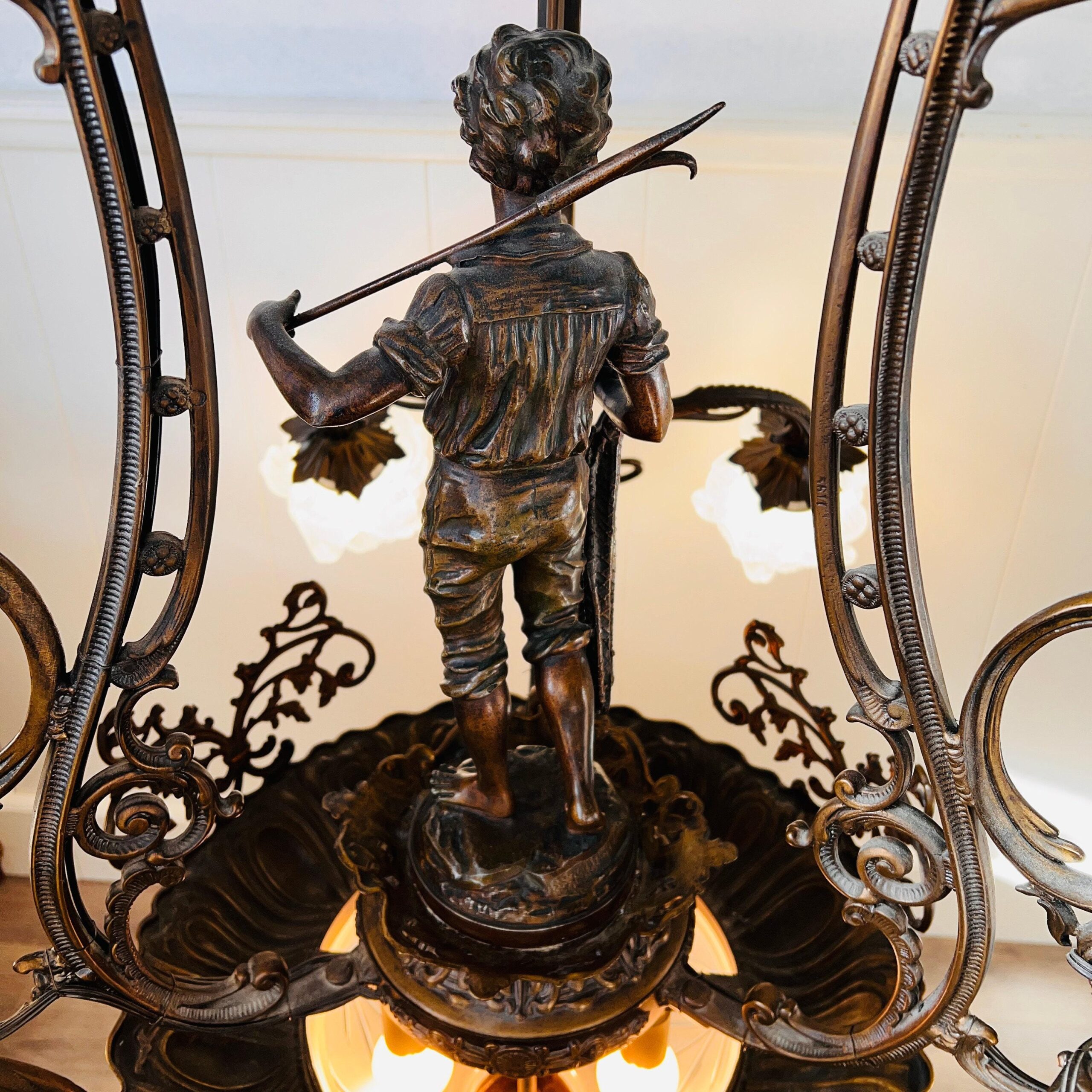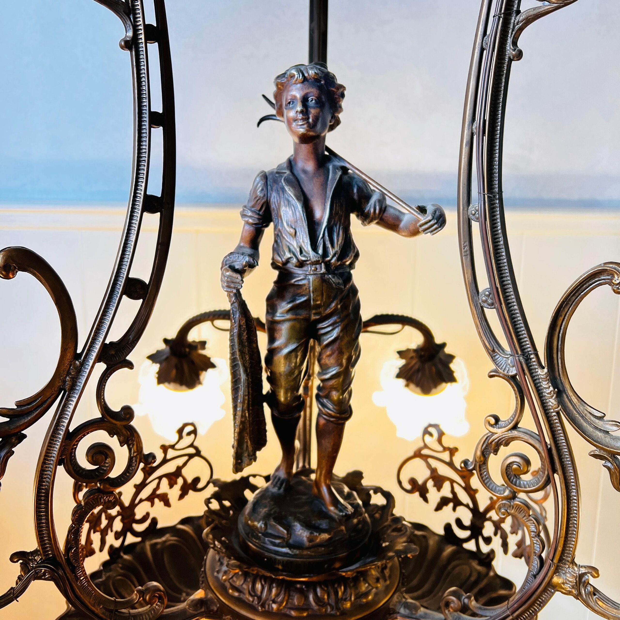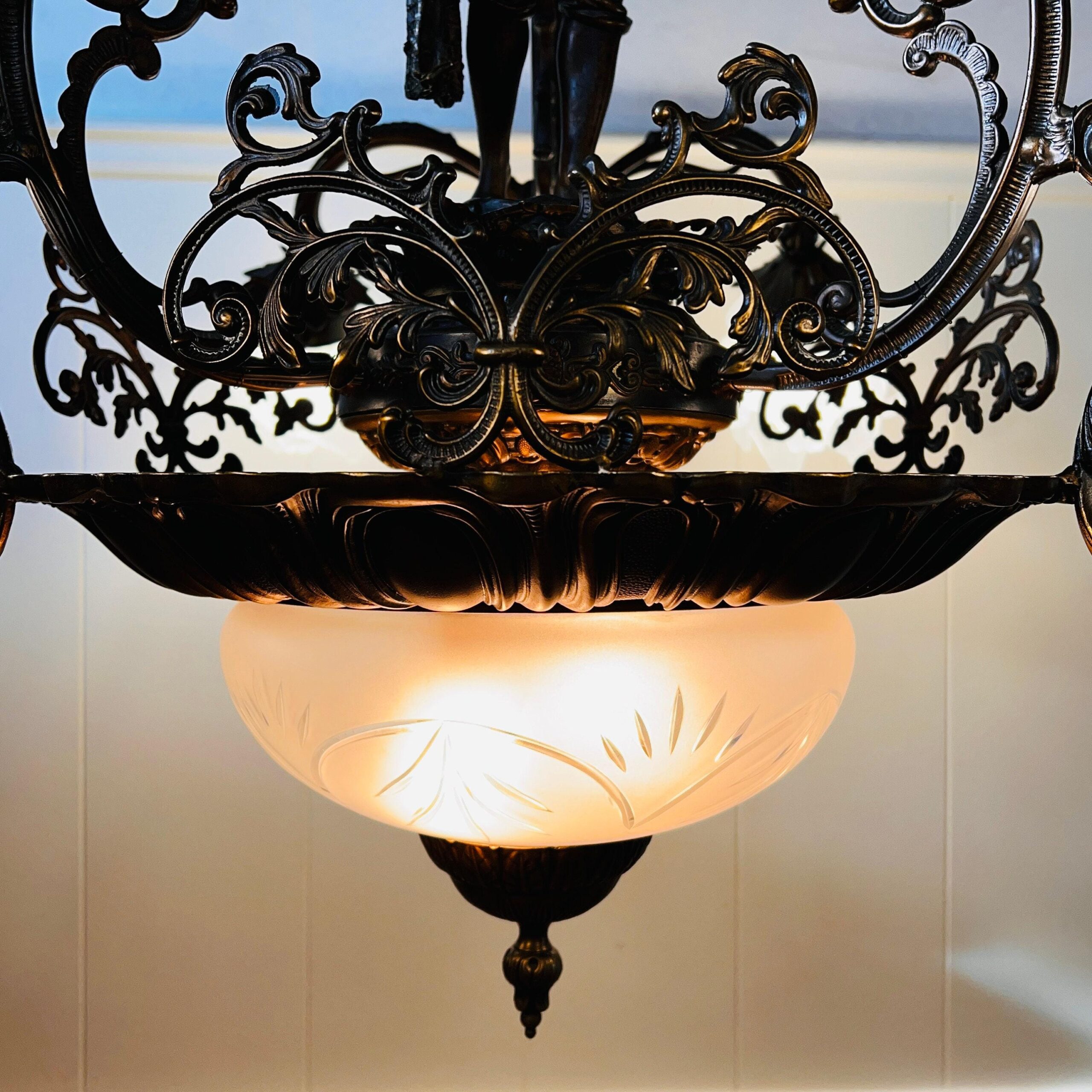 A rare tribute to form and function, this sculptural six-arm chandelier stuns with its intricate casting and maritime-inspired centerpiece. At its heart is a detailed "Départ de Pêche" (Departure for Fishing) relief, a classically inspired figurative motif based on the original work by E. Moisant. Cast in solid metal with a richly aged patina, it's more than a light fixture – it's a conversation piece for those who collect artistry in everyday objects.