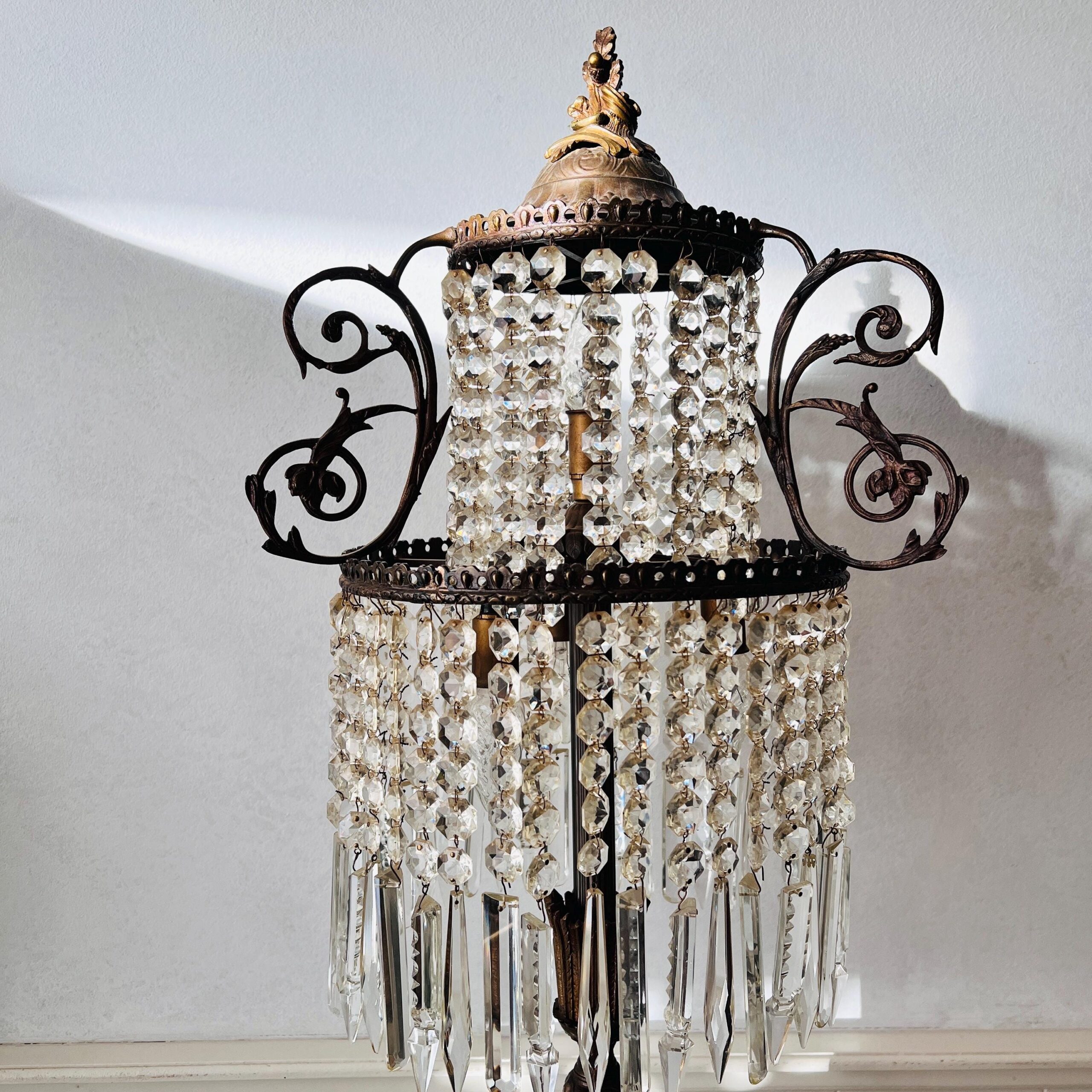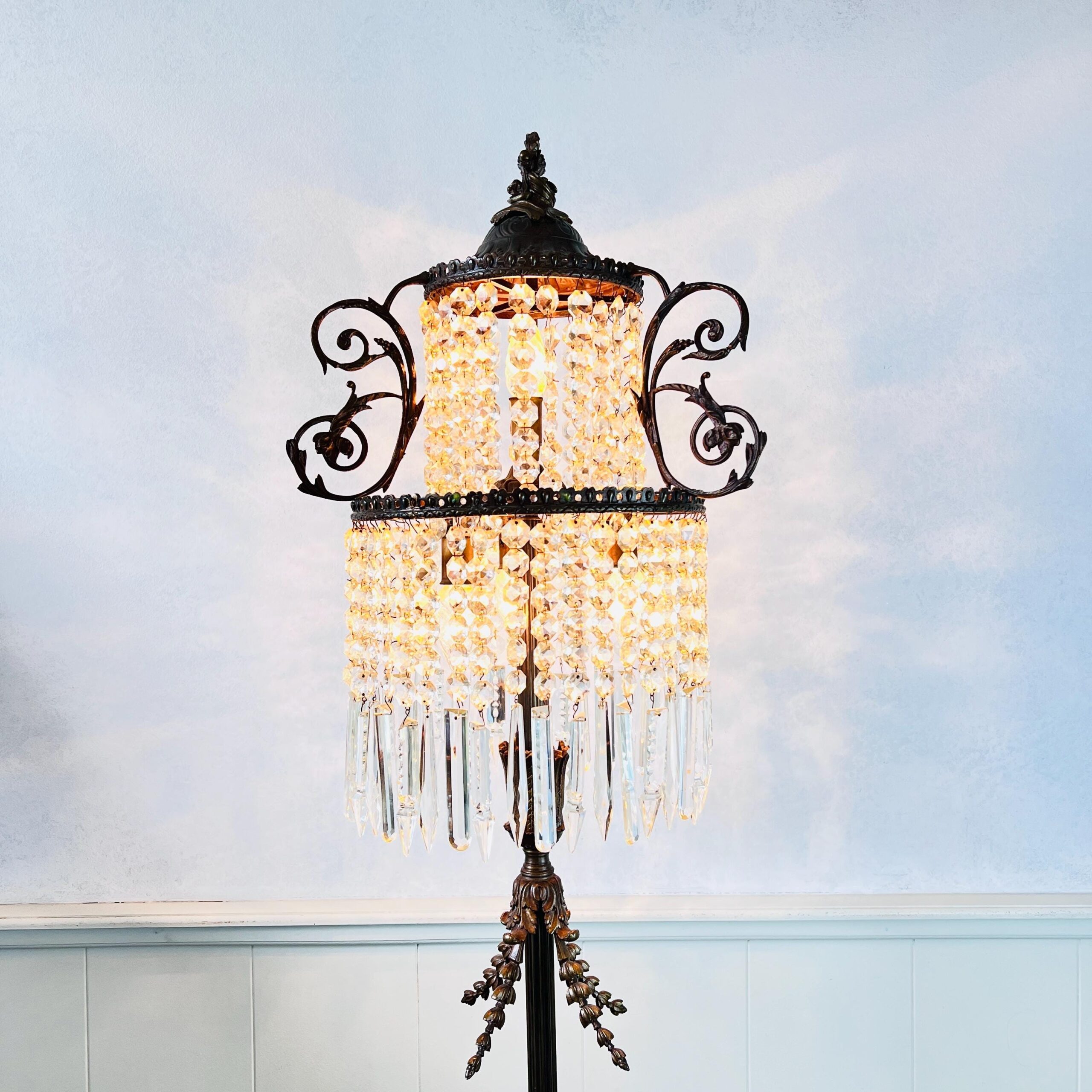 A captivating blend of refinement and glow, this freestanding floor lamp adds a regal note to your living space. With its classic Empire silhouette and cascading crystal prisms, it brings drama and delicate sparkle to any corner, from a vintage-inspired library to an elegant reading nook. The warm bronze-toned brass frame forms a stately base, while strands of faceted glass crystals catch light with every movement.