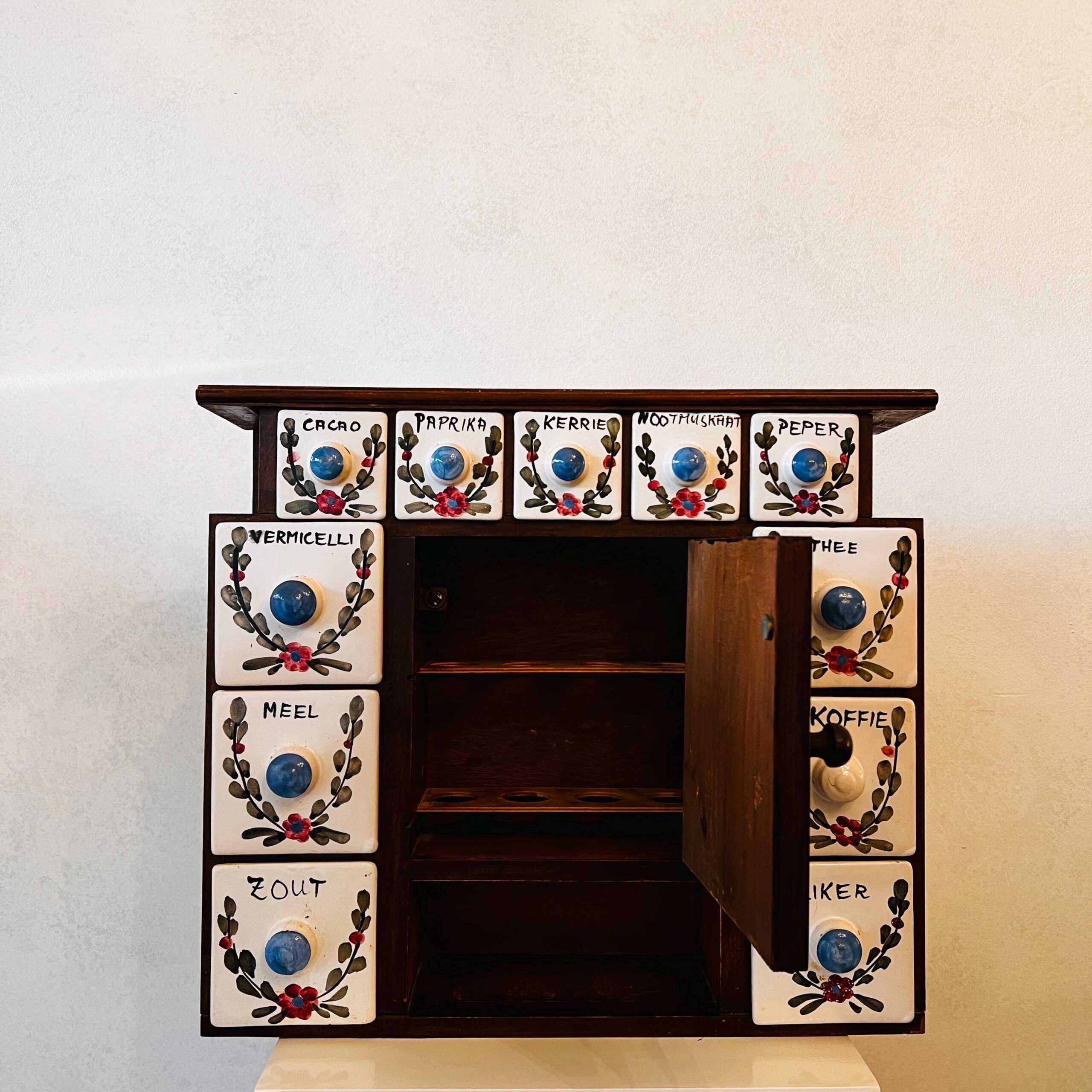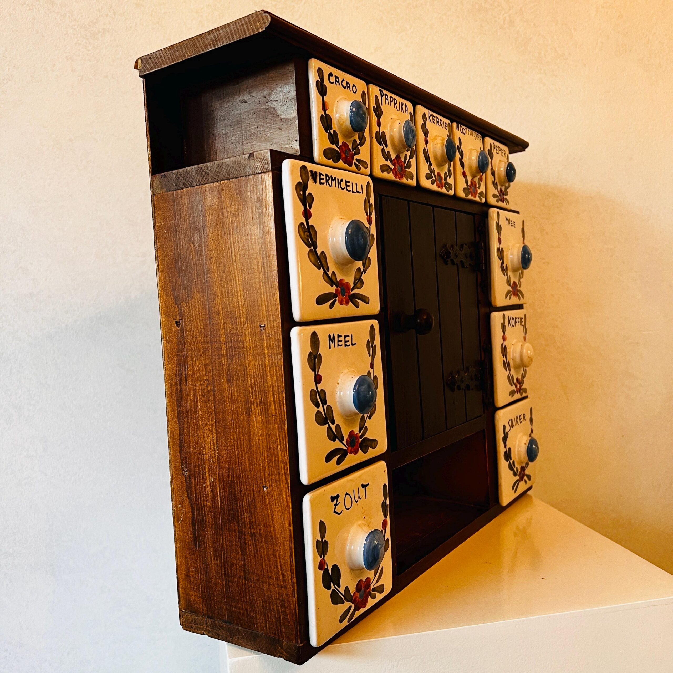 It has a solid wooden frame, and there are six large ceramic drawers and five smaller ceramic drawers. All have decorations and labels for spices in black Dutch language. ( can be re-written over)