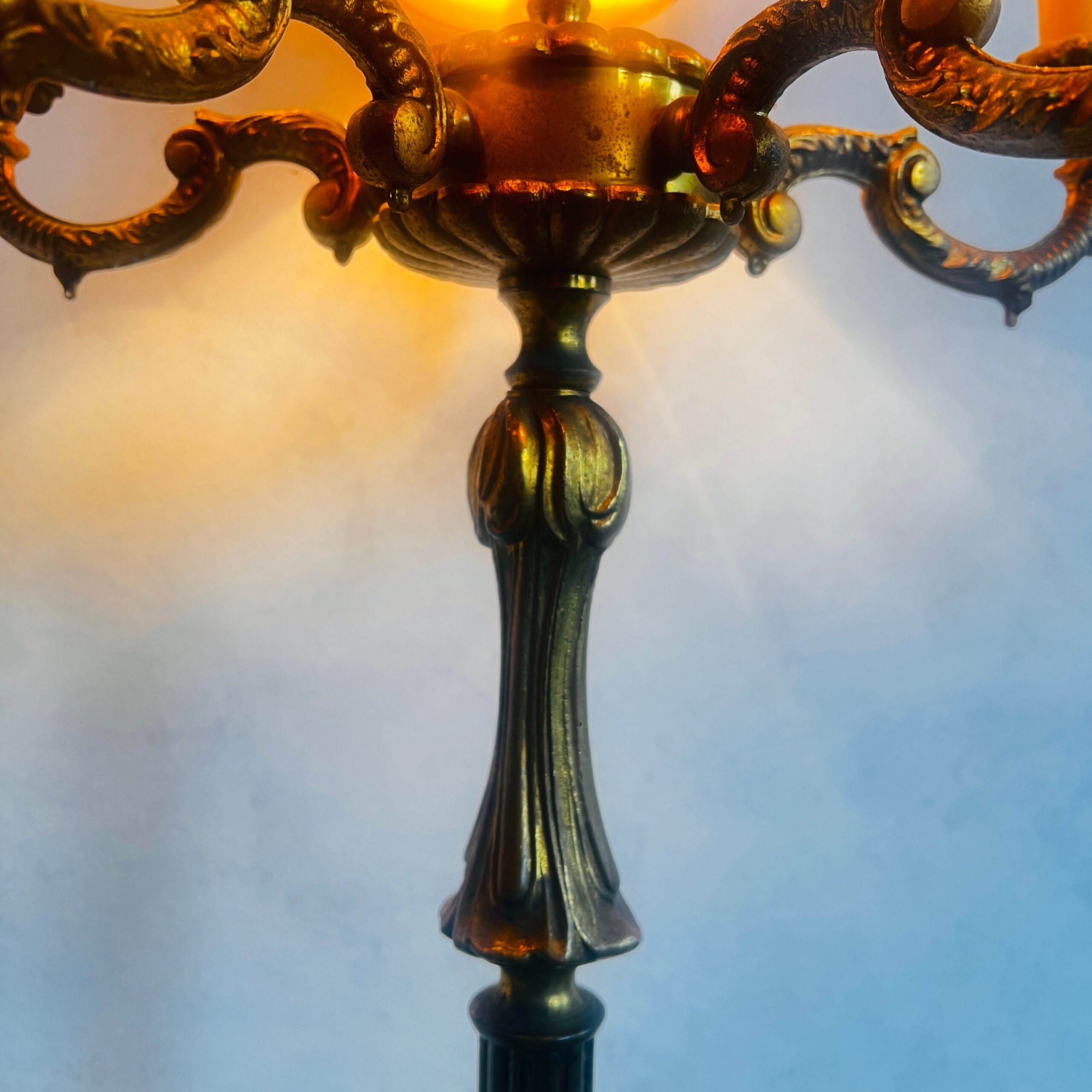 Commanding yet refined, this stately Victorian-style floor lamp radiates old-world elegance. Crafted from bronze-toned brass, it features five graceful upward-facing lights and intricate detailing that adds a sense of historic charm to any traditional or vintage-inspired interior. Whether placed beside a reading chair or gracing the corner of a formal sitting room, this antique standing lamp offers timeless sophistication with a warm glow.