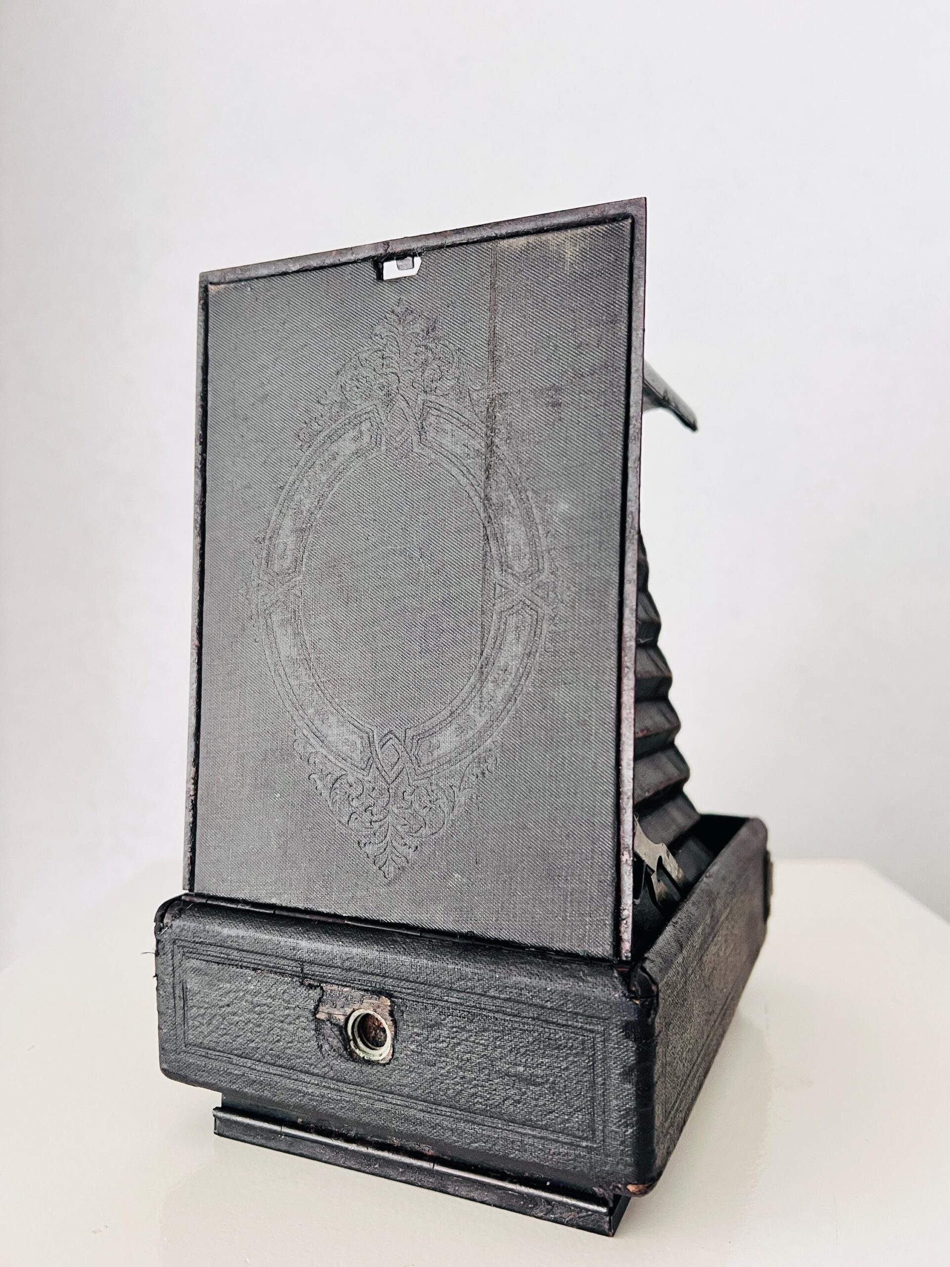 This rare antique folding camera is a striking testament to early 20th-century craftsmanship and optical innovation. Crafted from a combination of solid wood and metal, the body is wrapped in textured black covering, with delicately embossed patterns that hint at its refined heritage.