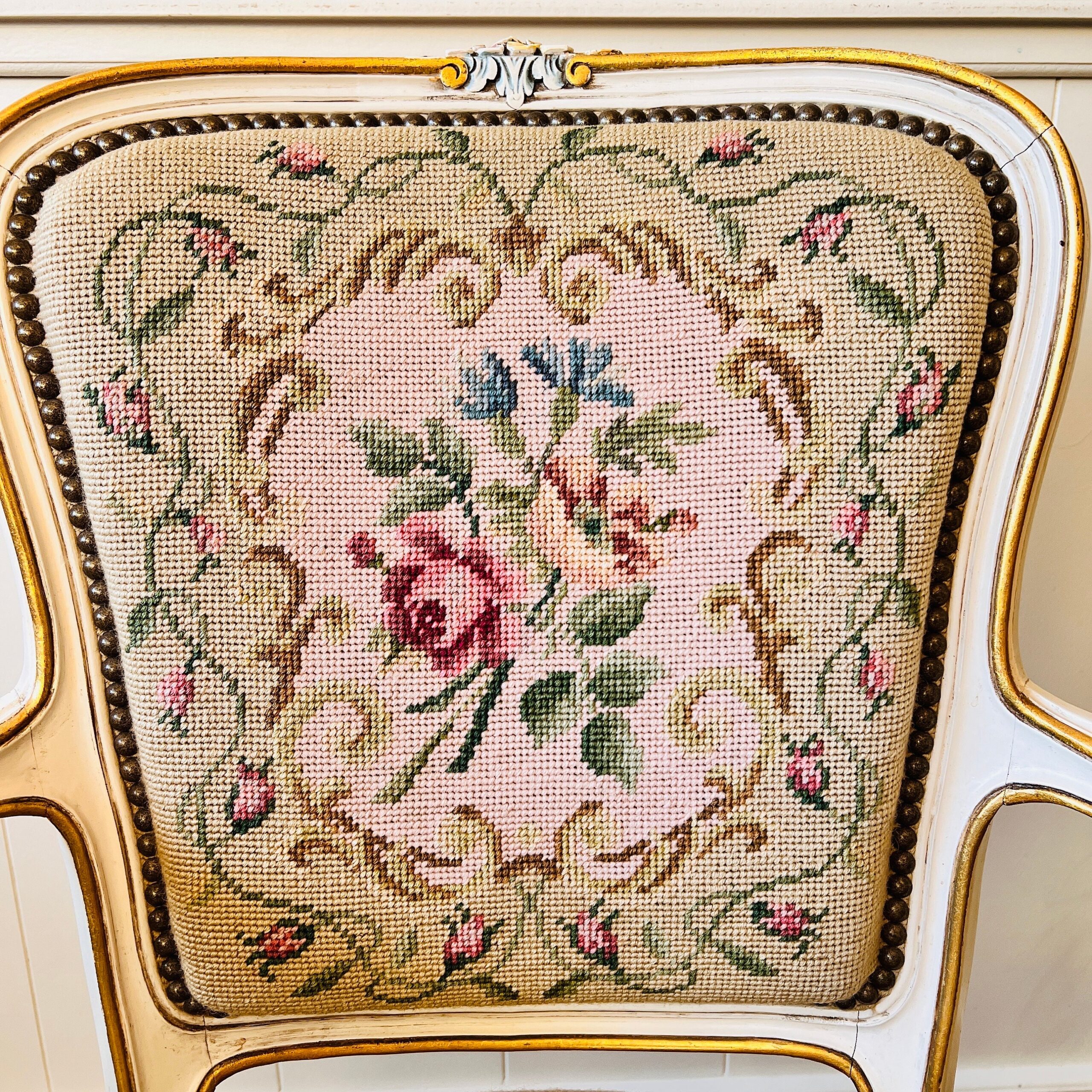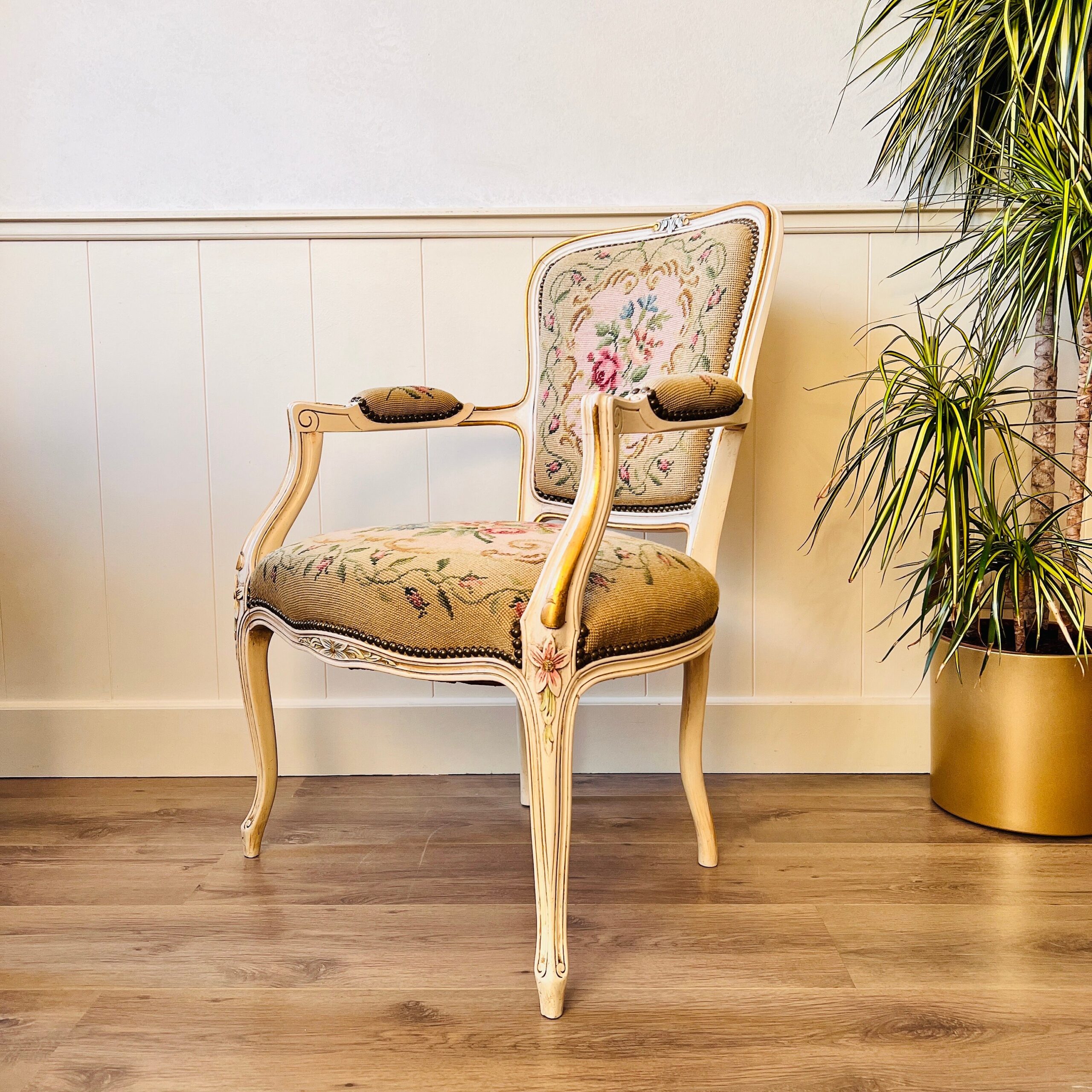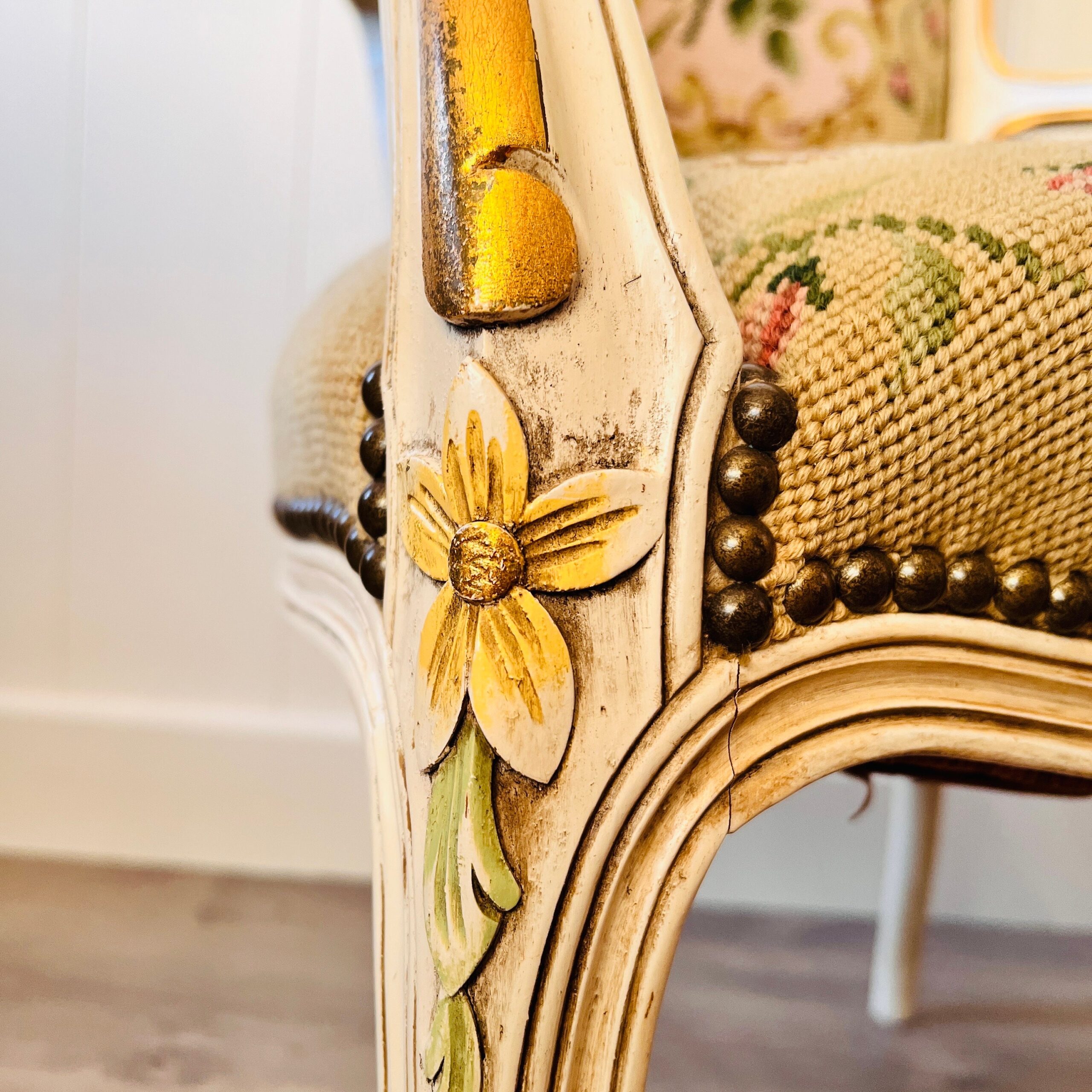 French Louis XV Style Armchair – Gold Gilt Details, Tapestry Upholstery, Circa 1920