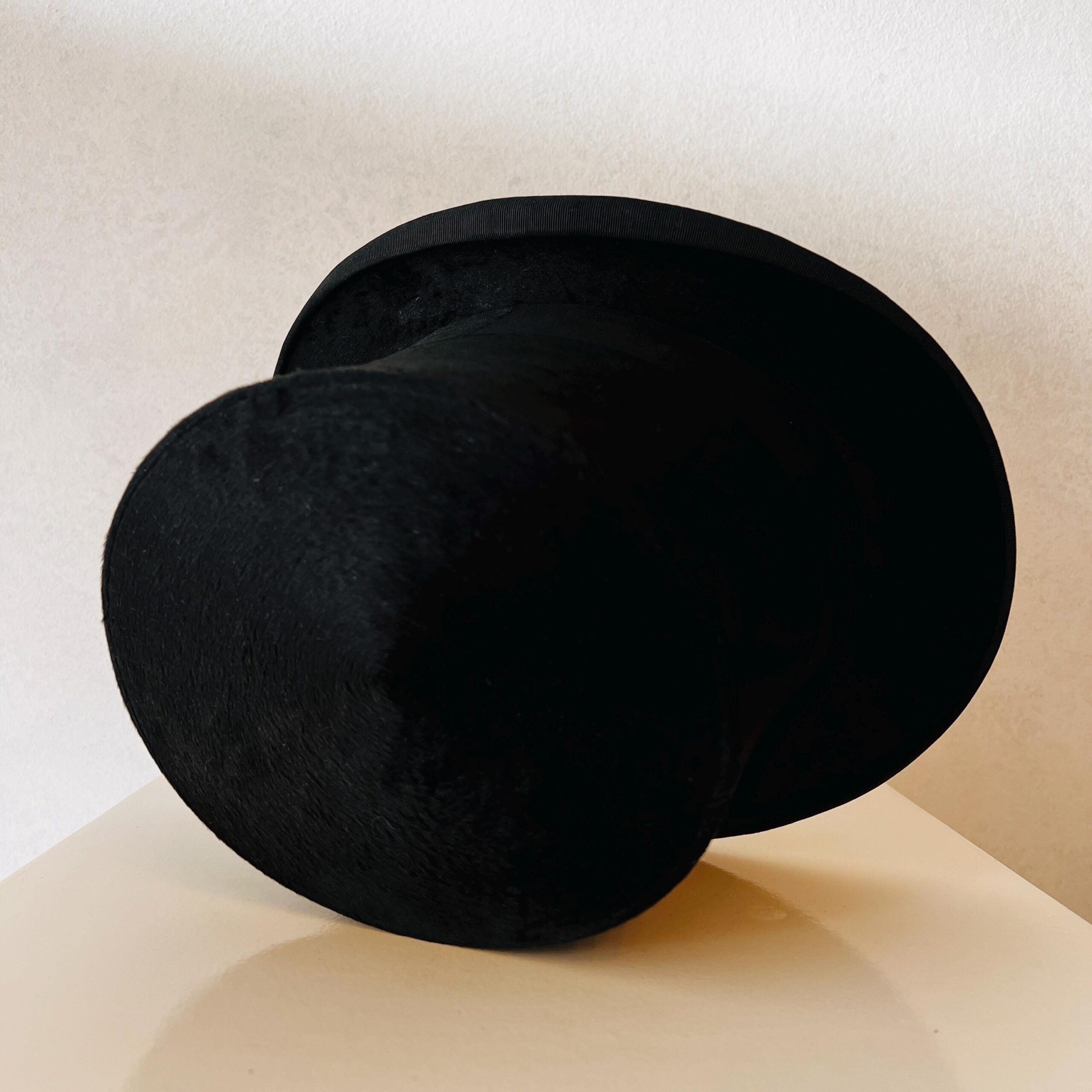 A refined symbol of past elegance, this vintage ladies’ silk top hat exudes sophistication. Sleek black silk with a gentle sheen gives it timeless appeal, whether displayed in a fashion collection, used as a photography prop, or worn for reenactments and costume events. Its classic shape reflects early 20th-century millinery traditions, tailored with poise and purpose.