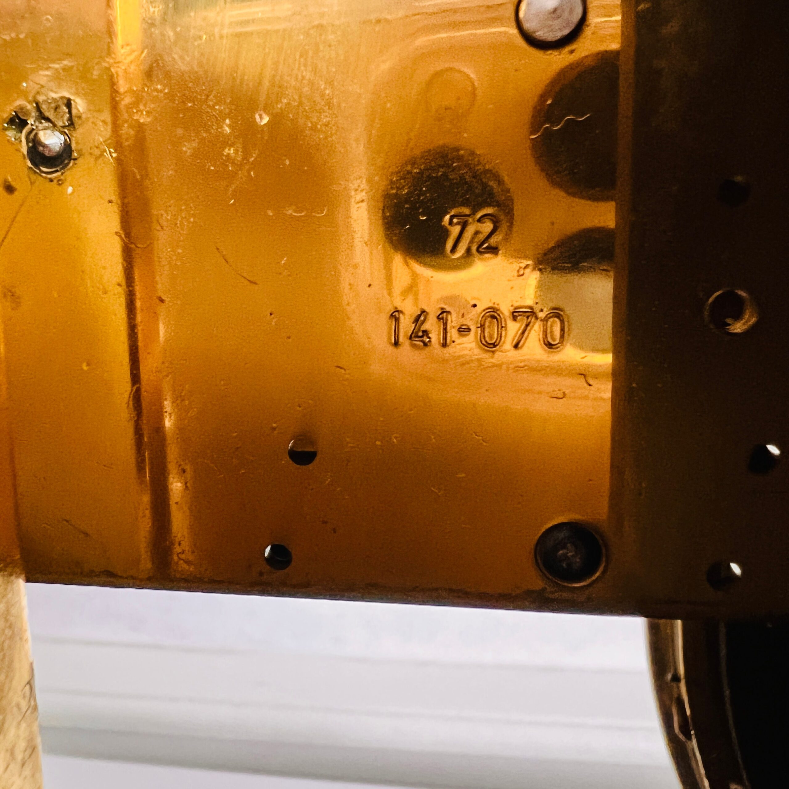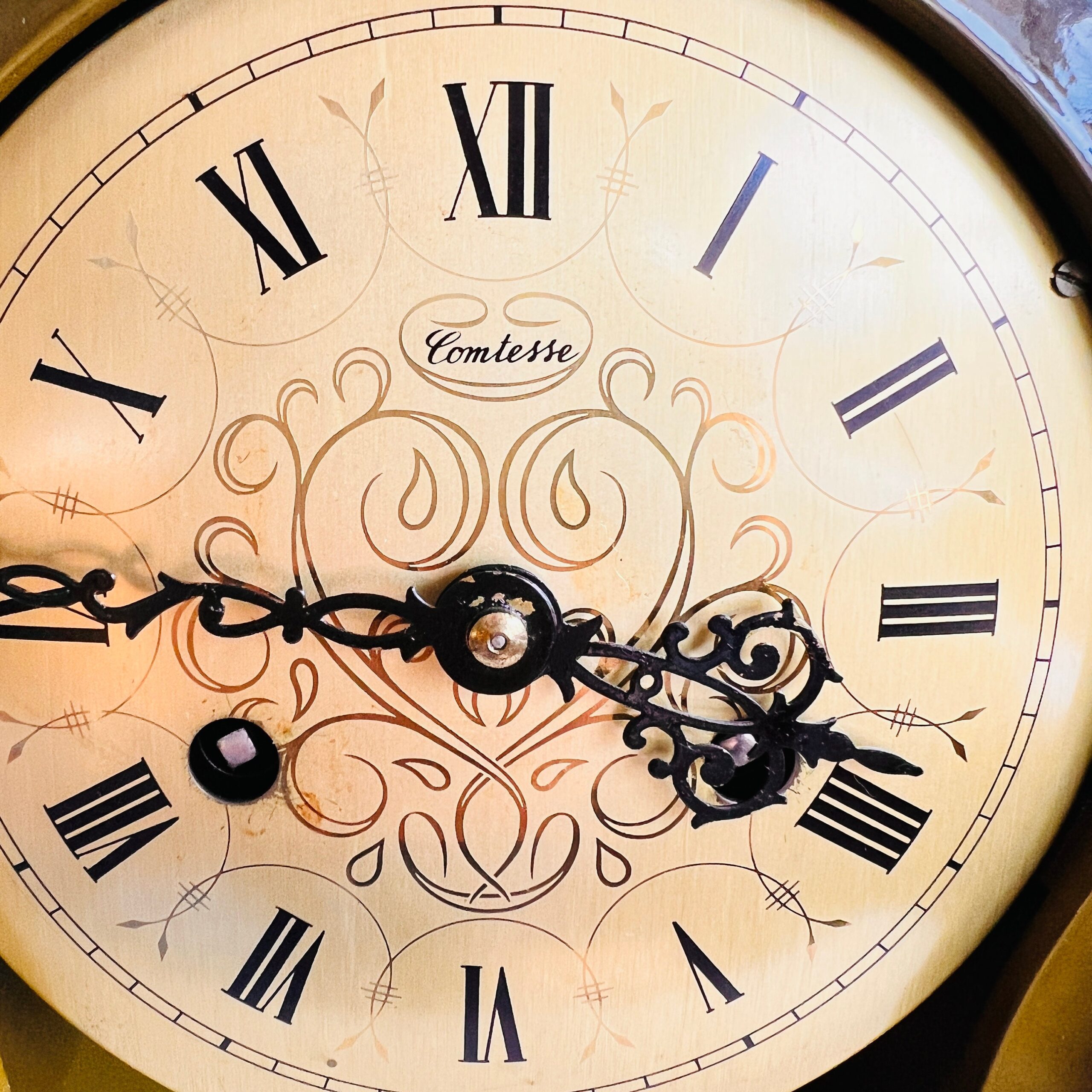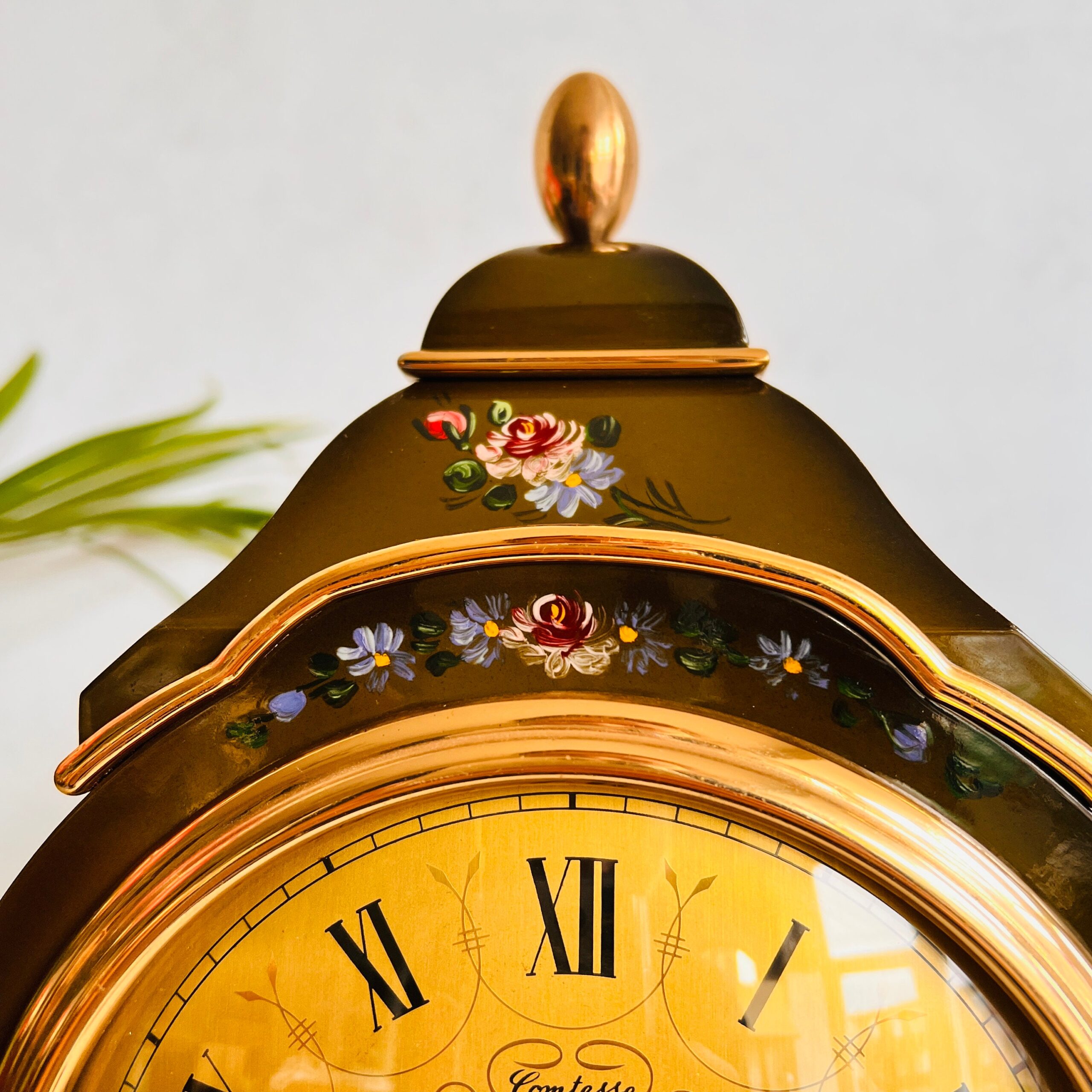 Crisp lines and gold-toned elegance meet in this Comtesse mantel clock, designed with both structure and softness in mind. Its bracket frame and gently domed glass offer a graceful nod to midcentury formality, complete with a center-swinging pendulum that adds quiet rhythm to your space – visually and audibly. Ideal on a fireplace mantel, bookshelf, or dresser, it’s a refined vintage timepiece with enduring charm.