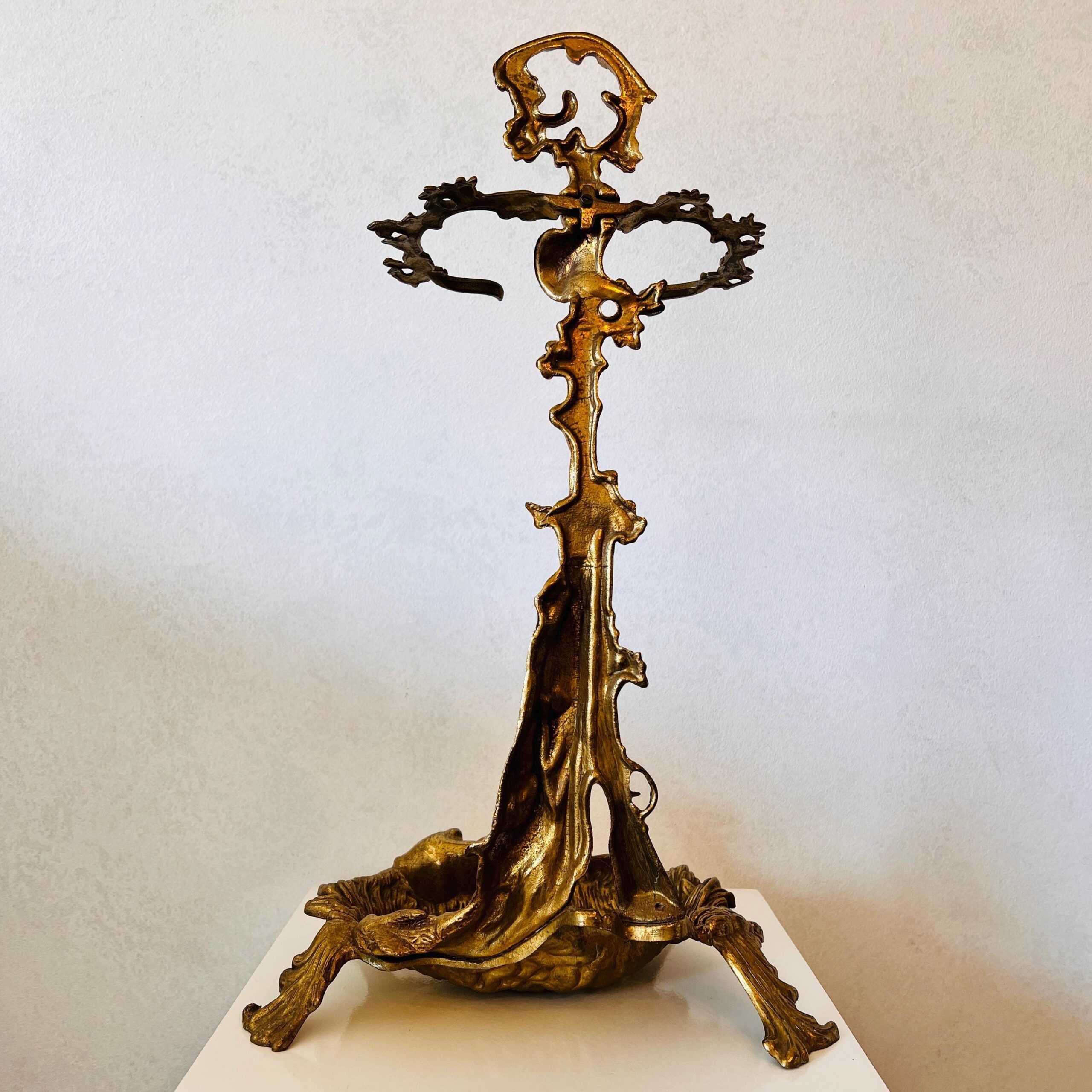 Sleek and sculptural with a golden gleam, this vintage brass stand brings function and elegance together. Originally designed as an umbrella or cane holder, it also doubles beautifully as a fireplace tool caddy, adding a refined vintage touch to your entryway or hearthside nook.