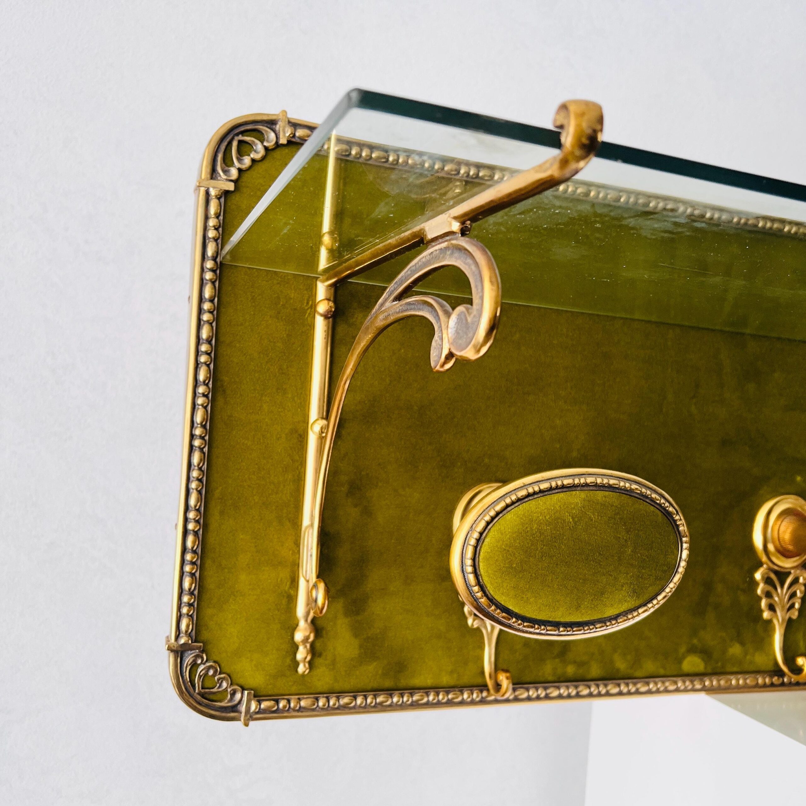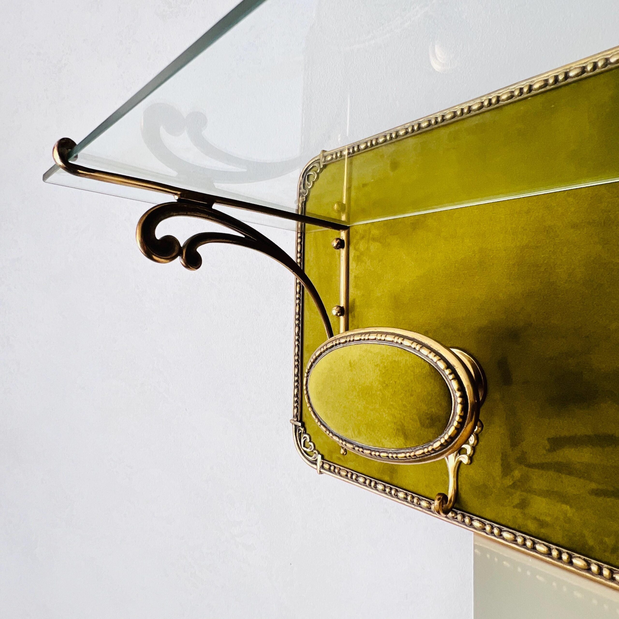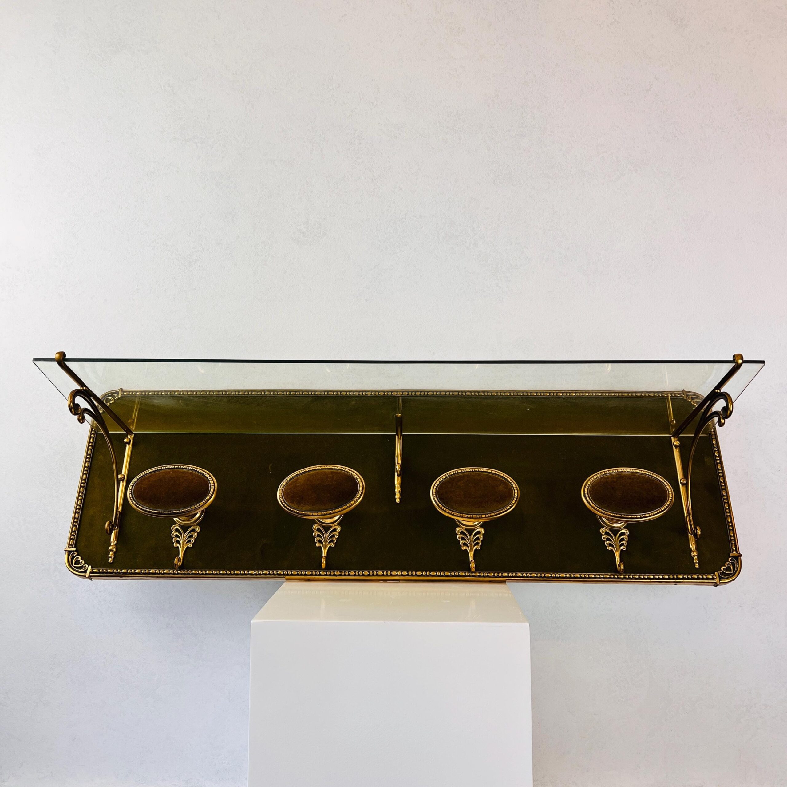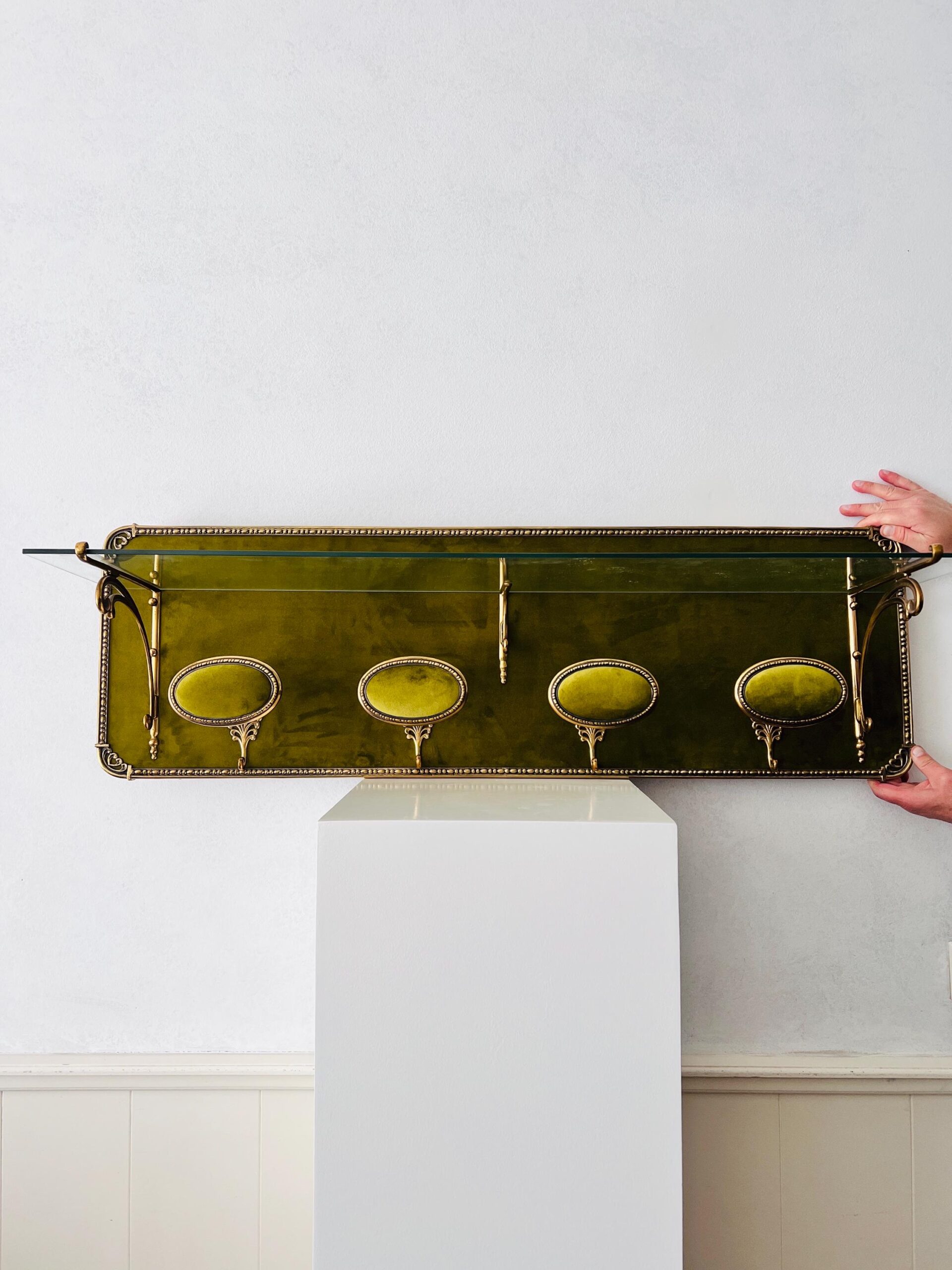 Lustrous and sculptural, this brass-toned wall-mounted coat rack brings instant mid-century character with a nod to glam Hollywood Regency style. Its seven curved arms cradle coats, scarves, or handbags with ease, while its upper glass shelf lends an elegant presence to any hallway, mudroom, or vintage interiors space. Perfect for those who want form and function with golden charm.