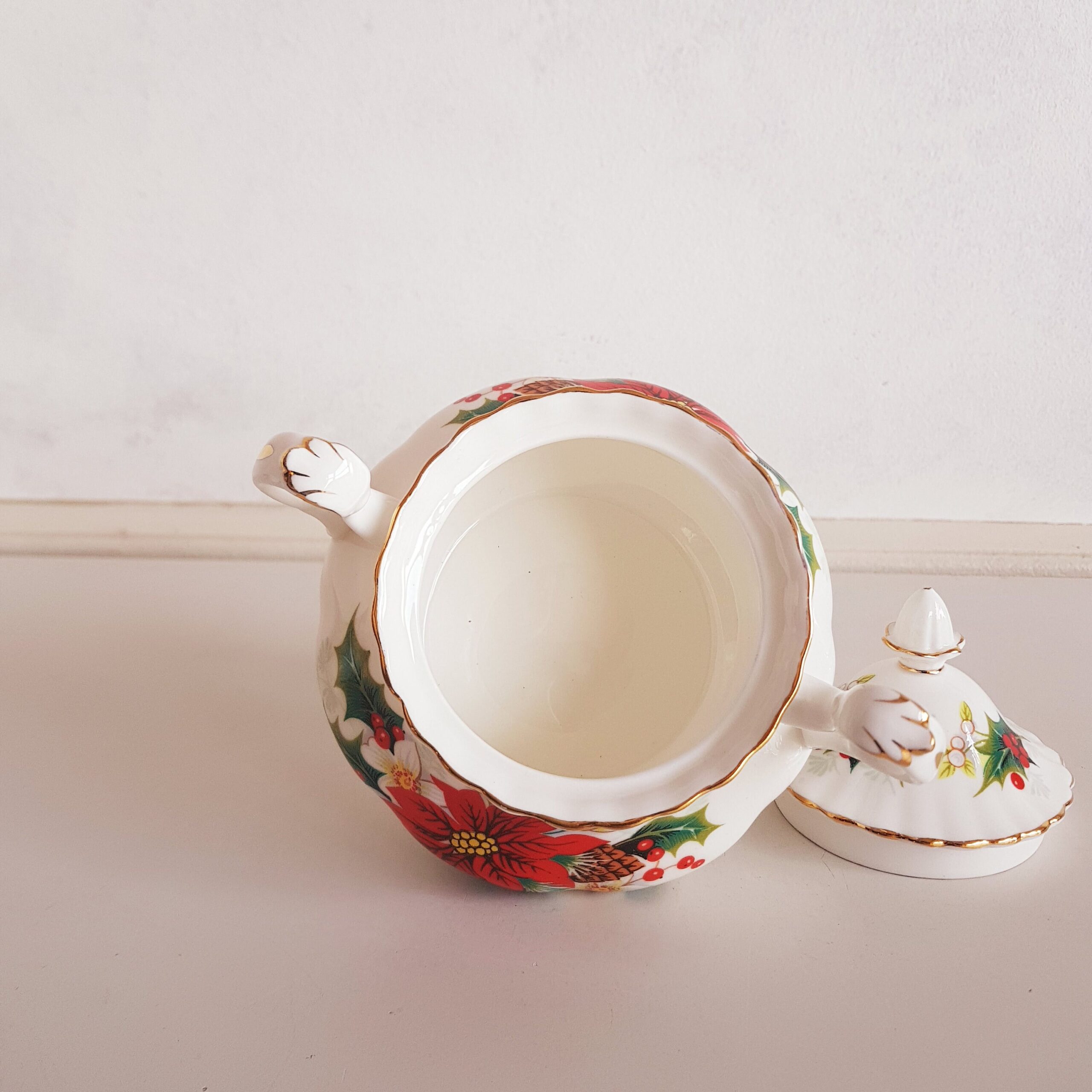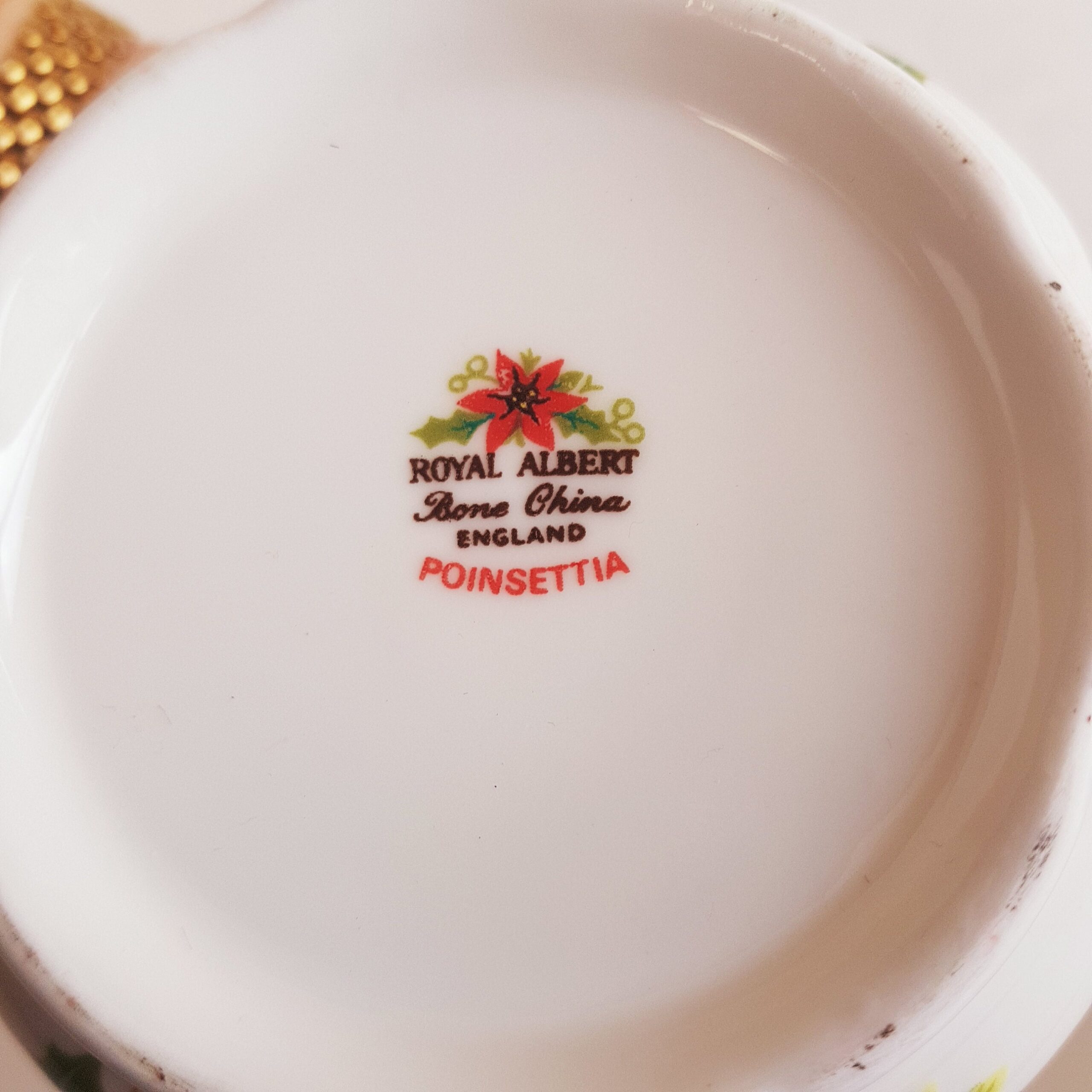 A festive touch for your holiday table, this Royal Albert bone china creamer and sugar bowl set features the classic Poinsettia pattern in warm red and green. The elegant floral motif, lush gold detailing, and graceful design make it a nostalgic favorite for collectors or those who cherish traditional Christmas tea service. Style it alongside evergreen sprigs or vintage glassware for a cozy December moment filled with charm.