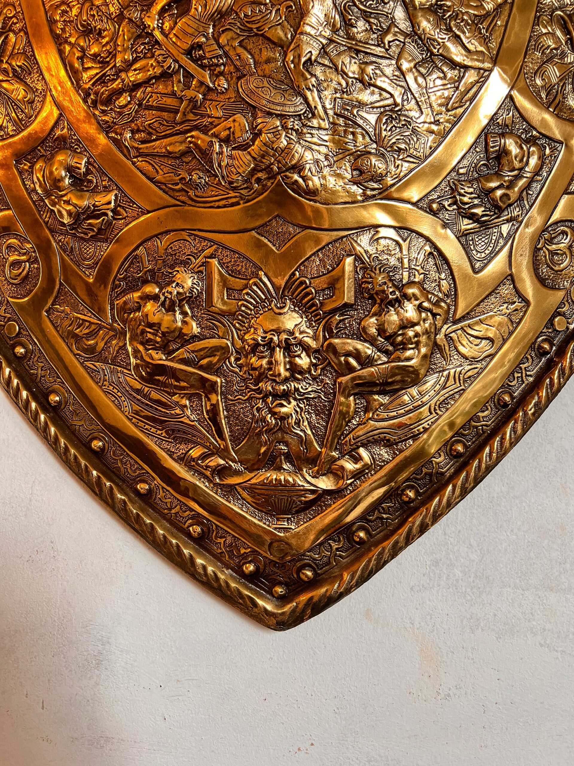 • Materials: pressed copper with brass detailing, metal backing, riveted elements