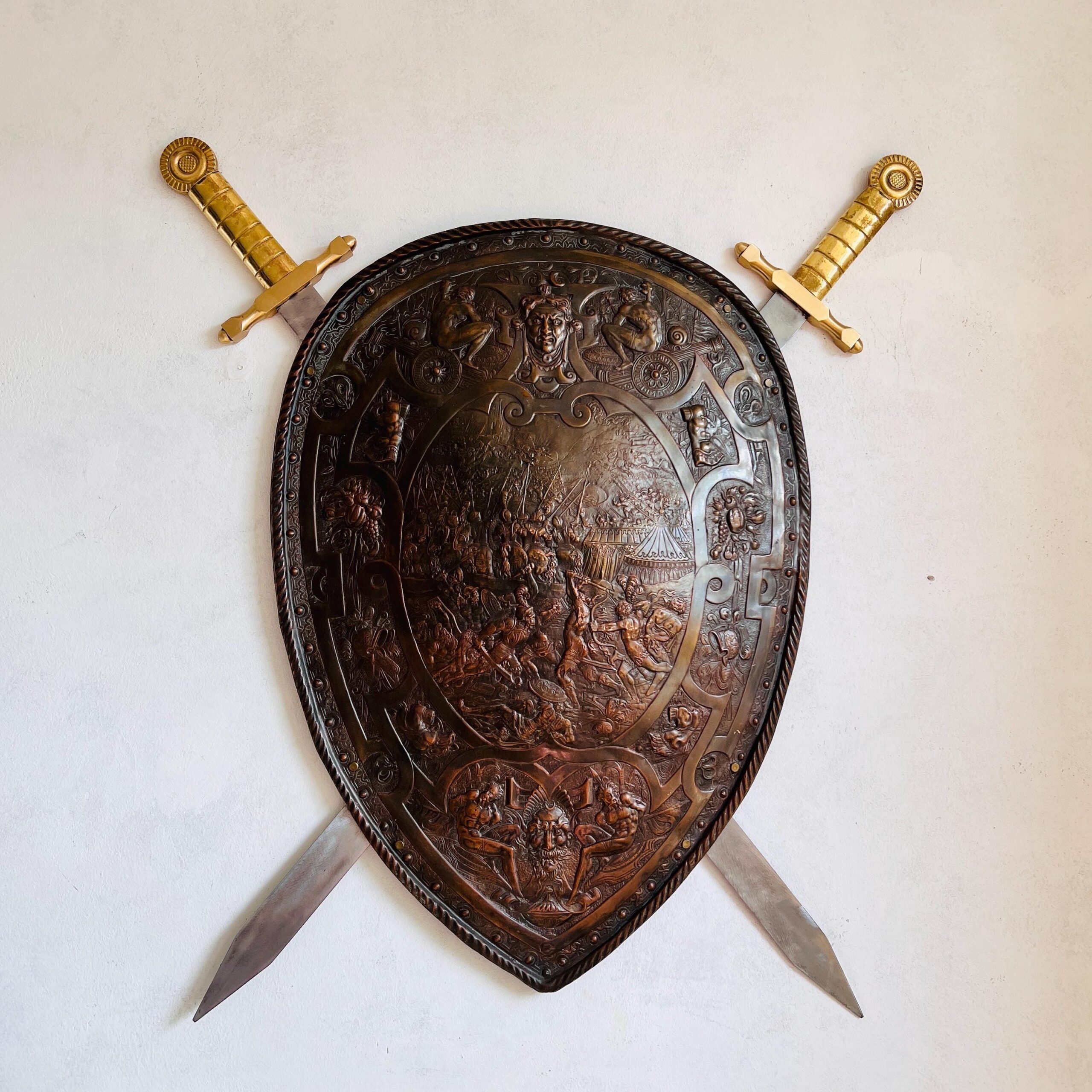 Copper & Brass Wall Shield with Crossed Swords – Vintage Wall Decor