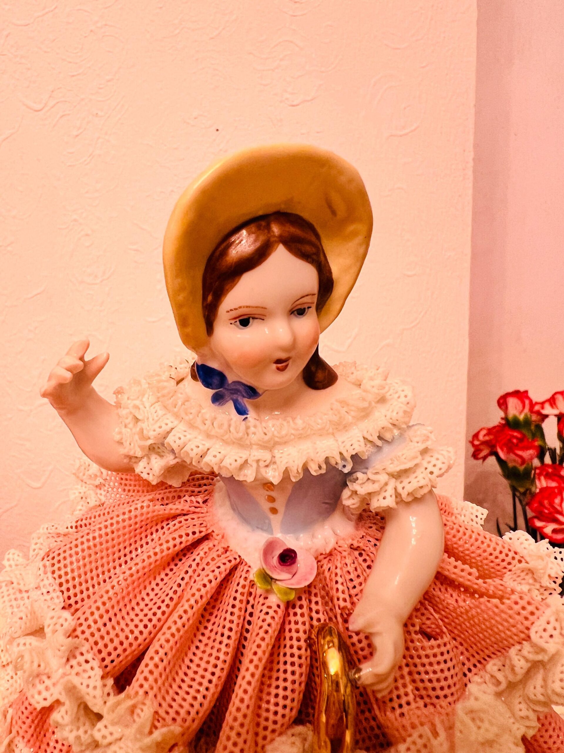 Delicate and timeless, this Dresden lace porcelain figurine captures the elegance of Rococo revival with its ornate detail and romantic expression. An exquisite piece for collectors and lovers of fine European porcelain, it radiates the refined craftsmanship Dresden is known for – from the carefully sculpted folds of lace to the expressive, hand-detailed features. Place it on a mirrored tray, a vanity, or within a curio cabinet to let its intricate charm shine through.