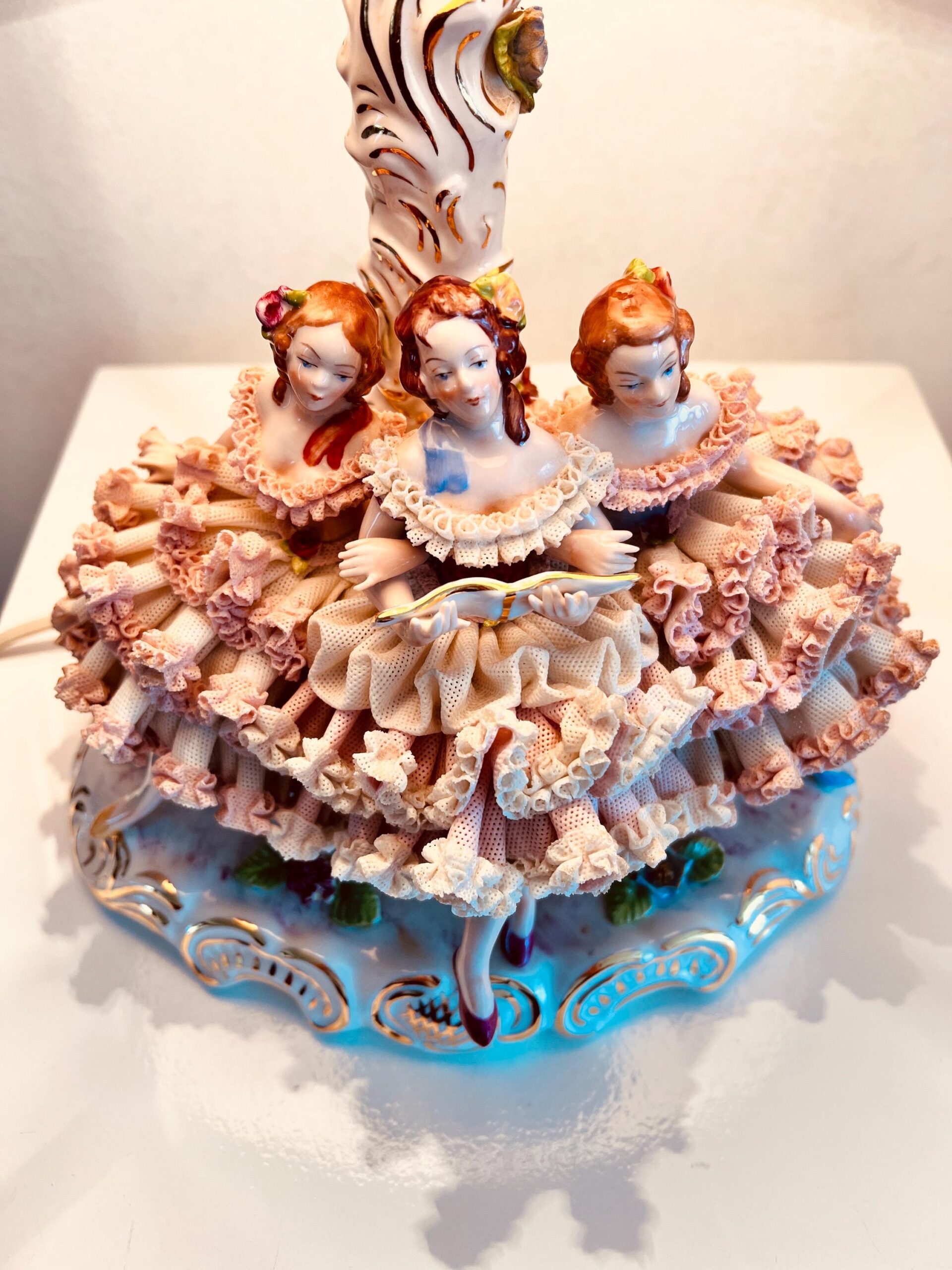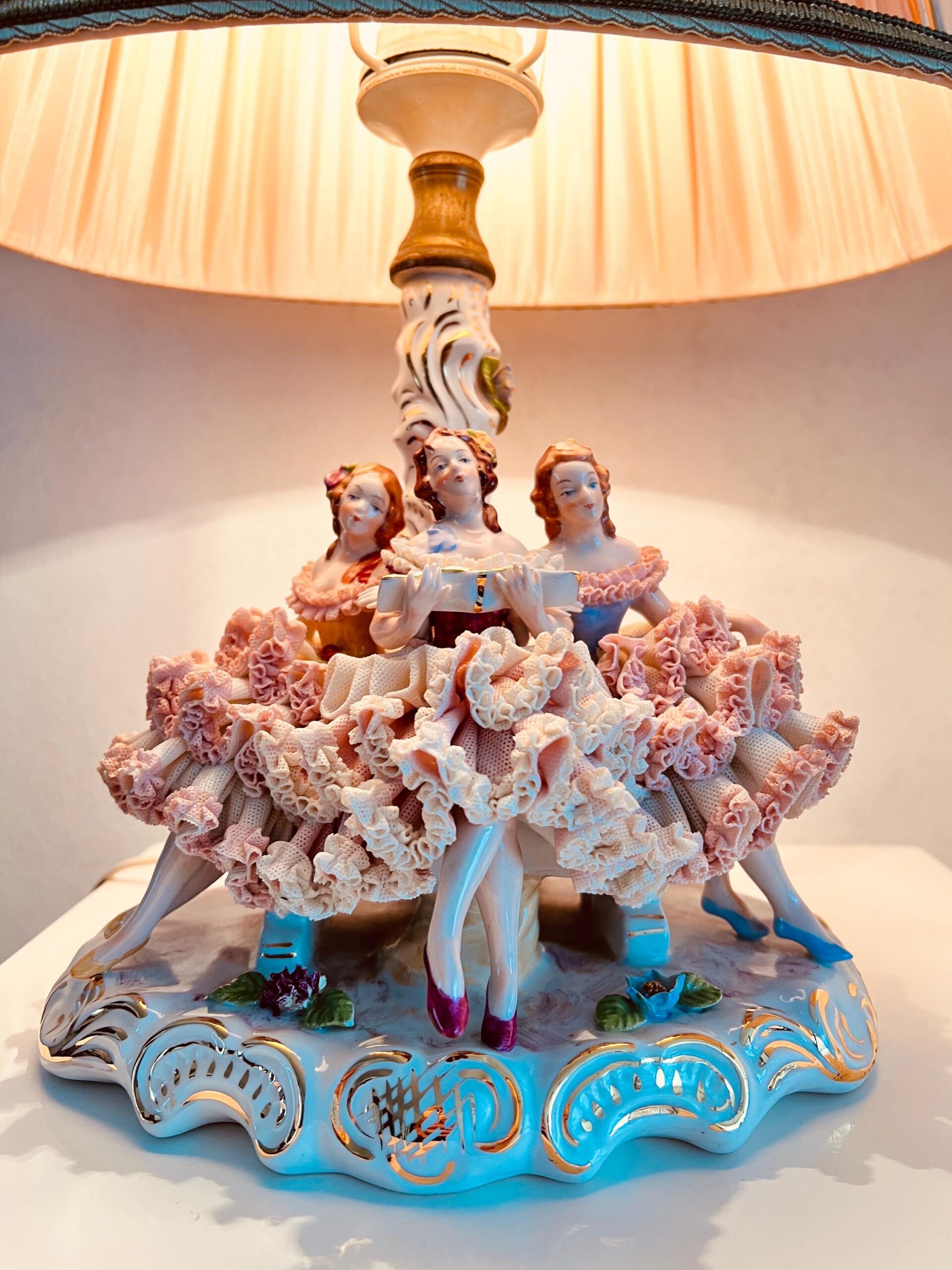Delicate and filled with charm, this Crown Dresden lace porcelain lamp turns any room into a moment of elegance. Three finely sculpted ballerina-inspired figures form the base, adorned in layered lace skirts and soft pastel hues. A rare collectible, this lamp isn’t just functional lighting – it’s a story captured in porcelain and gilt.