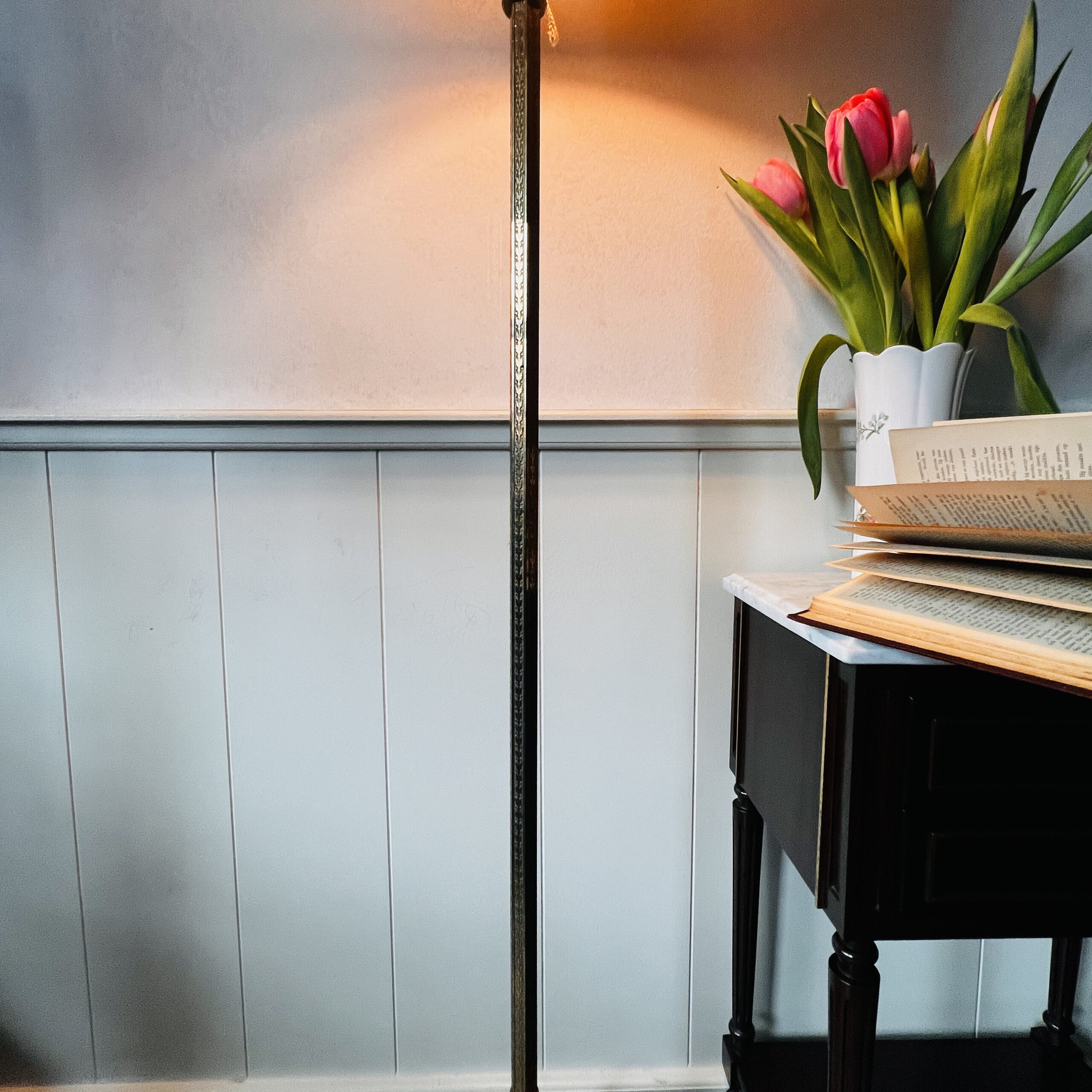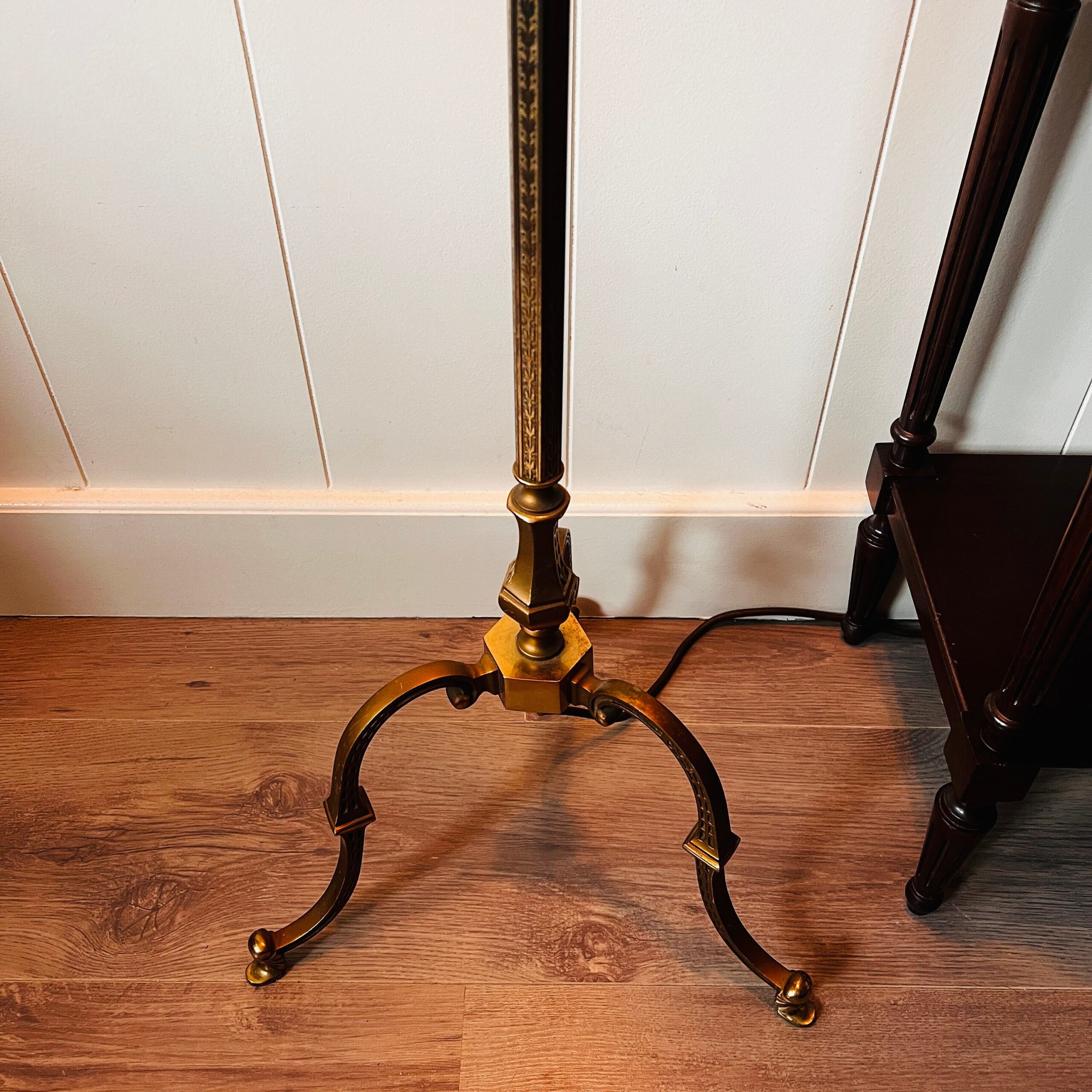 A beautiful, elegant floor lamp, Art Deco style, stand lamp made of bronze/brass with 2 lights and an elegant lampshade. The bulb’s light is alternating when opened.