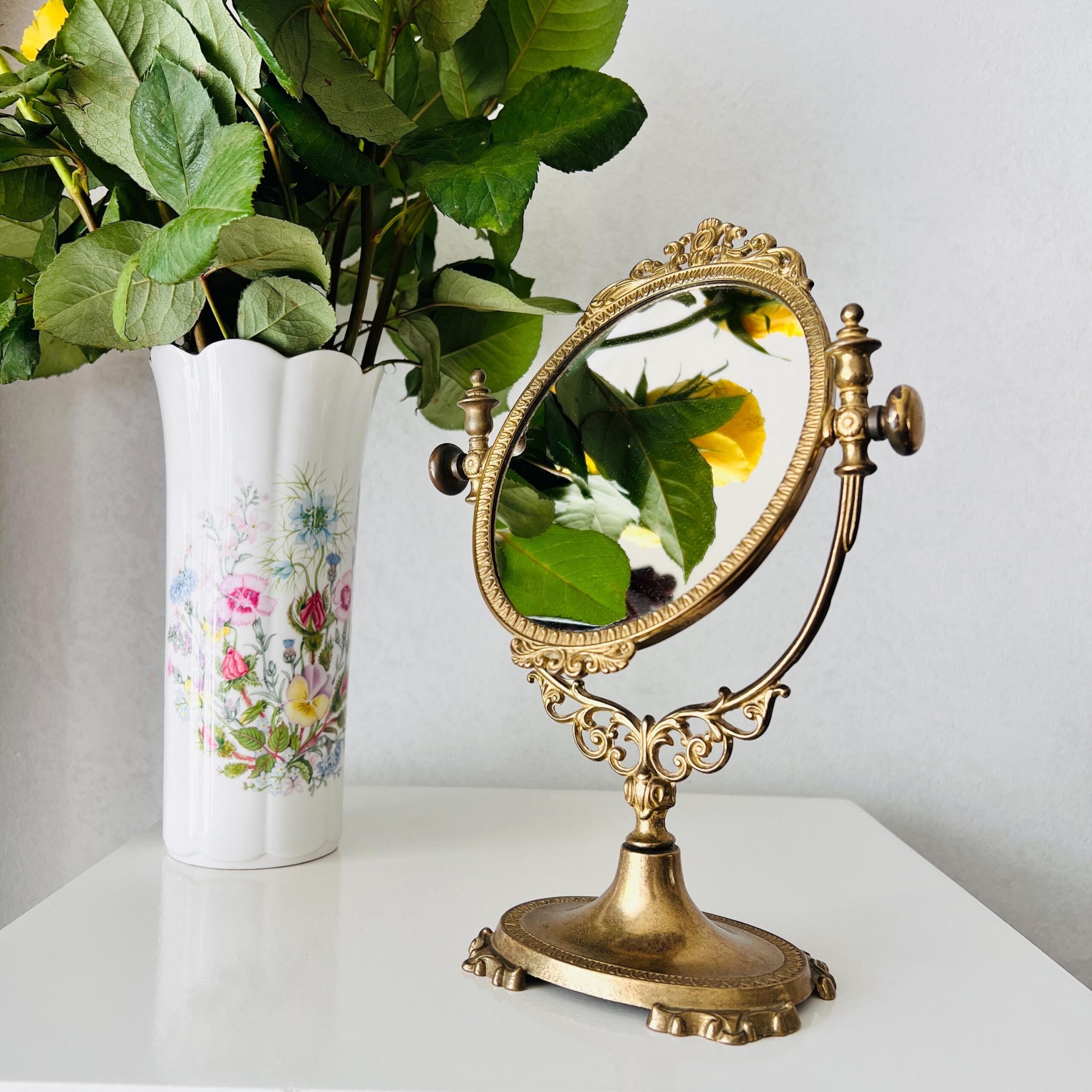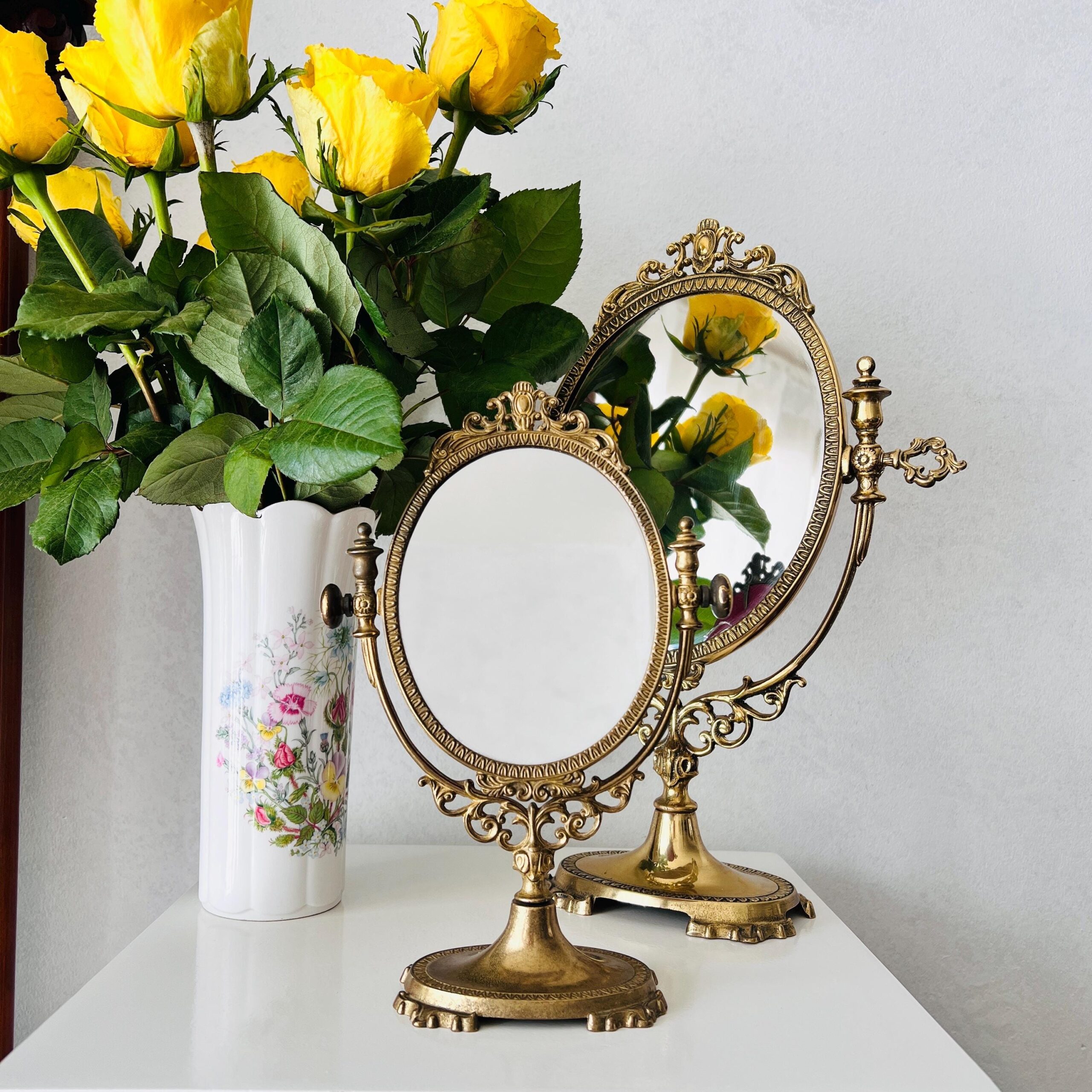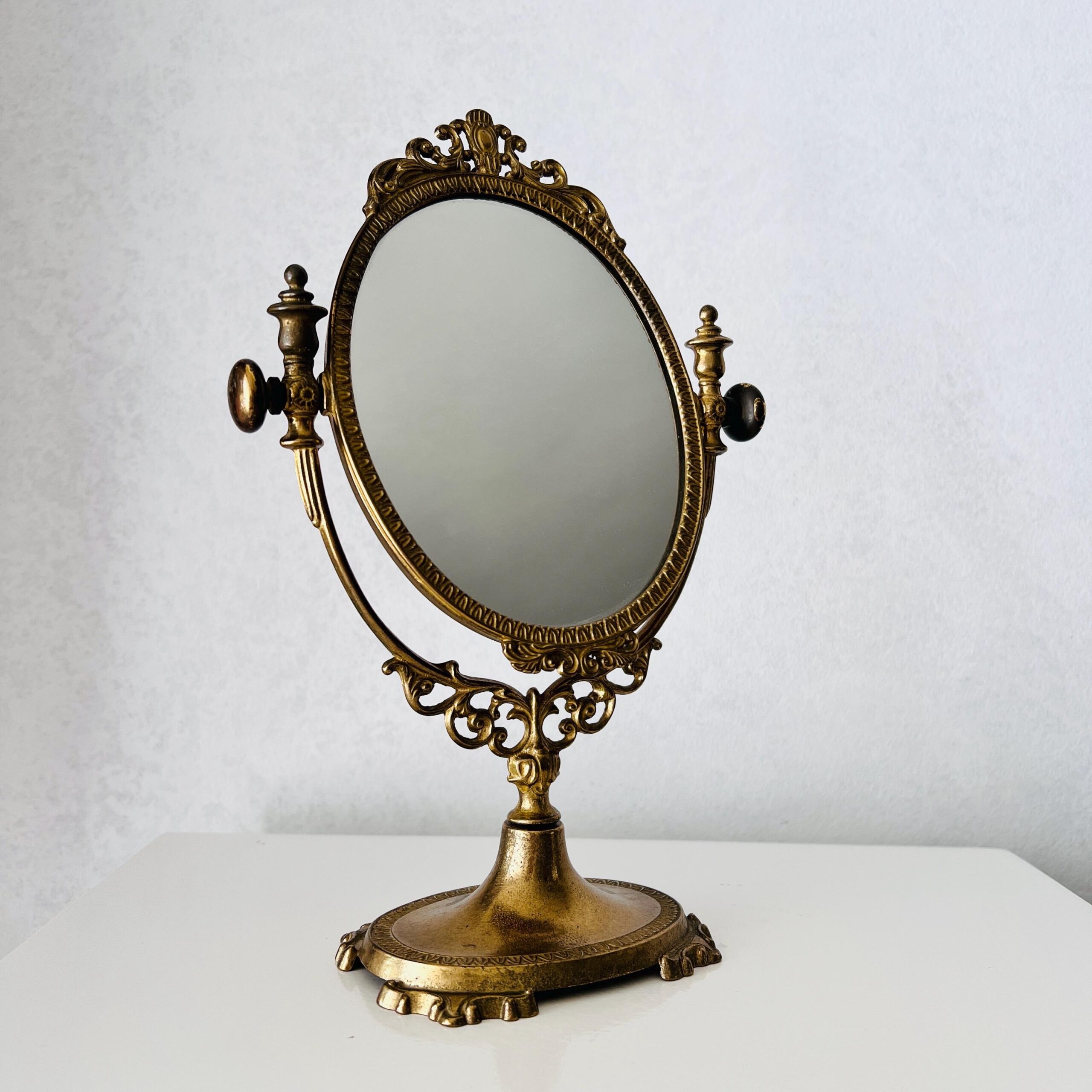 With a beautiful age, an authentic patina that is highlighting the ornate details, this is the perfect makeup mirror, has pivots in the middle, and can turn 180 degrees to achieve the perfect angle and light.