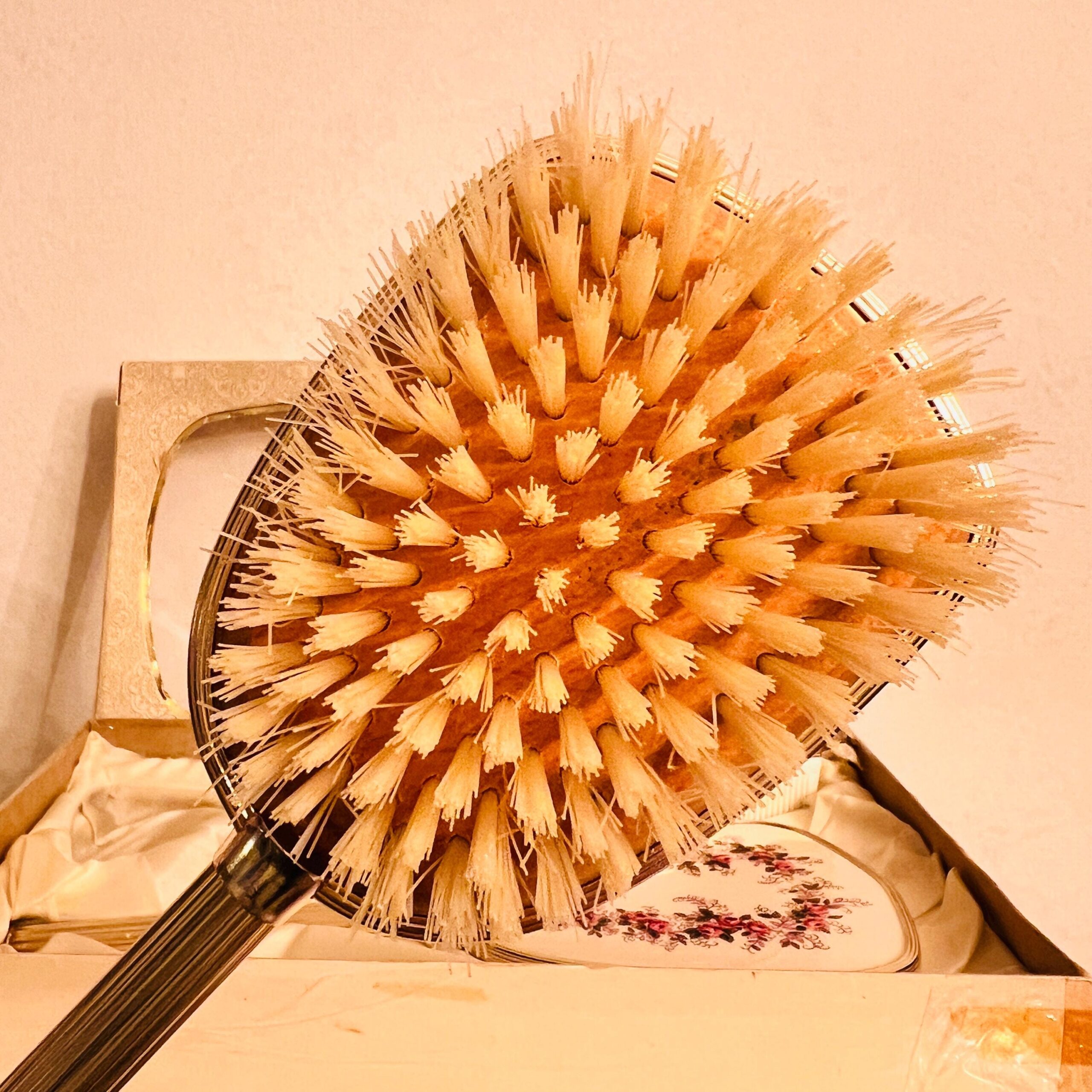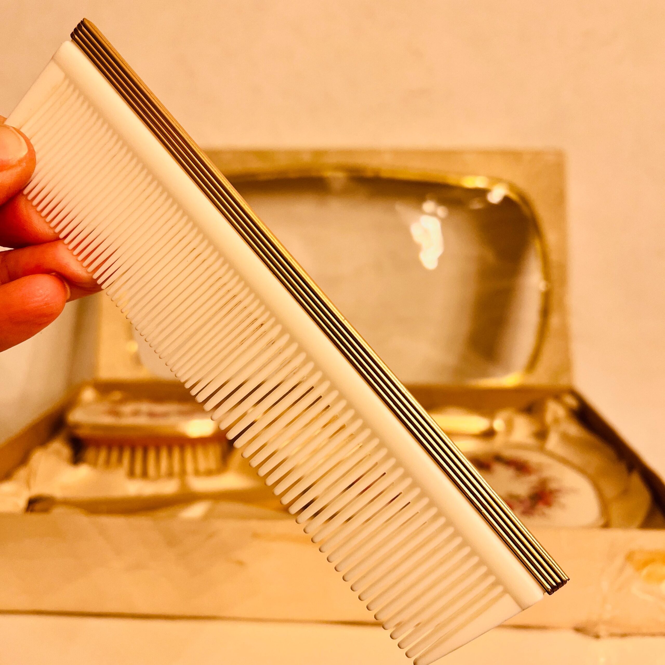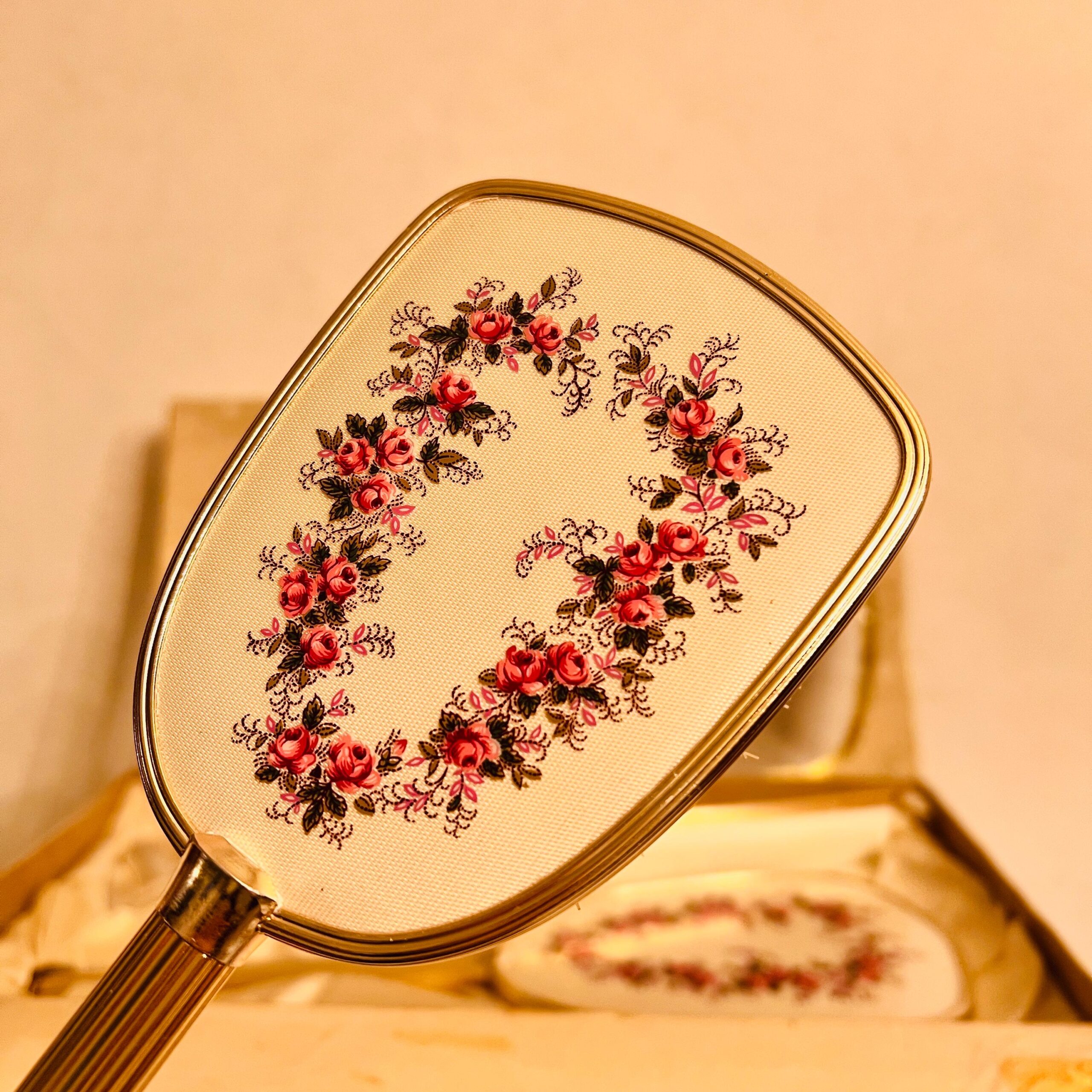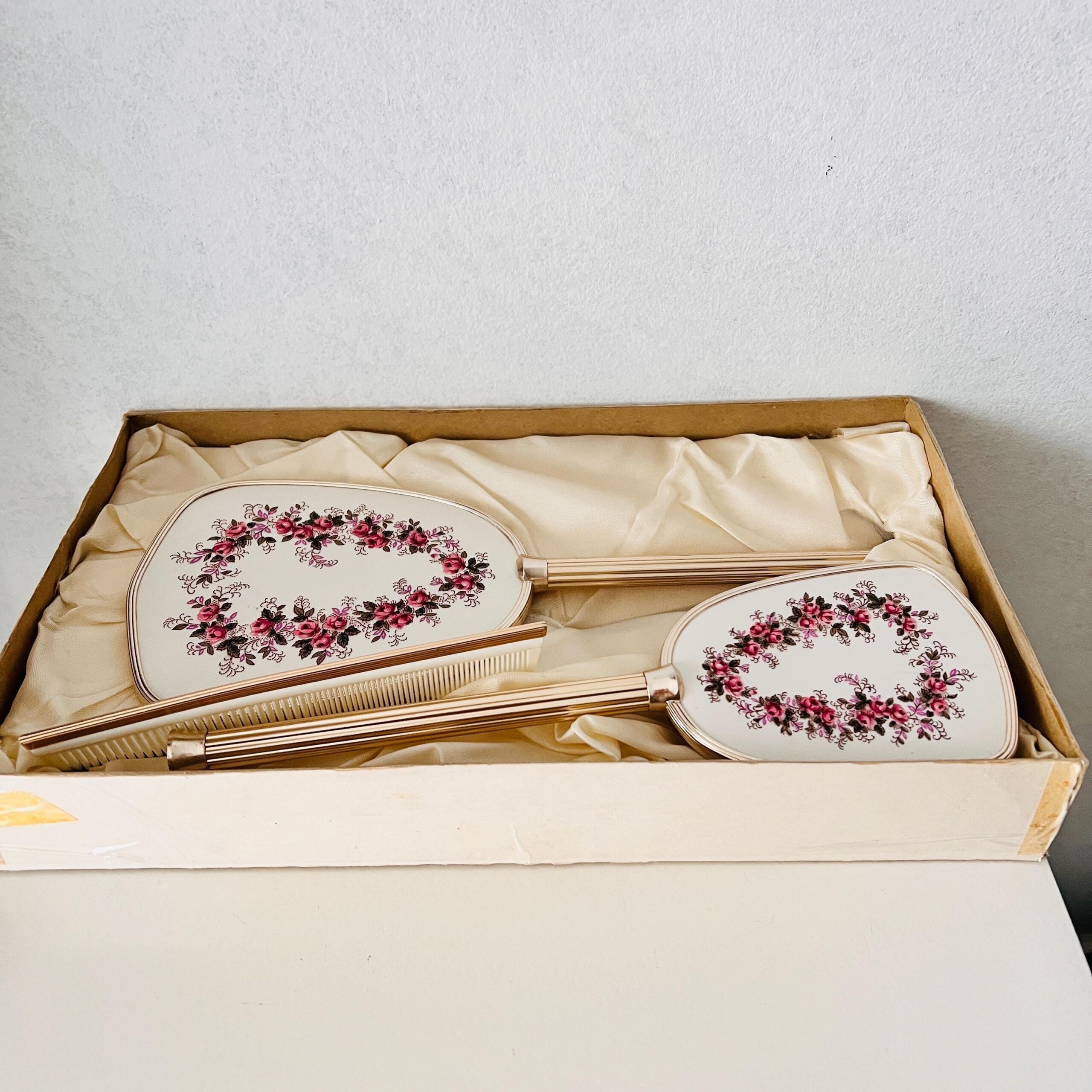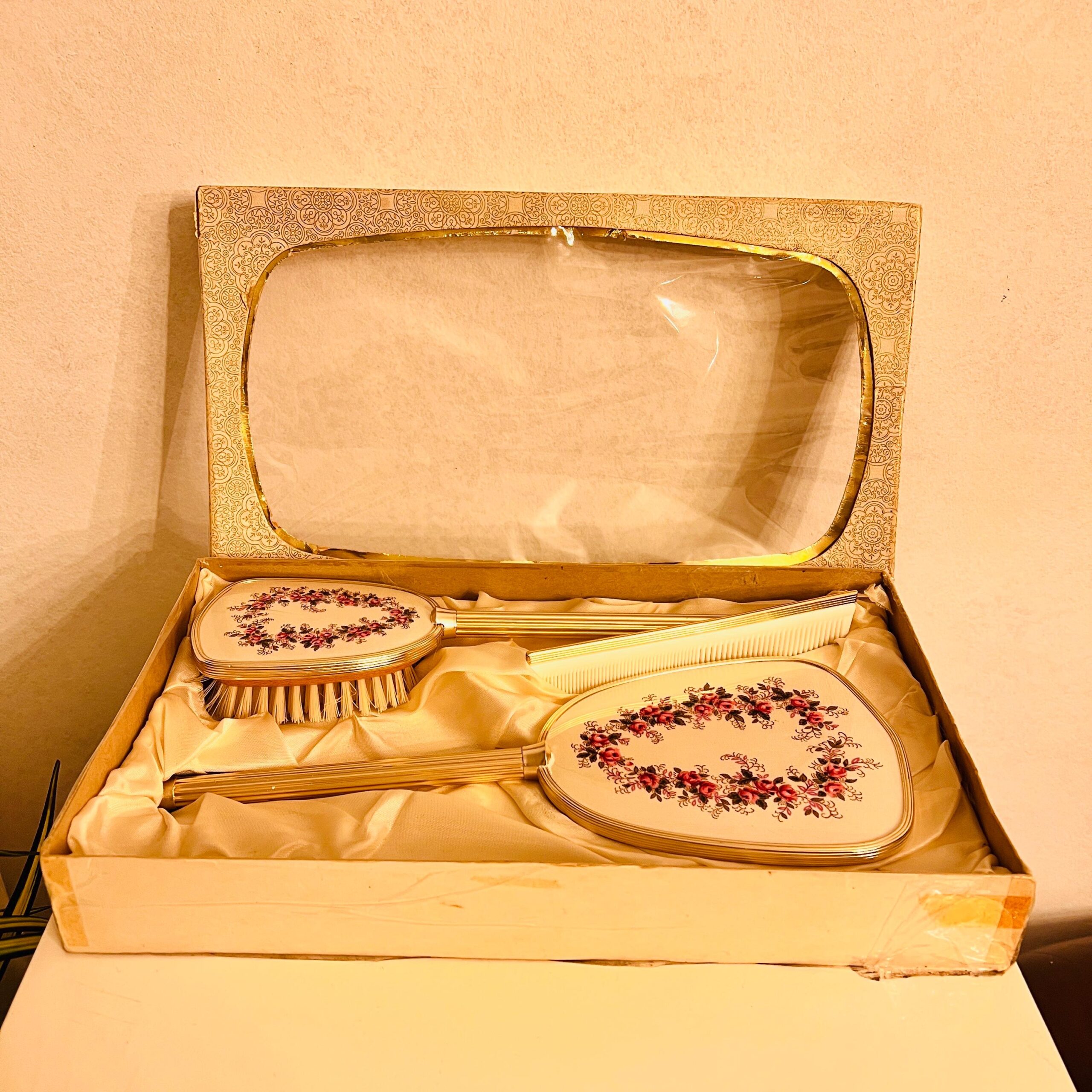 English Vanity Set – Made in England, Vintage Dressing Table Decor – Mascot. Its delicate floral motif and gold accents speak to a time of refined beauty and quiet rituals. Whether you’re curating a vintage boudoir or searching for a meaningful gift, this set offers charm and elegance in equal measure.