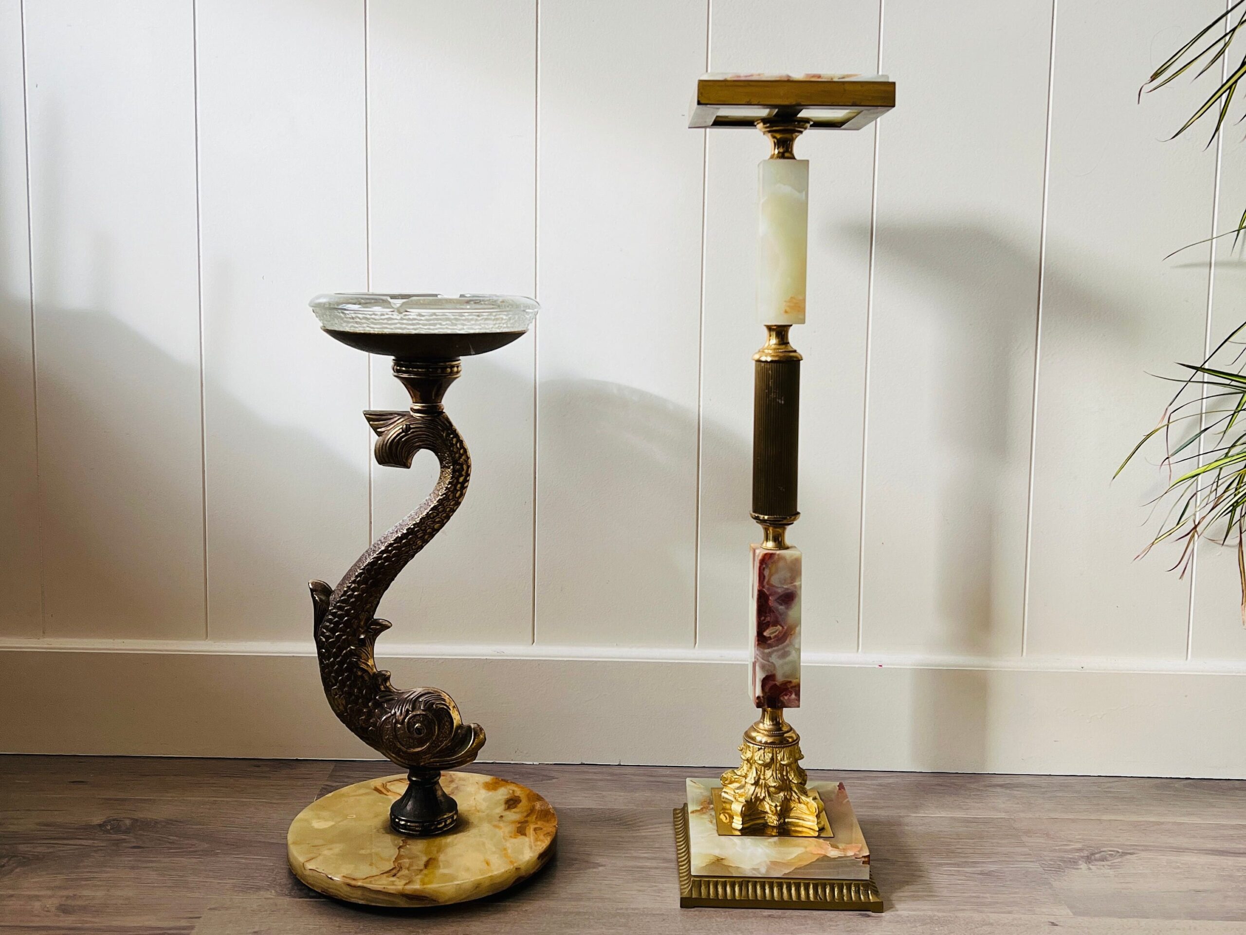 A bold accent piece with undeniable vintage appeal, this mid century standing ashtray brings sculptural elegance to your space. Featuring a solid brass form paired with a marble base, it blends glamour and function in true Hollywood Regency fashion – ideal beside a lounge chair, in a den, or as a collectible floor accent.