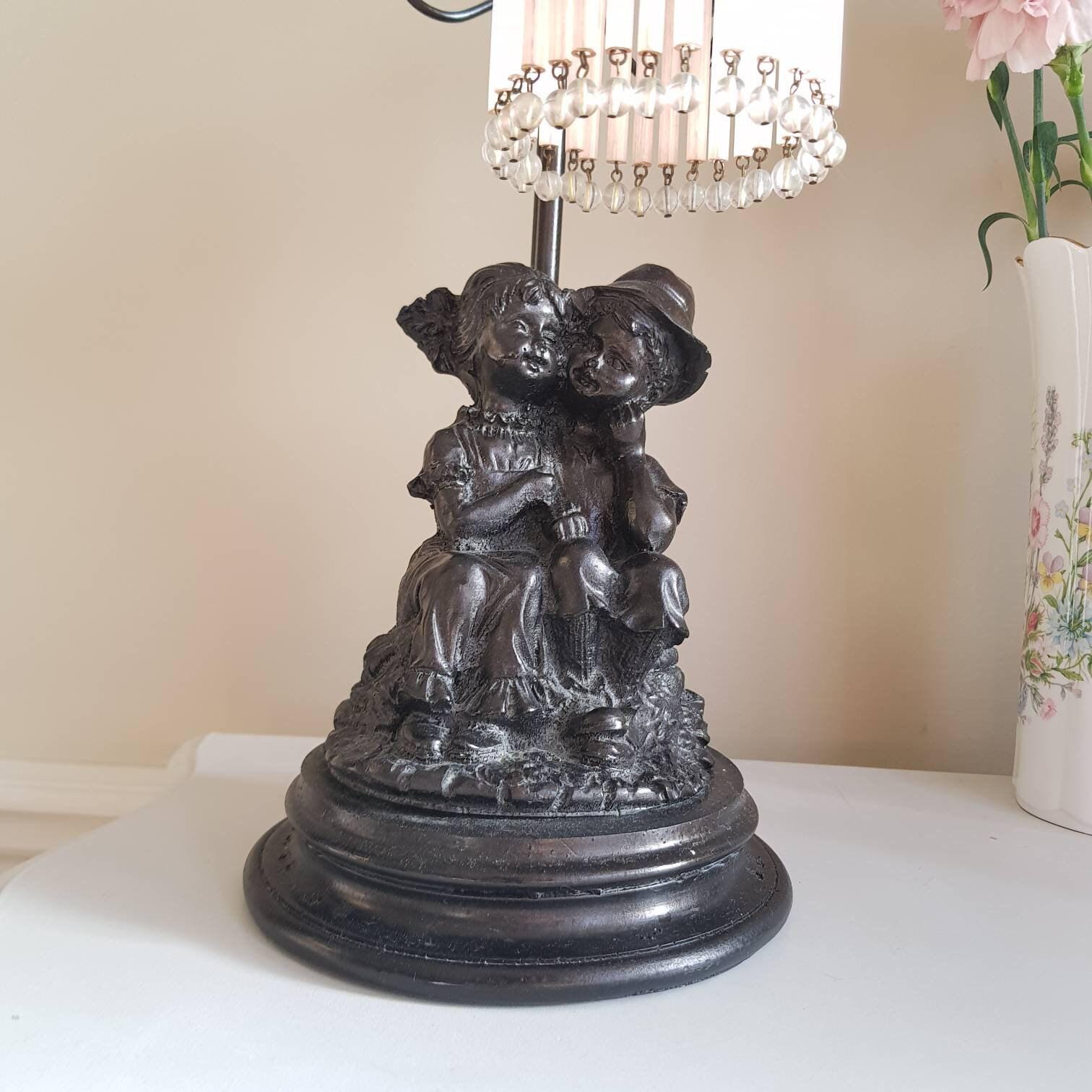 A porcelain lamp that brings a smile with its playful charm, this vintage French statue lamp features a pair of sweetly sculpted children beneath a ruffled cream shade. Perfect for adding whimsy to a reading nook or soft light to a nursery, it blends storytelling and function in every curve and detail.