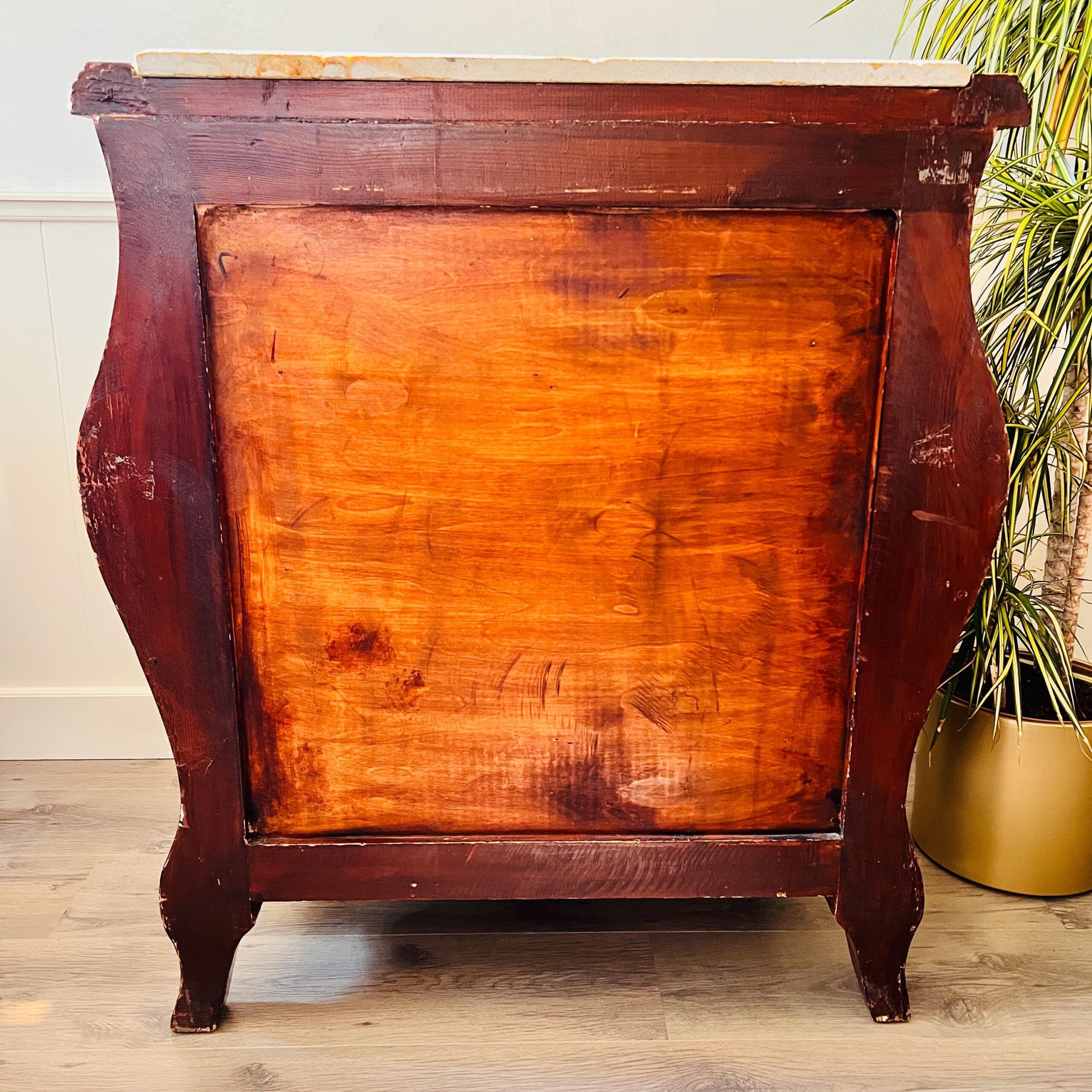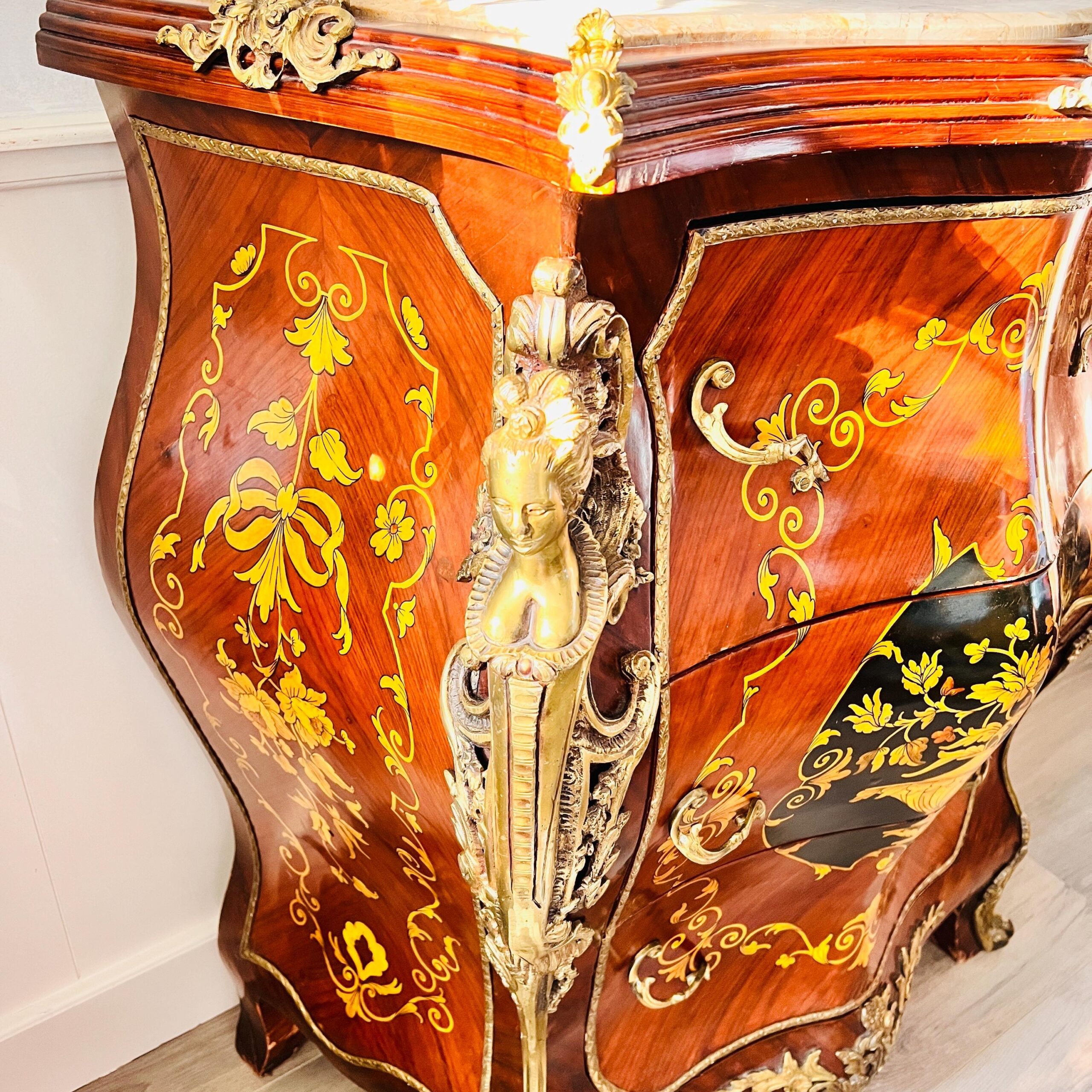 Elevate your space with ornate elegance. This French Louis XV-style cabinet features a richly veined marble top and classic curves, offering luxurious storage with unmistakable vintage charm. Whether styled in a grand entryway, romantic bedroom, or eclectic living room, its warm wood tones and refined silhouette bring history and beauty to any setting.