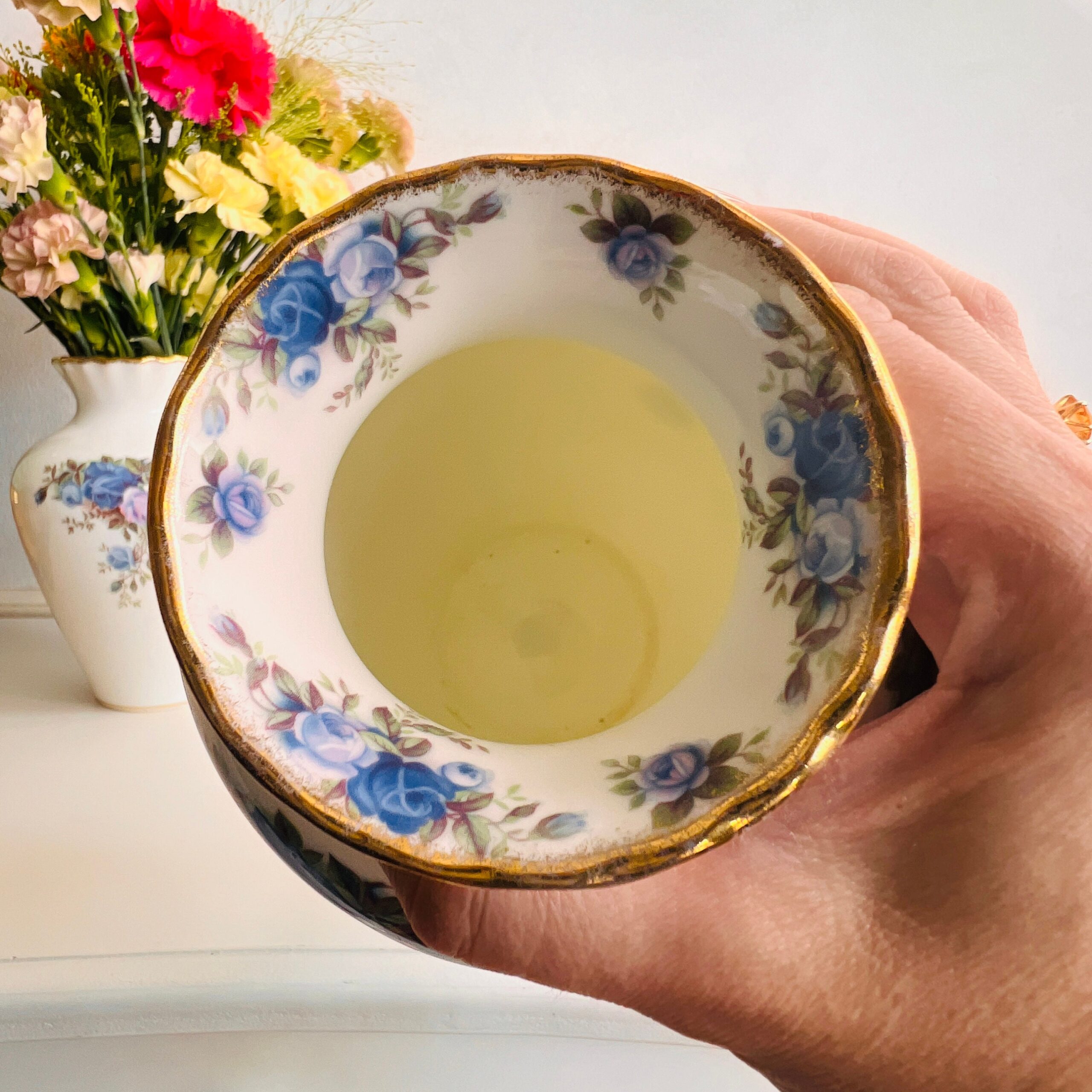 • Moonlight Roses pattern with vivid blue roses and gold accents