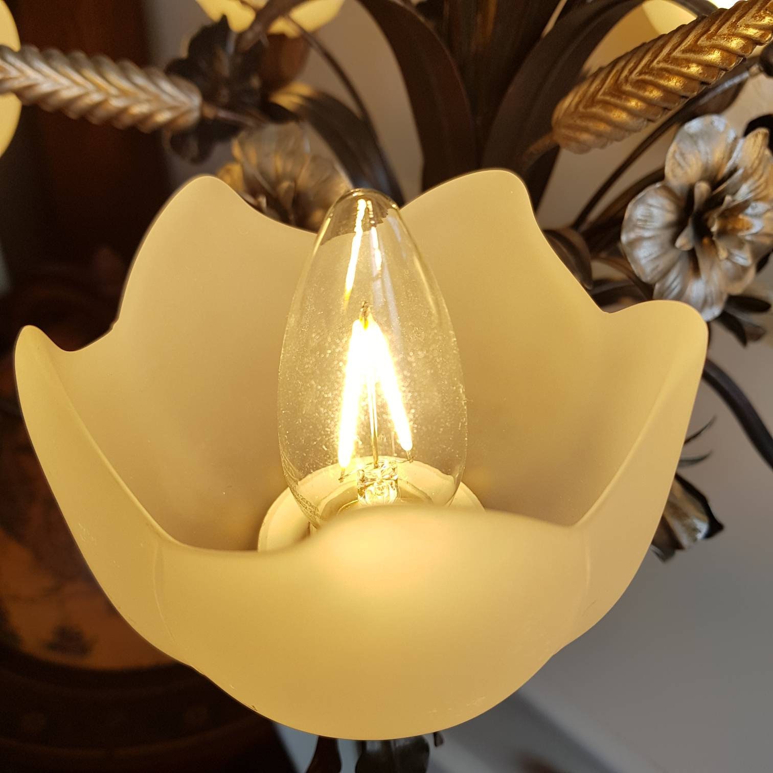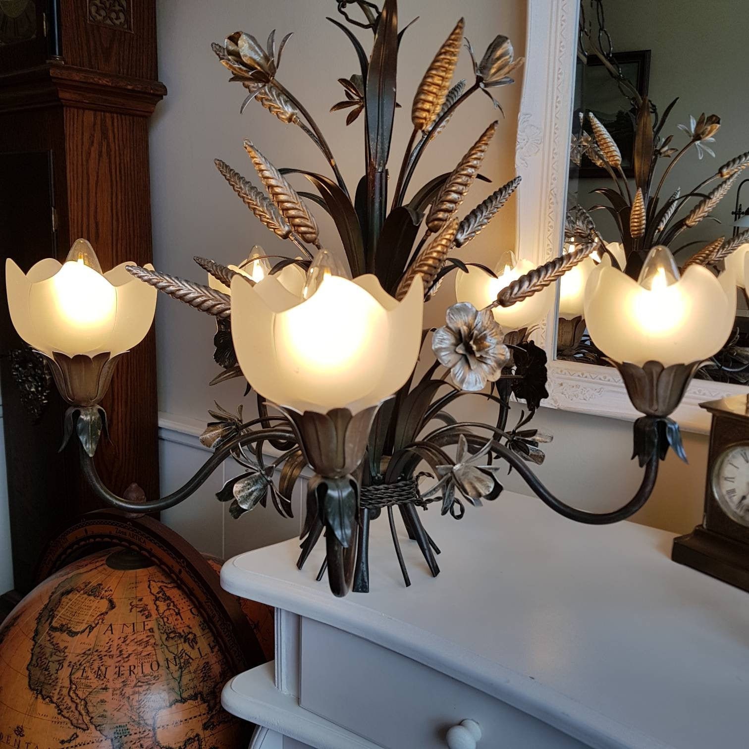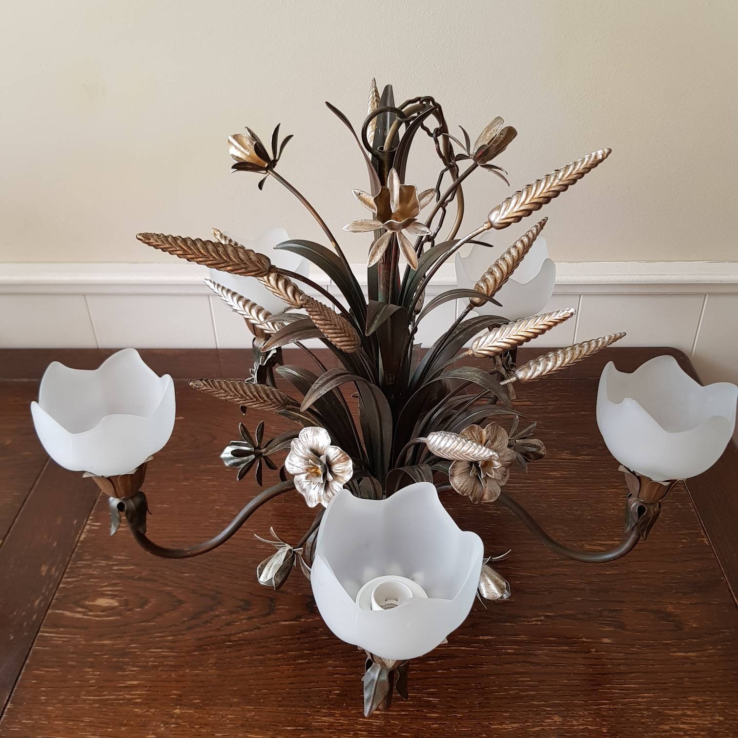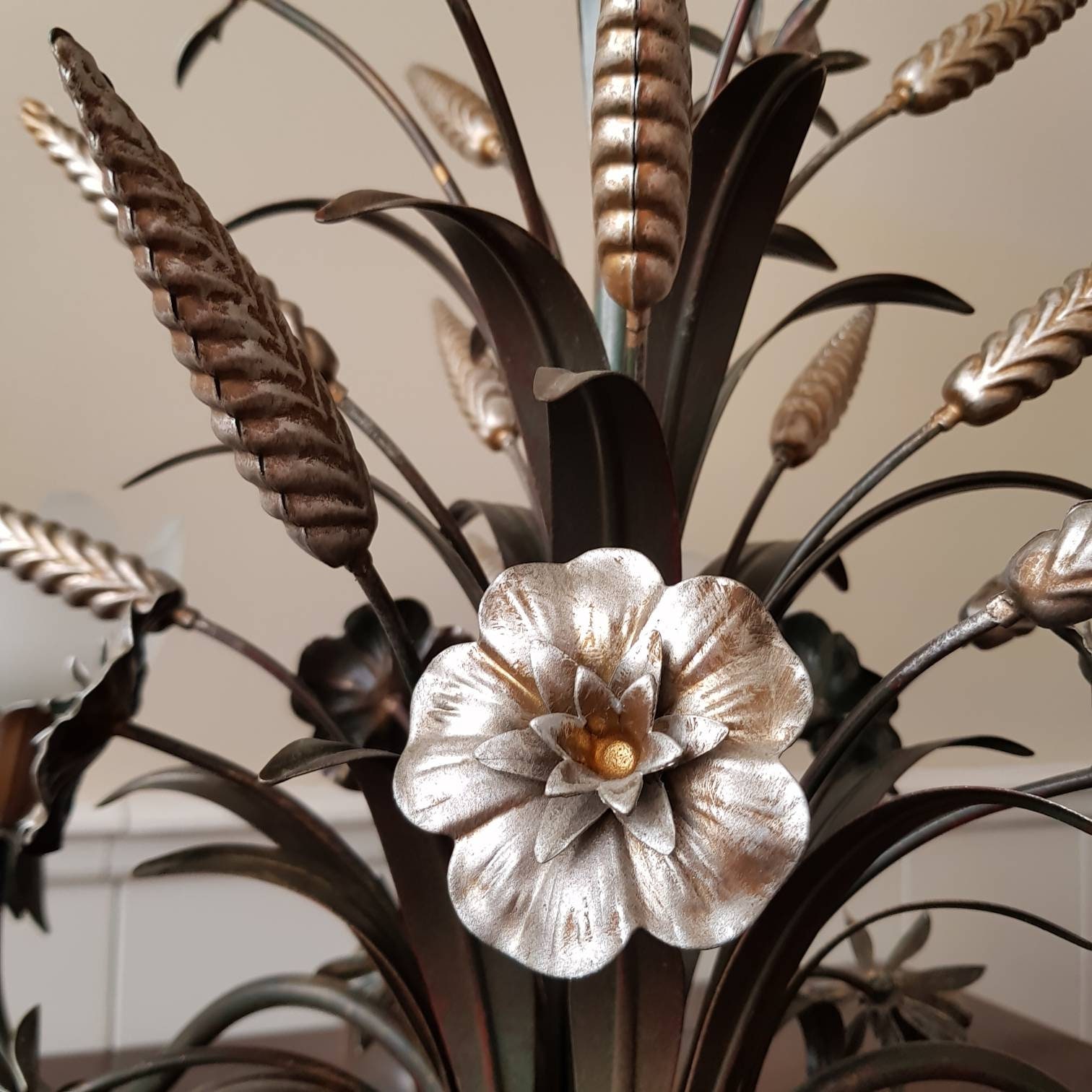 Brimming with character and old-world charm, this Italian tole chandelier is a sculptural ceiling light with a flair for drama. Featuring five arms and a lavish spray of hand-forged wheat shafts and floral flourishes, its Hollywood Regency silhouette is both bold and romantic – just the way golden hour lighting should be. A radiant piece for entryways, dining rooms, or vintage interiors that favor style with soul.