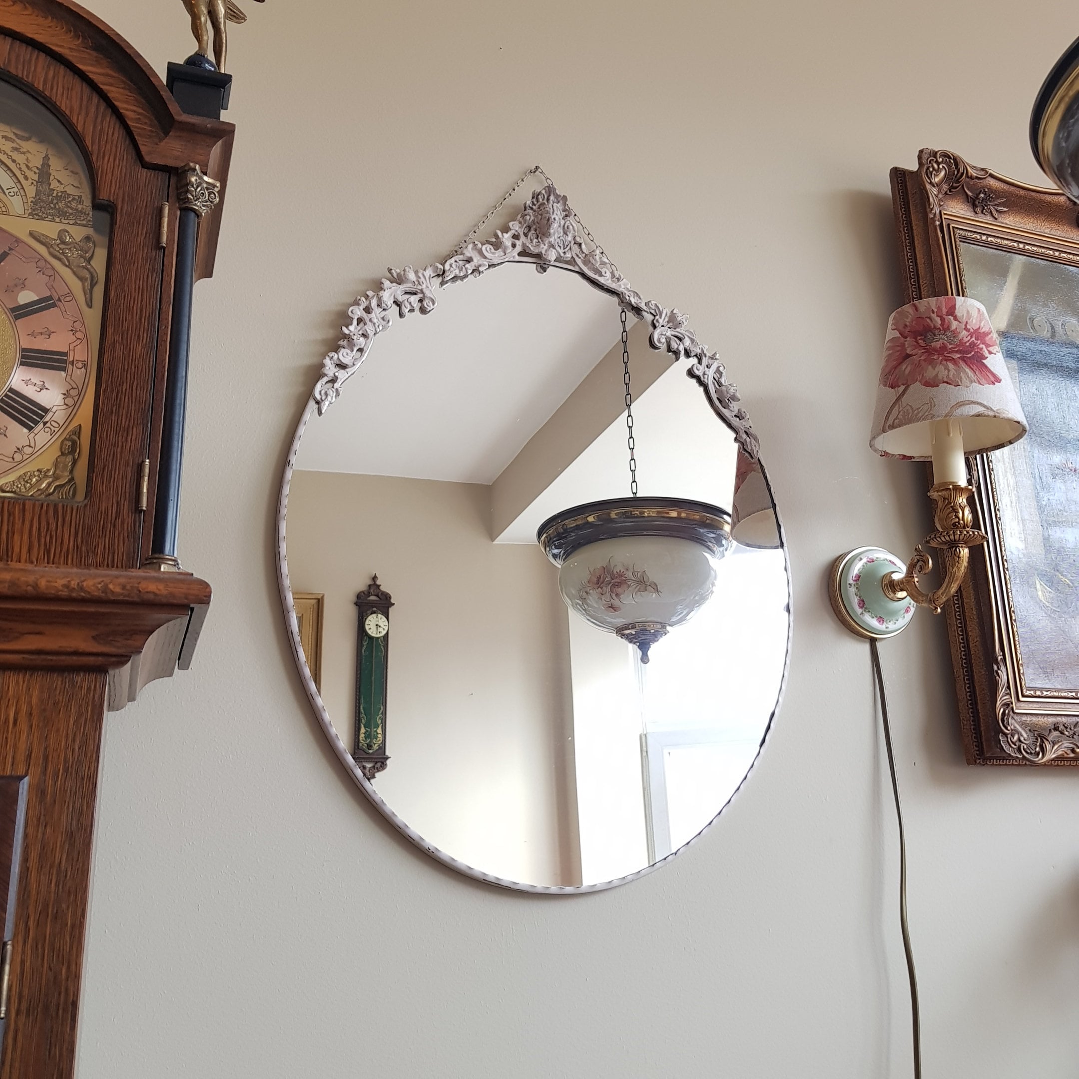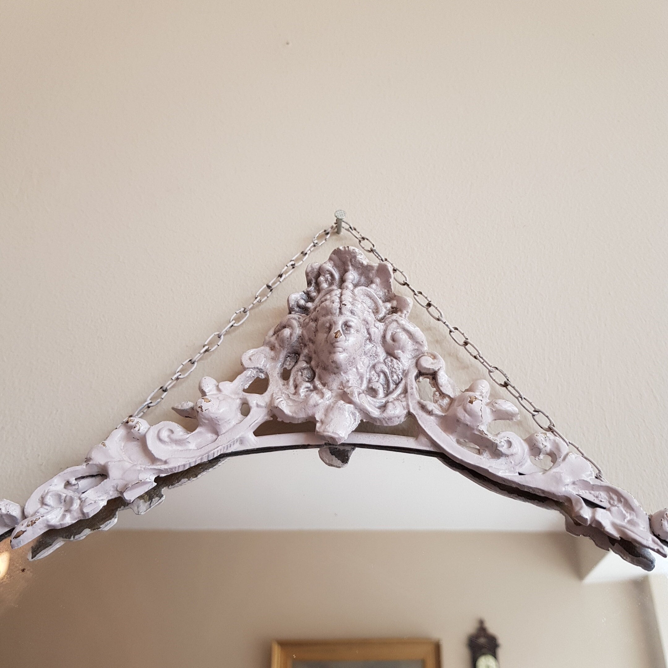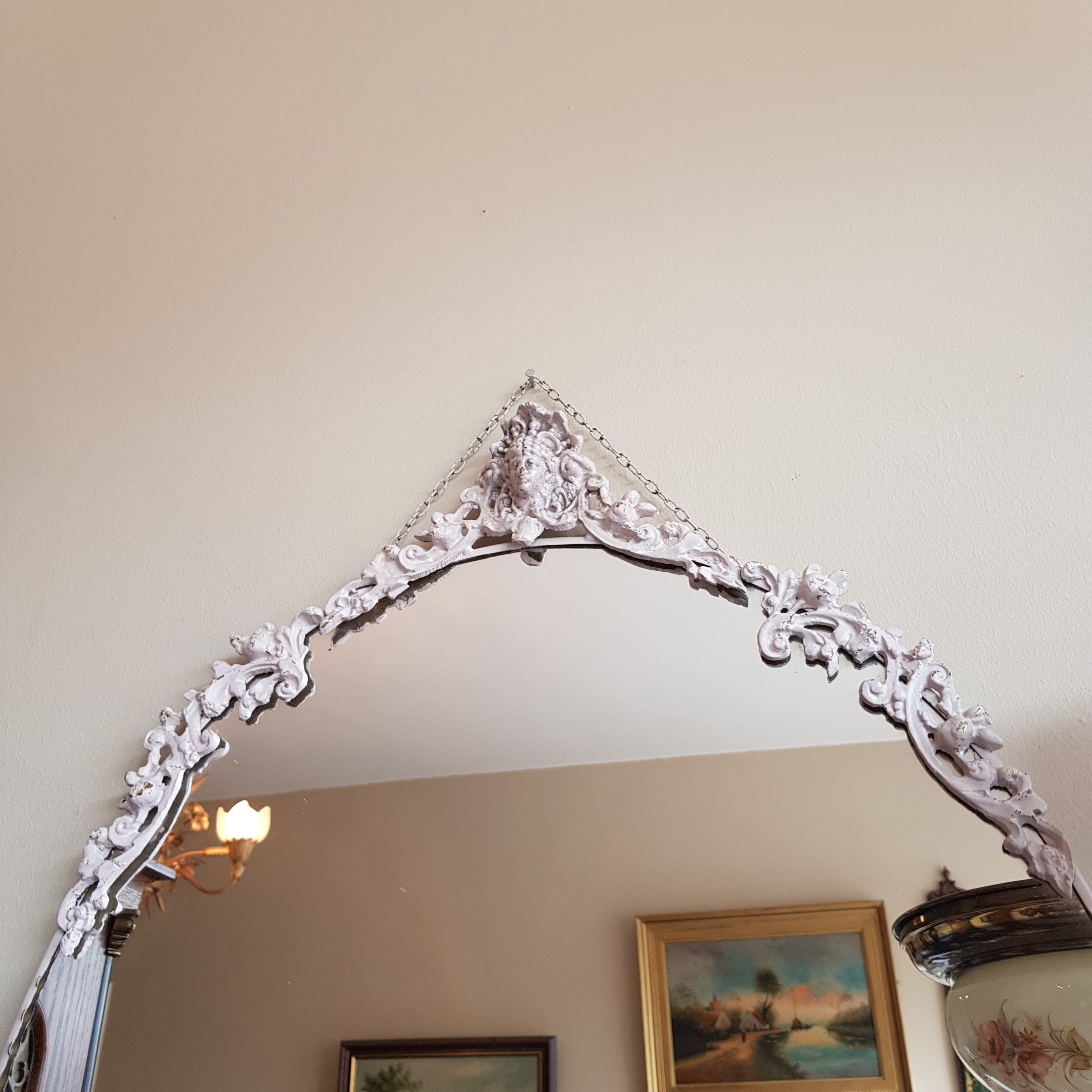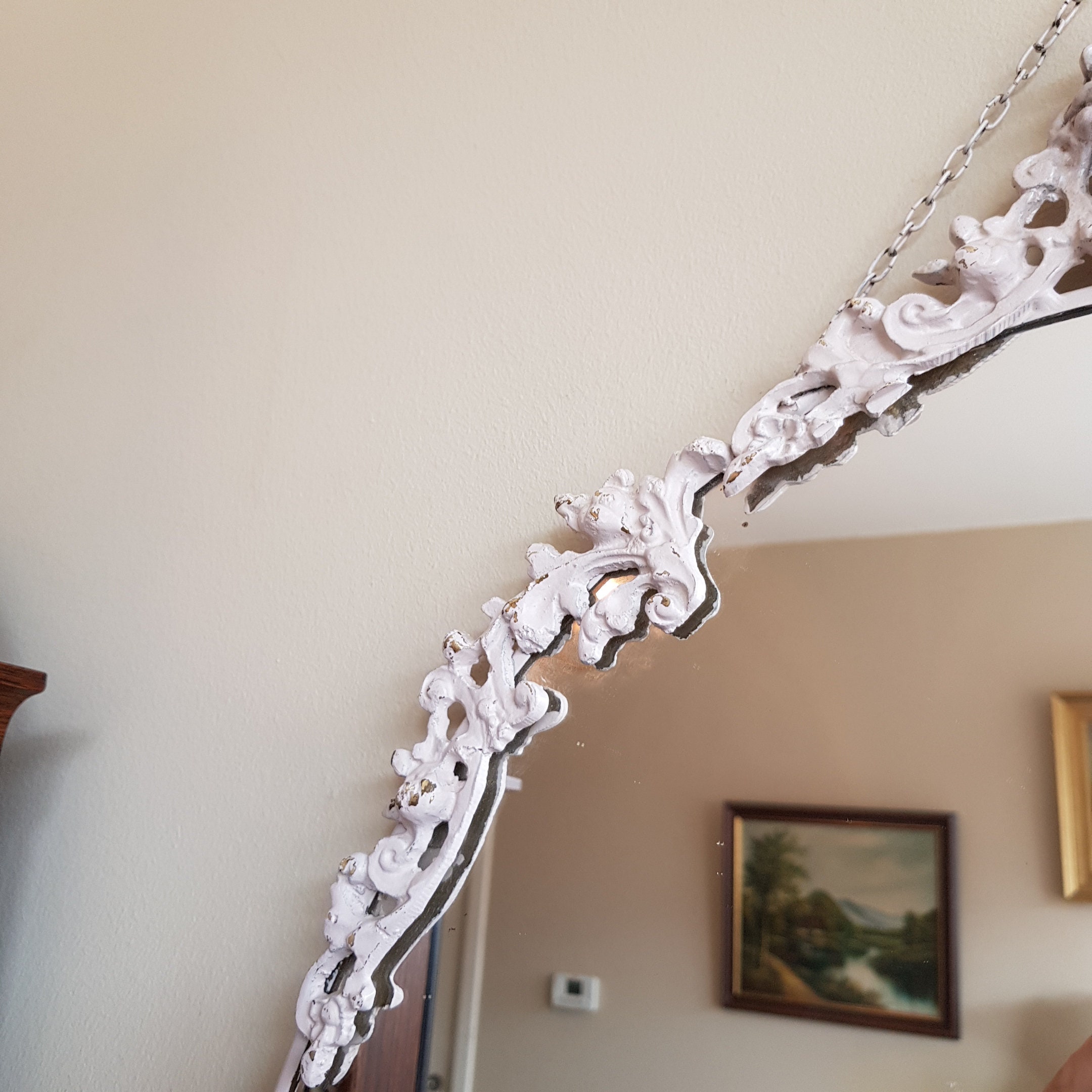 Old big mirror with brass ornamental frame with a nice patina, shabby-chic painted. The frame has a particular waved shape. Hard to find!