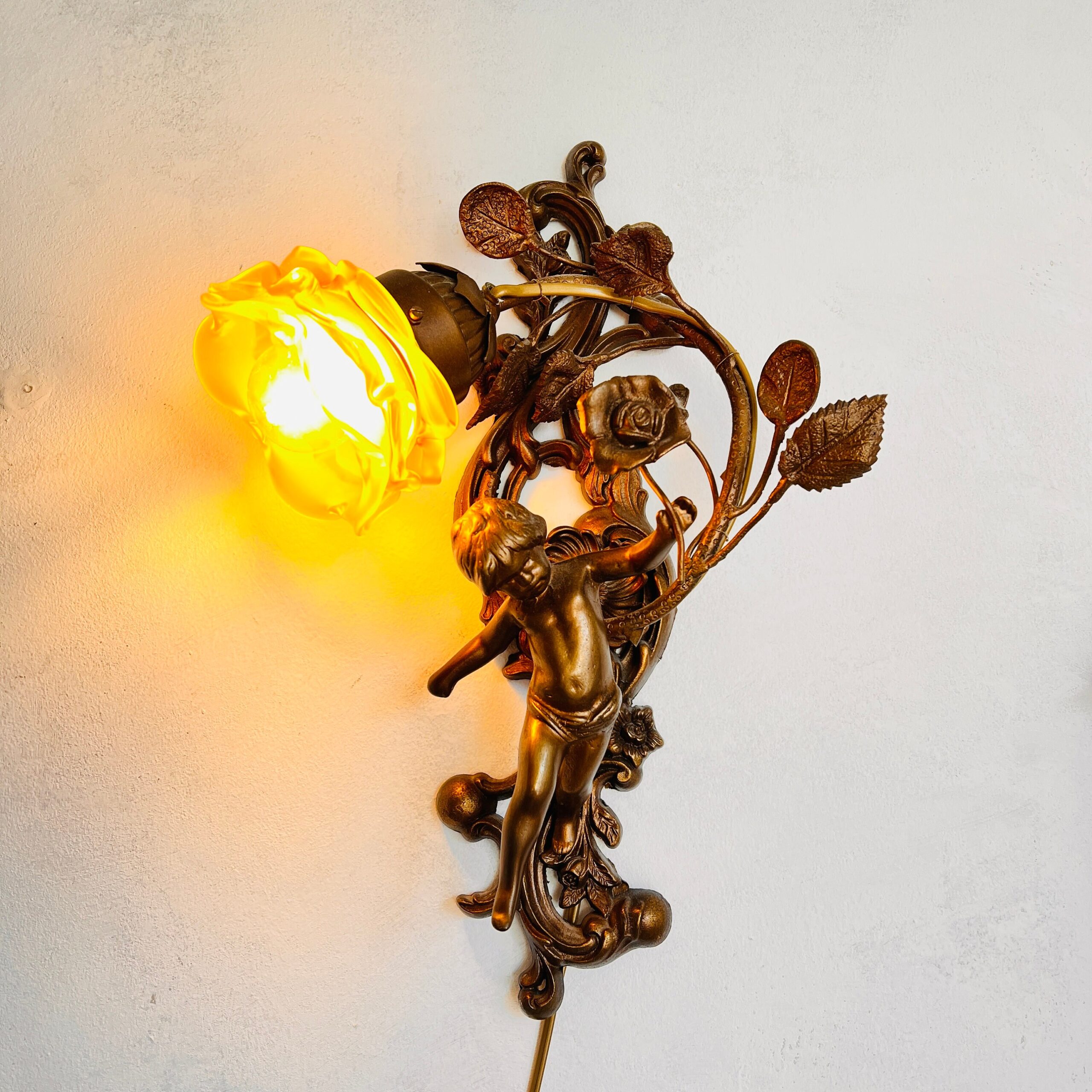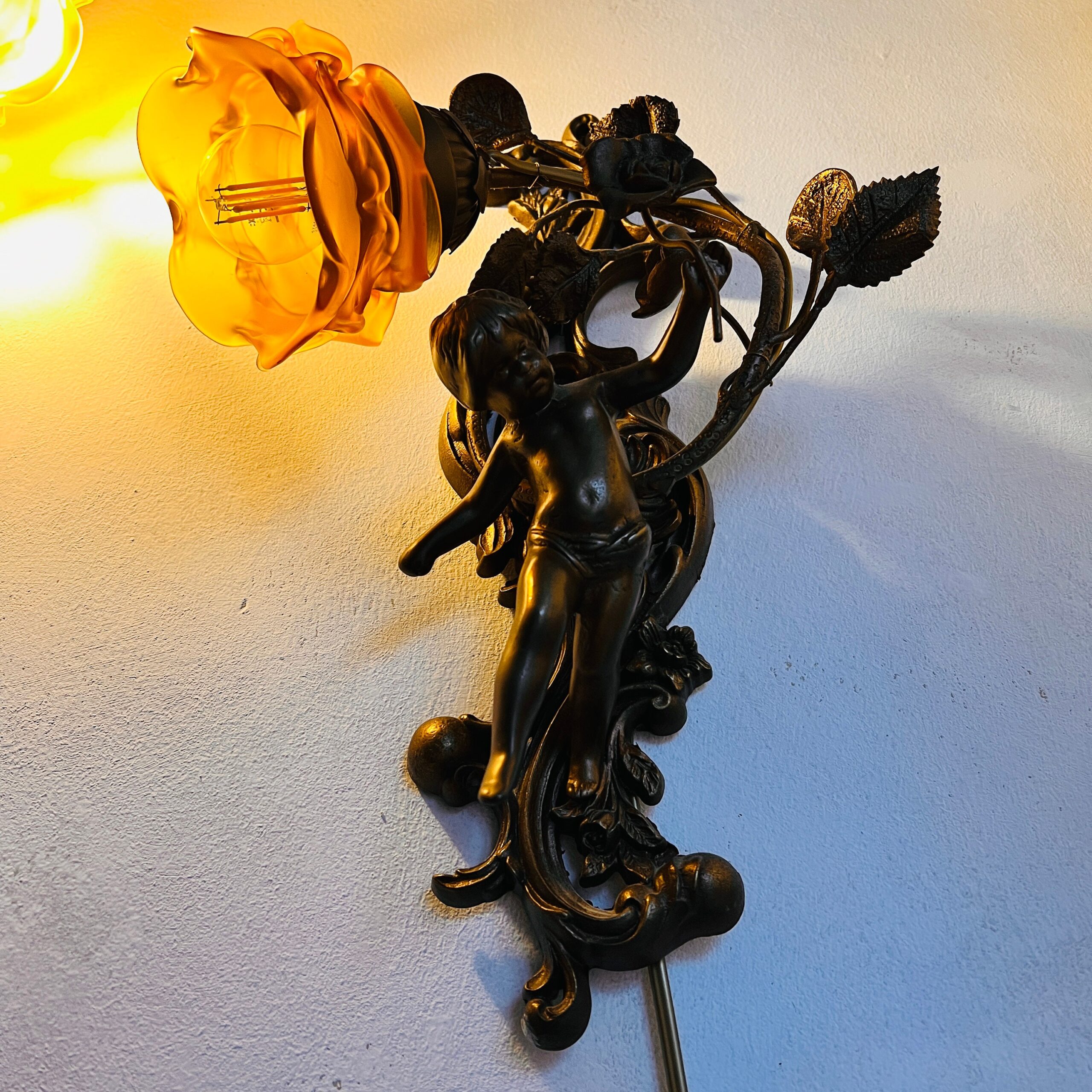 Bronze Cherub Wall Sconces – Italian Vintage Pair, Ornate Rococo Style Wall Lamps