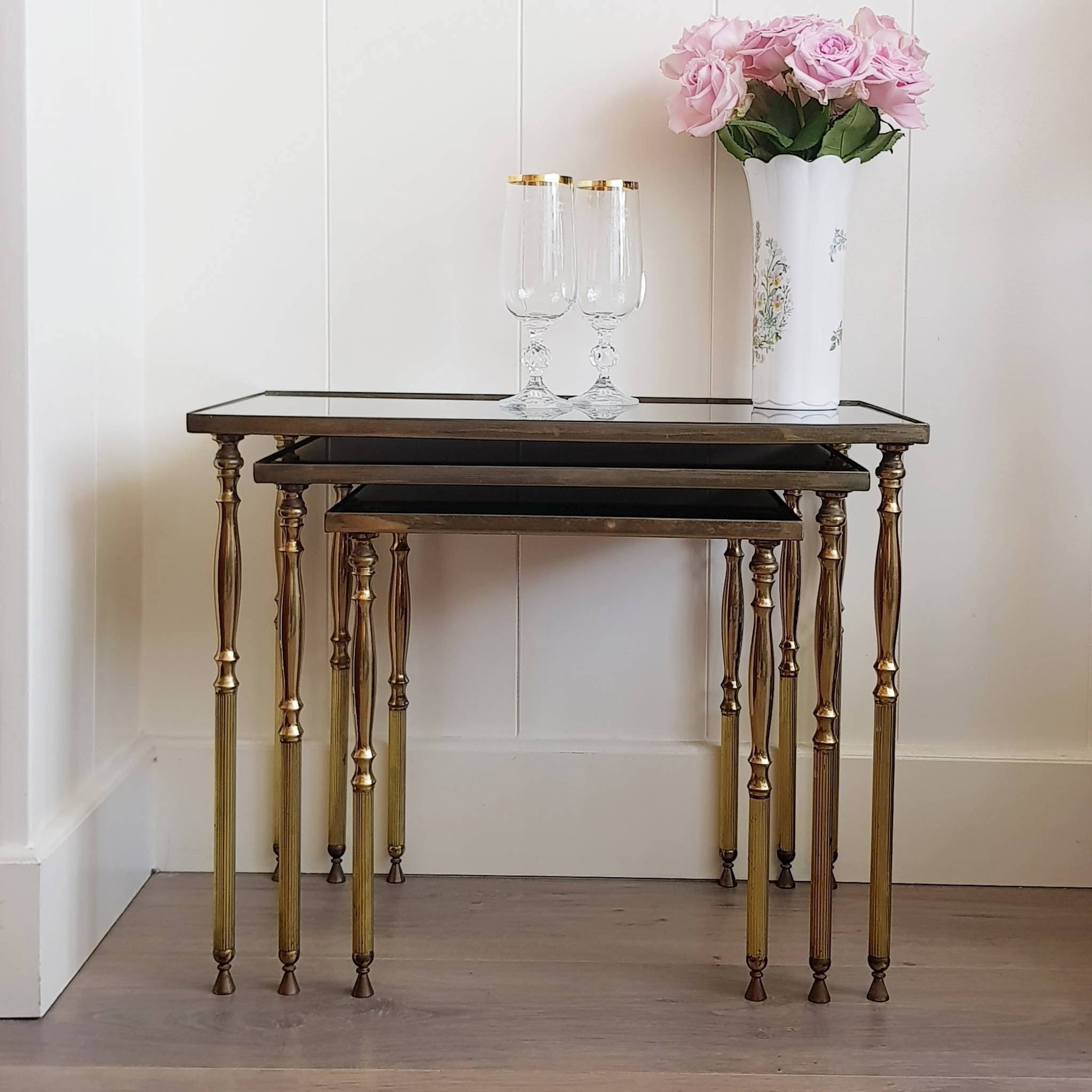 Mid-Century 3 Nesting Tables Brass 60s/70s Hollywood Regency Coffee Side Tables. Column-style nesting tables with dark smoked mirrors.