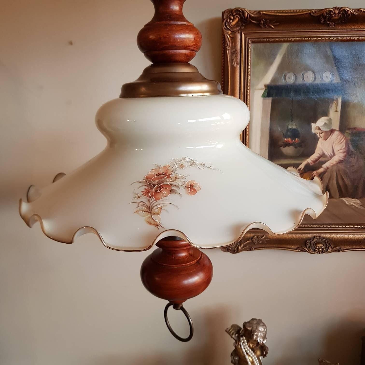 • Materials: milky opaline glass shade, natural wood handle, metal fixture