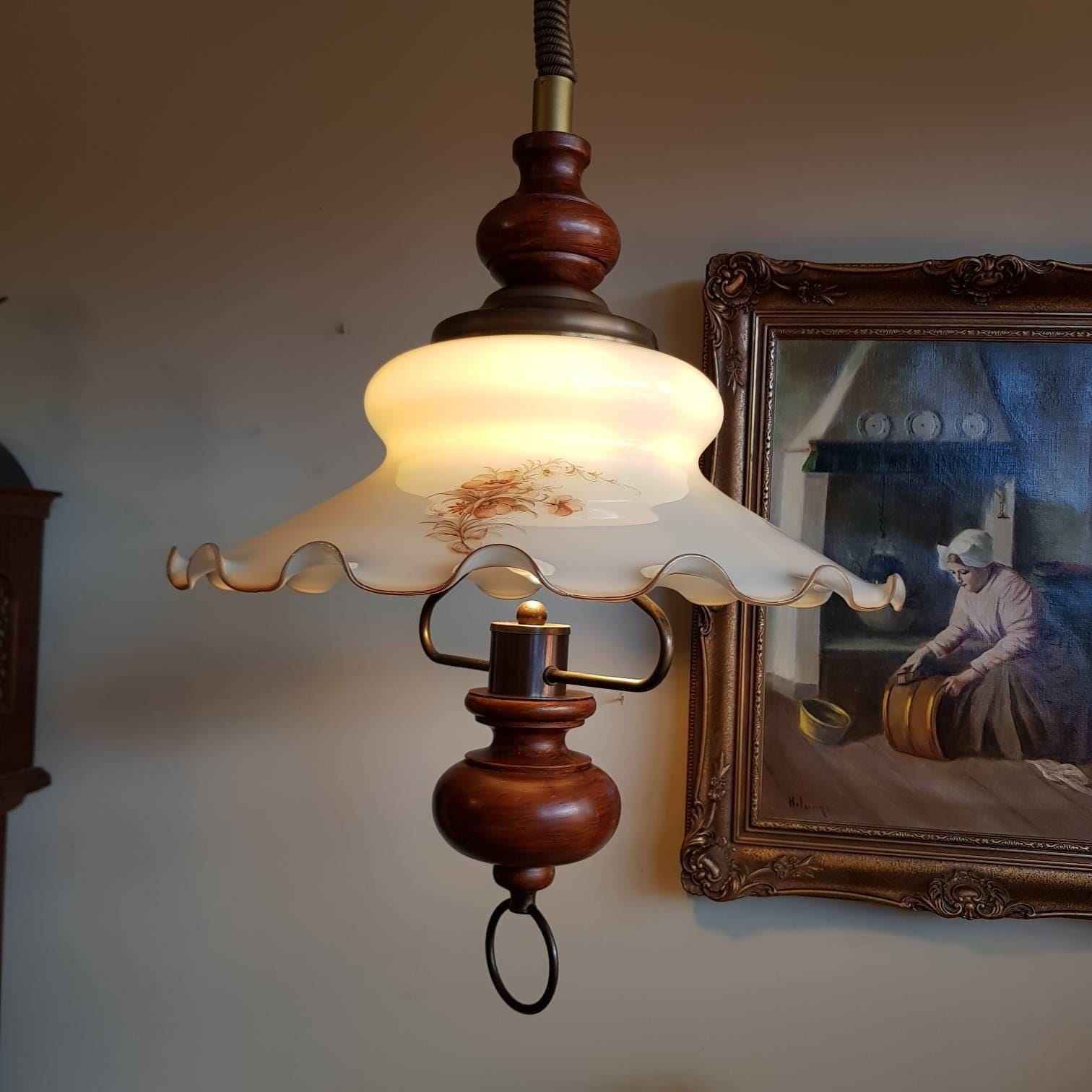 A standout in any room, this opaline glass pendant light blends mid century minimalism with practical design. Suspended from an adjustable ceiling mount and finished with a warm wood handle, it’s perfect for dining areas, kitchen islands, or reading corners that need a vintage touch with presence. This rare pull-down lighting design brings both charm and function in equal measure.