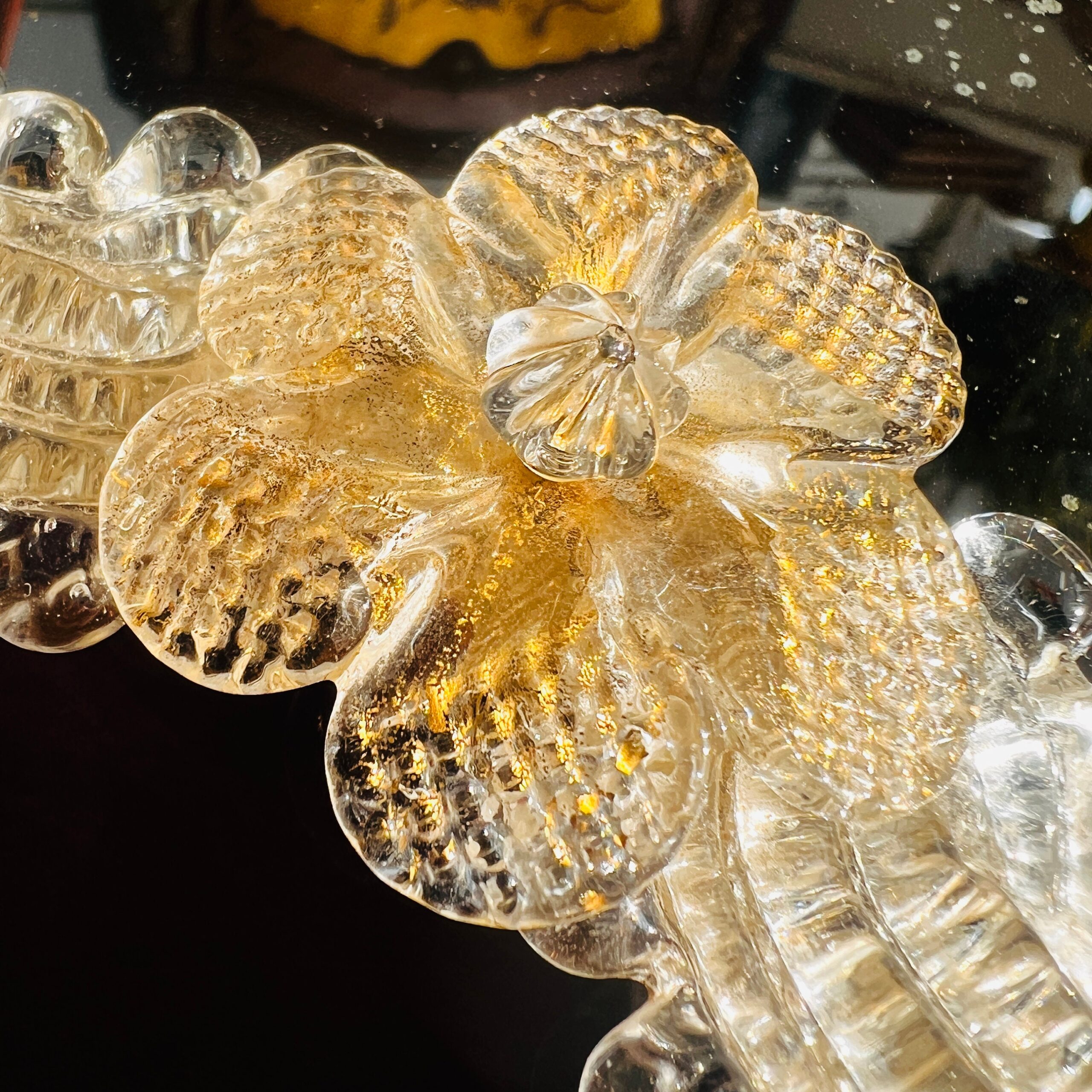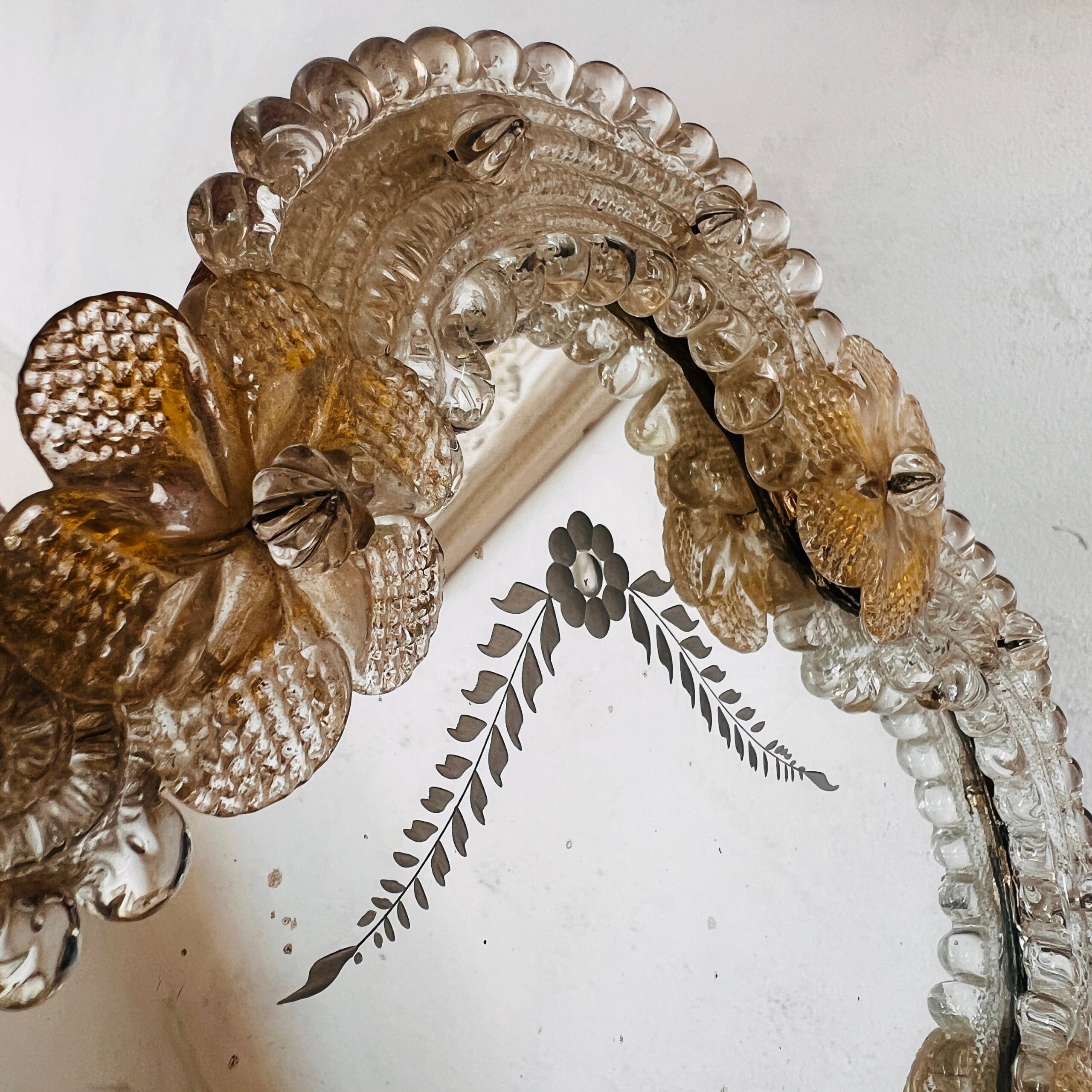 The mirror itself is made of high quality, the frame is adorned with intricate, hand-blown Murano glass pieces, and delicate flowers.