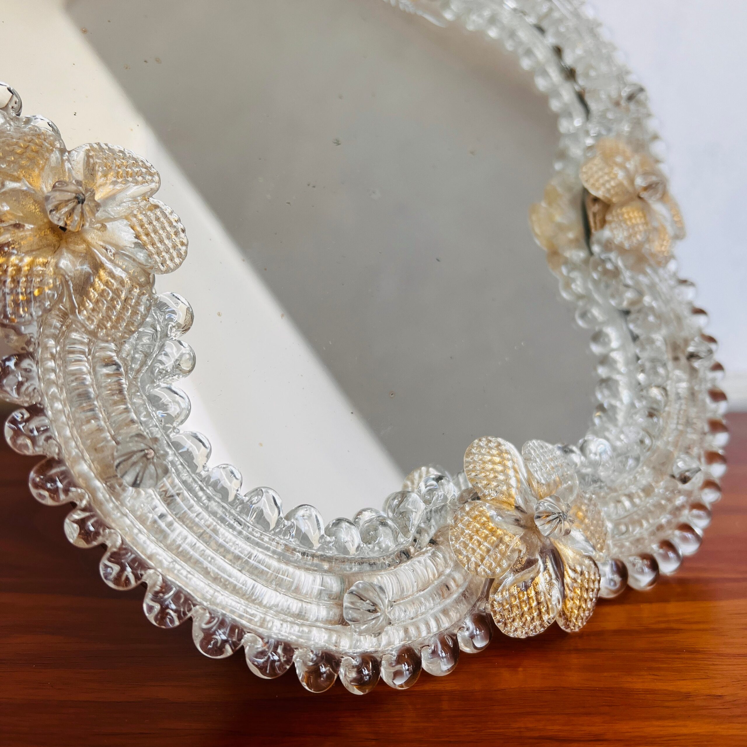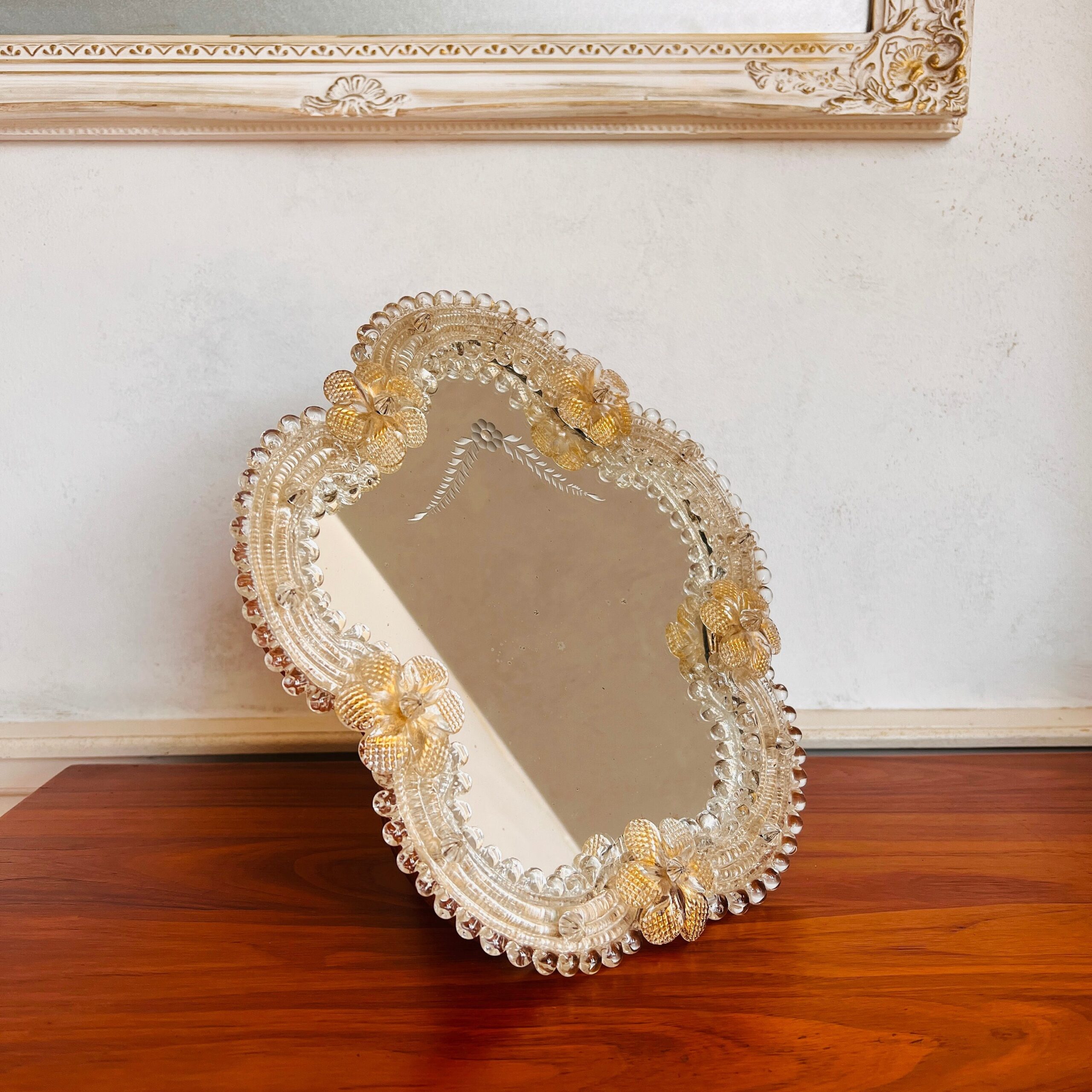 The result is a stunning piece that catches the light beautifully and adds a touch of glamour to any space. Whether used as a tabletop mirror for your vanity or as a decorative accent on a console table or mantle, this vintage Murano glass mirror it will be a nice gift and cherished addition to your collection.