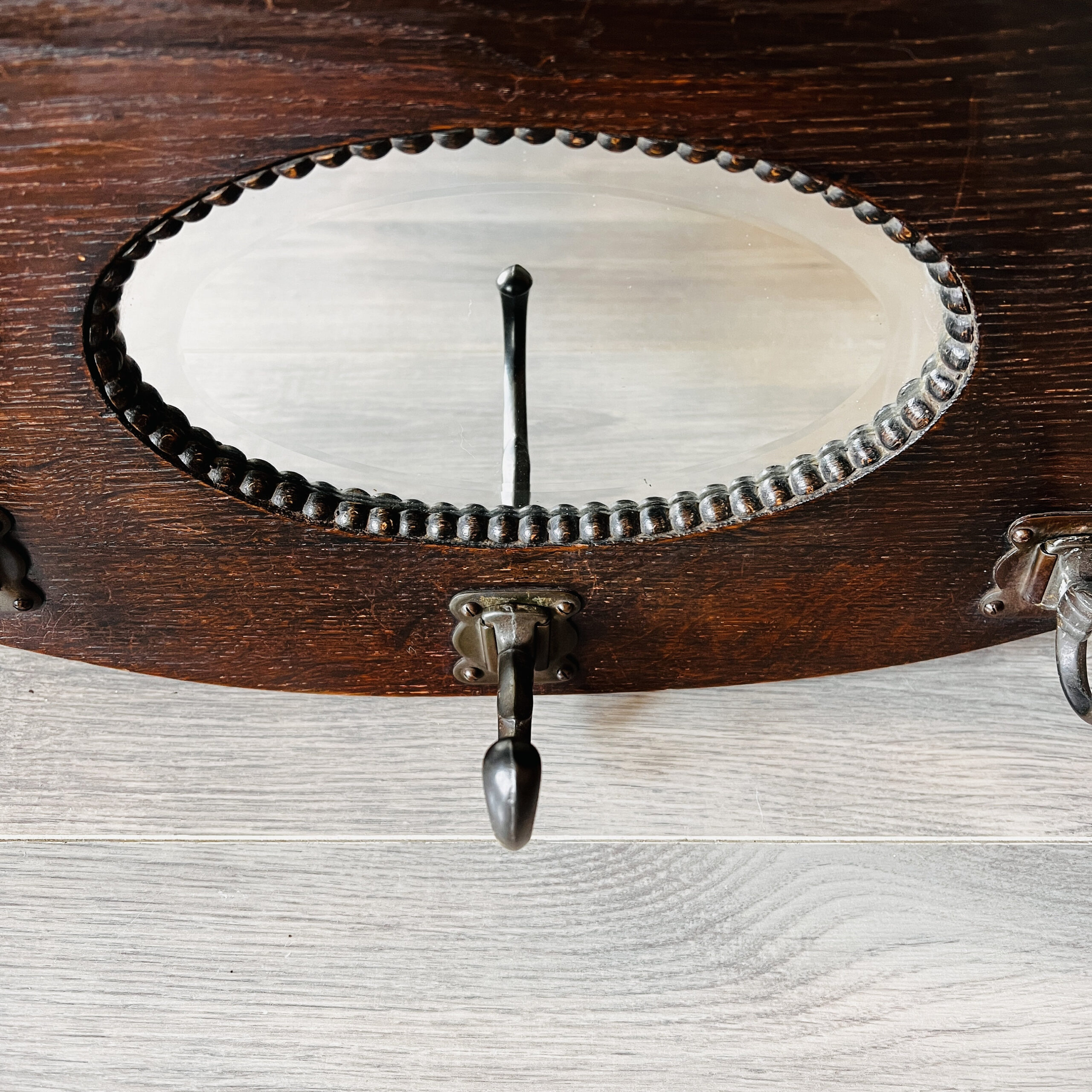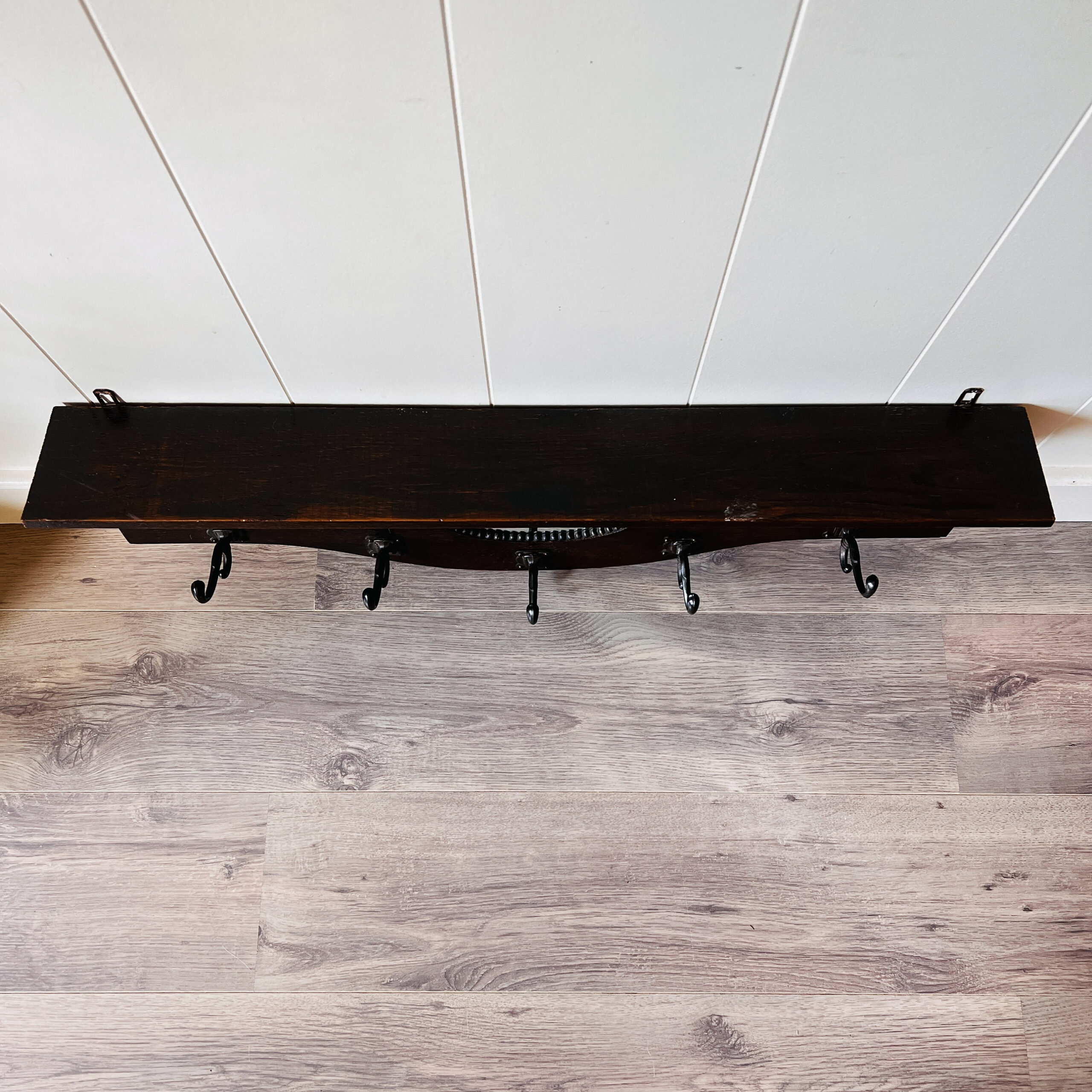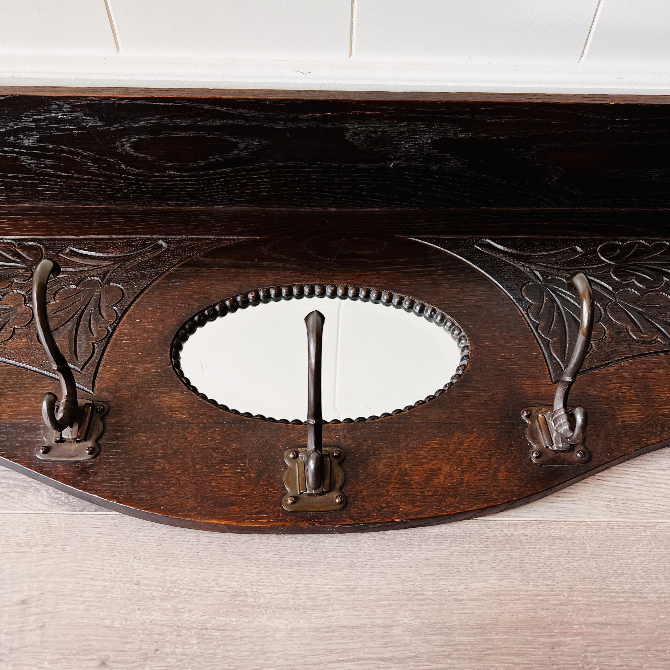 Old Dutch wall hanger, coat rack with small beveled mirror, handmade of wood with one shelf that allows a versatile storage solution for various items like hats, keys, umbrellas…