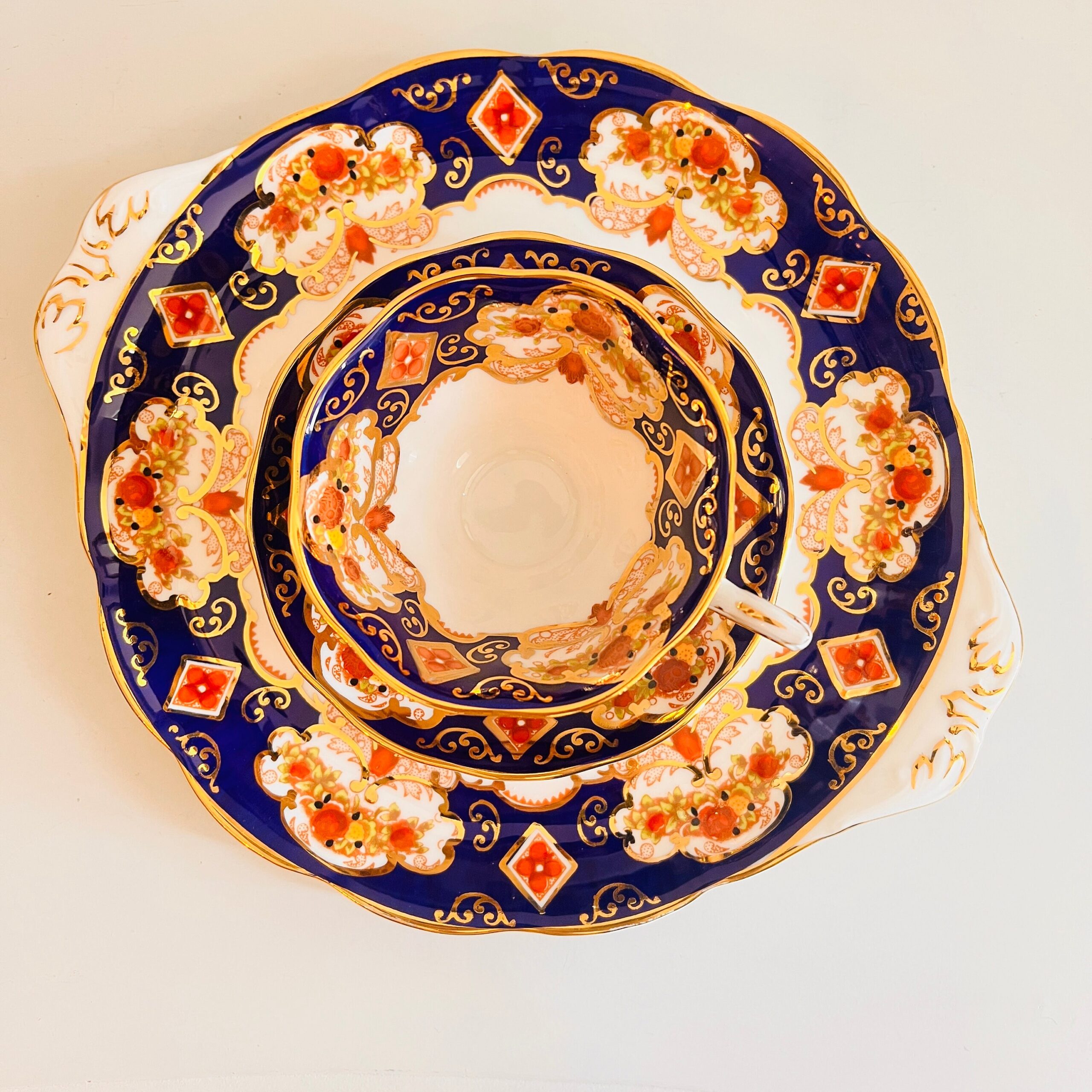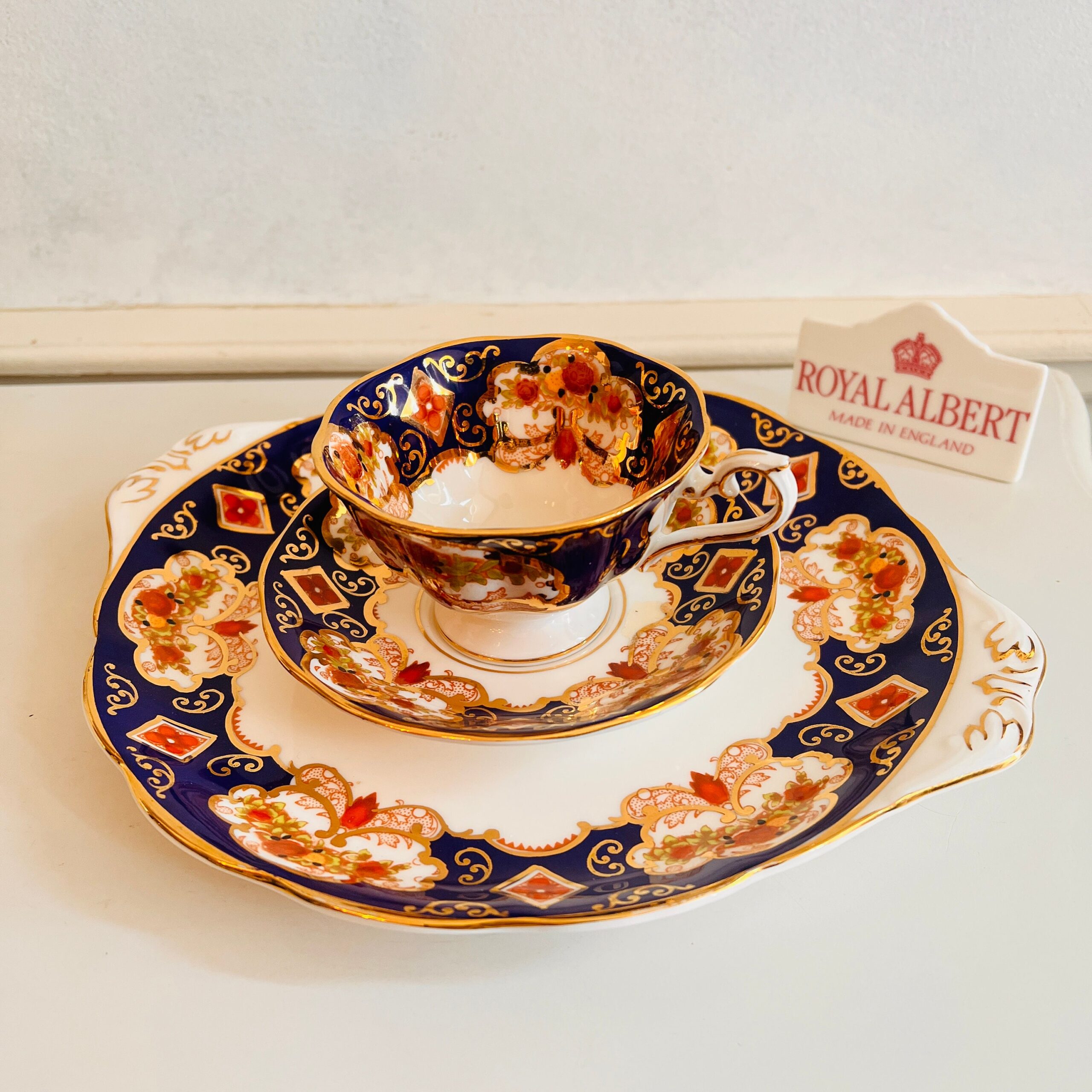 Delicate and quietly regal, this Royal Albert Heirloom Avon trio offers a timeless way to savor tea – or to simply display and admire. The fine bone china set includes a teacup, matching saucer, and a cake plate, each graced with deep sapphire borders, creamy ivory center, and ornate floral detailing in true English style. A beloved collectible for vintage china lovers, and a graceful addition to any tea ritual.