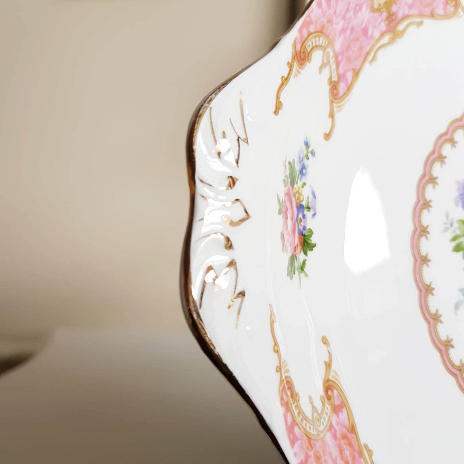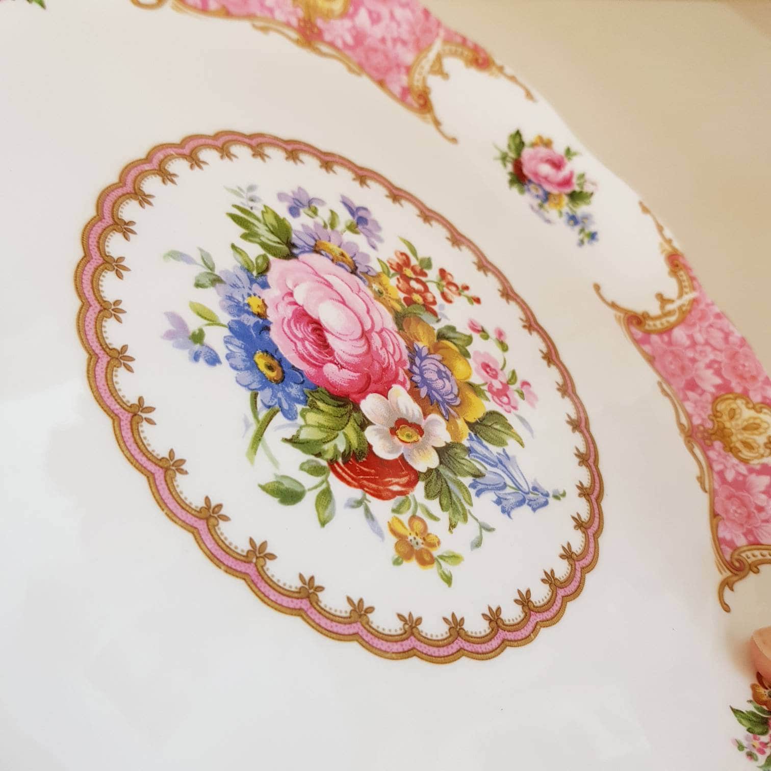 Royal Albert ‘Lady Carlyle’ bone china cake plate/serving plate, in a lovely pattern of pink panels and multi-color flowers.