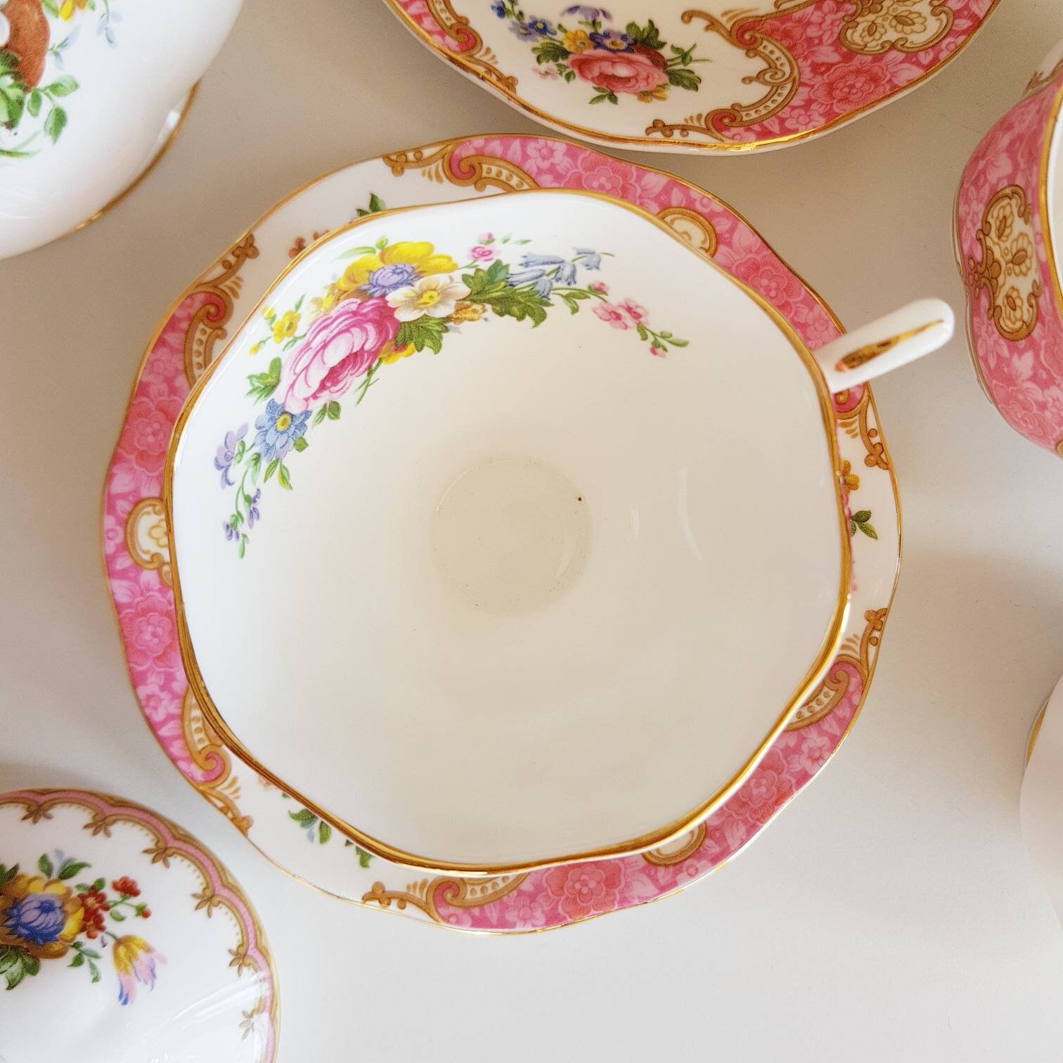 Charming pattern with floral design, a deep pink border, and elaborate gold scroll-work across a beautiful range of tea-ware. The design was in the 1940s.