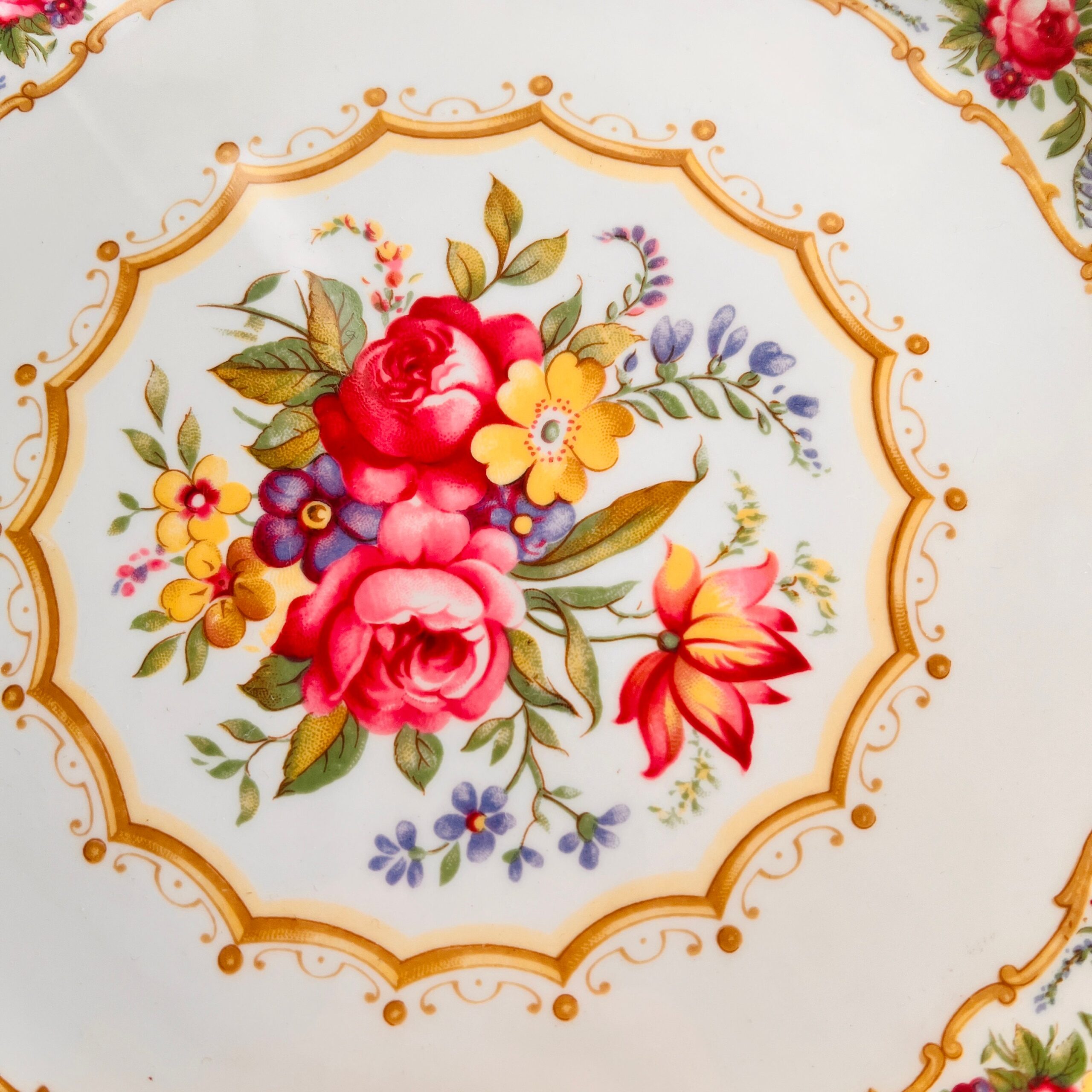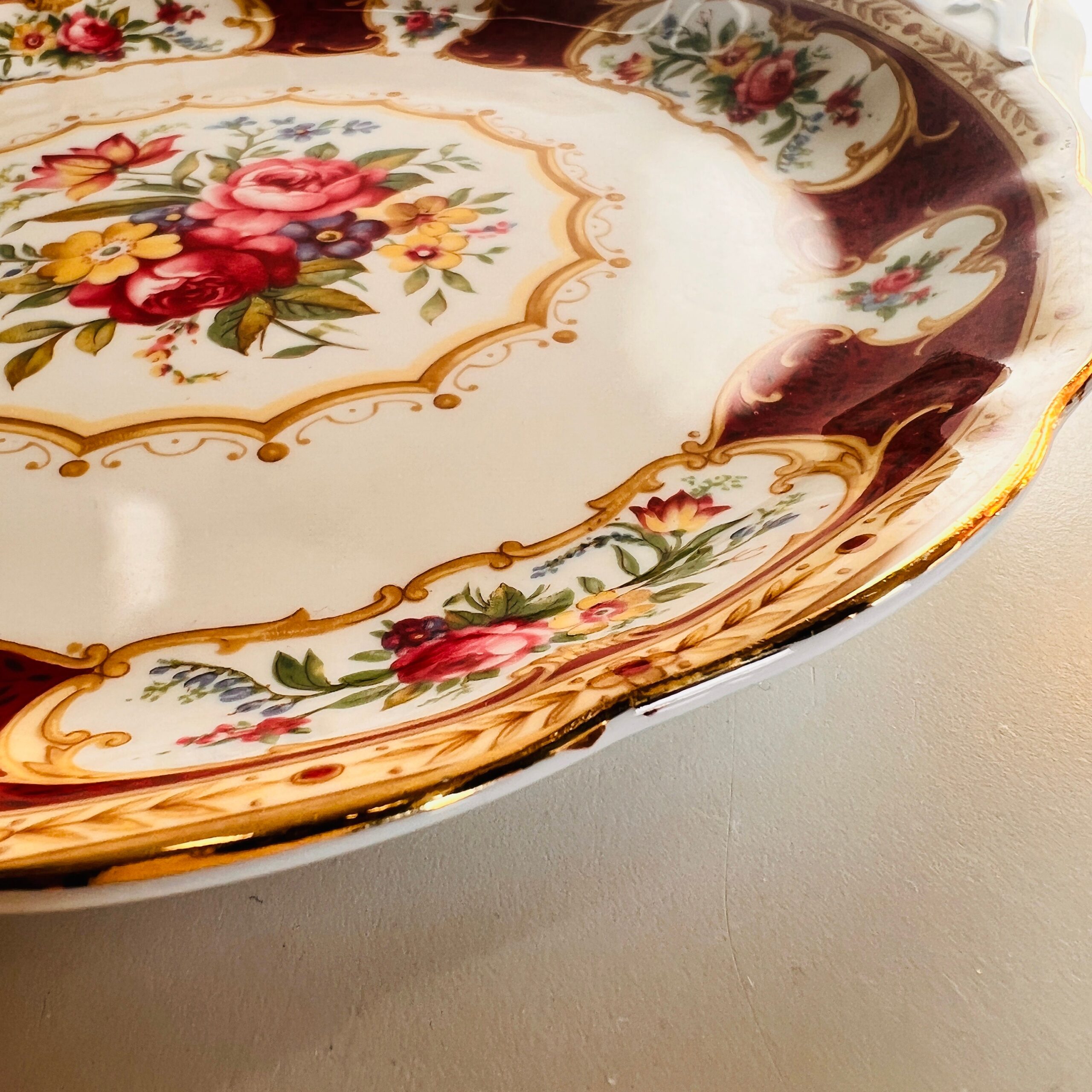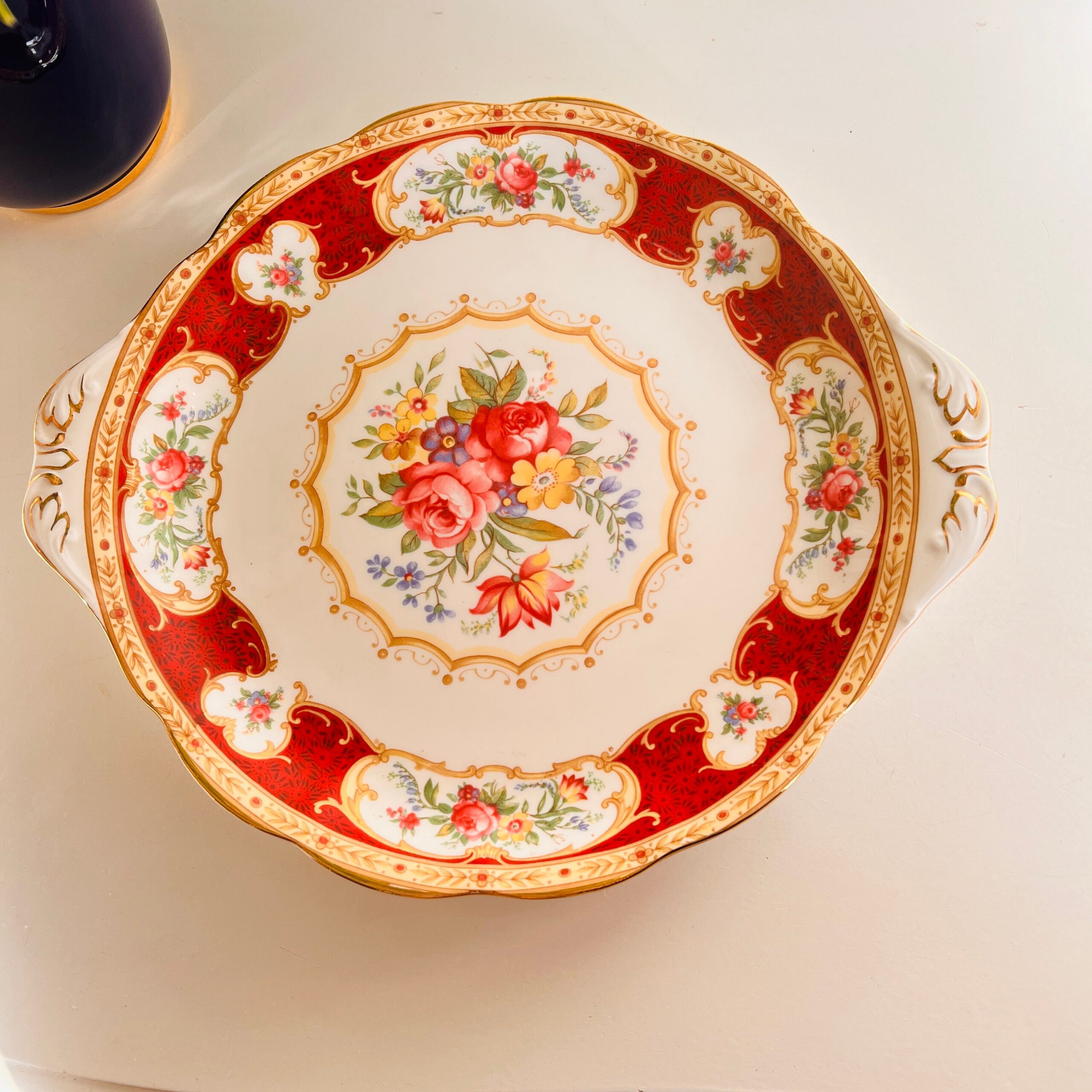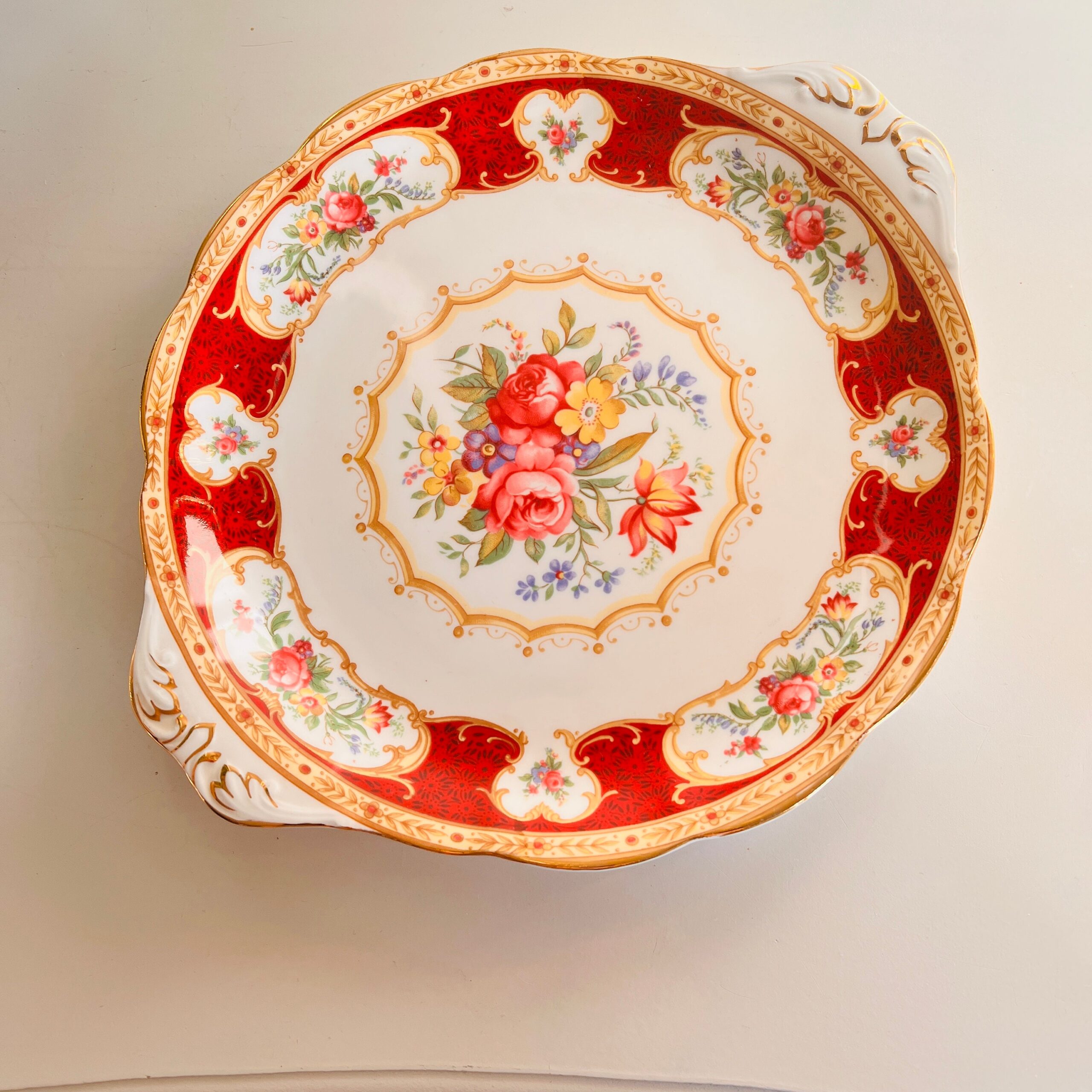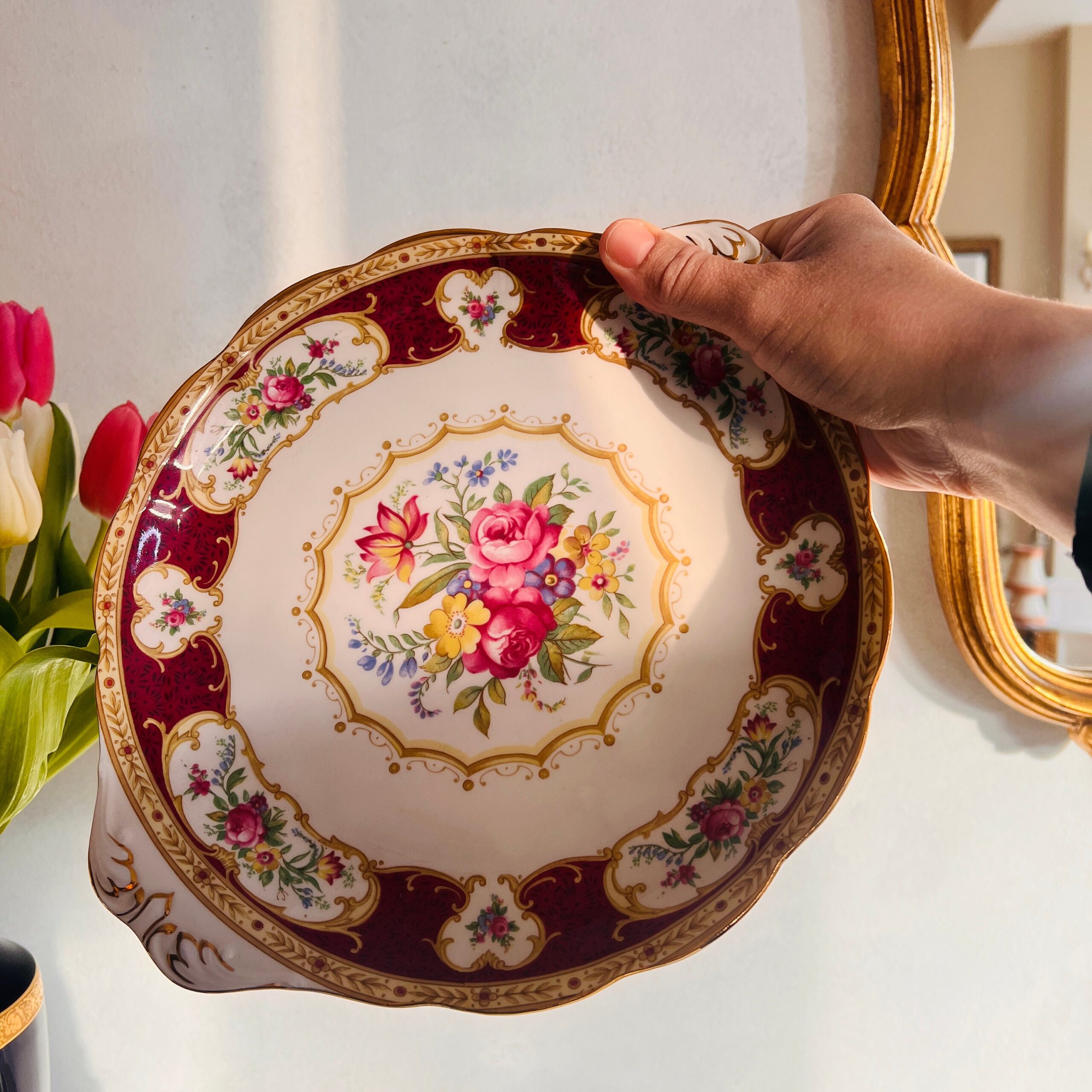 This is a Royal Albert ‘Lady Hamilton’ bone china sandwich/cookies/pastry… plate, in a lovely pattern and multicolor flowers. Gilded edges at the handles.