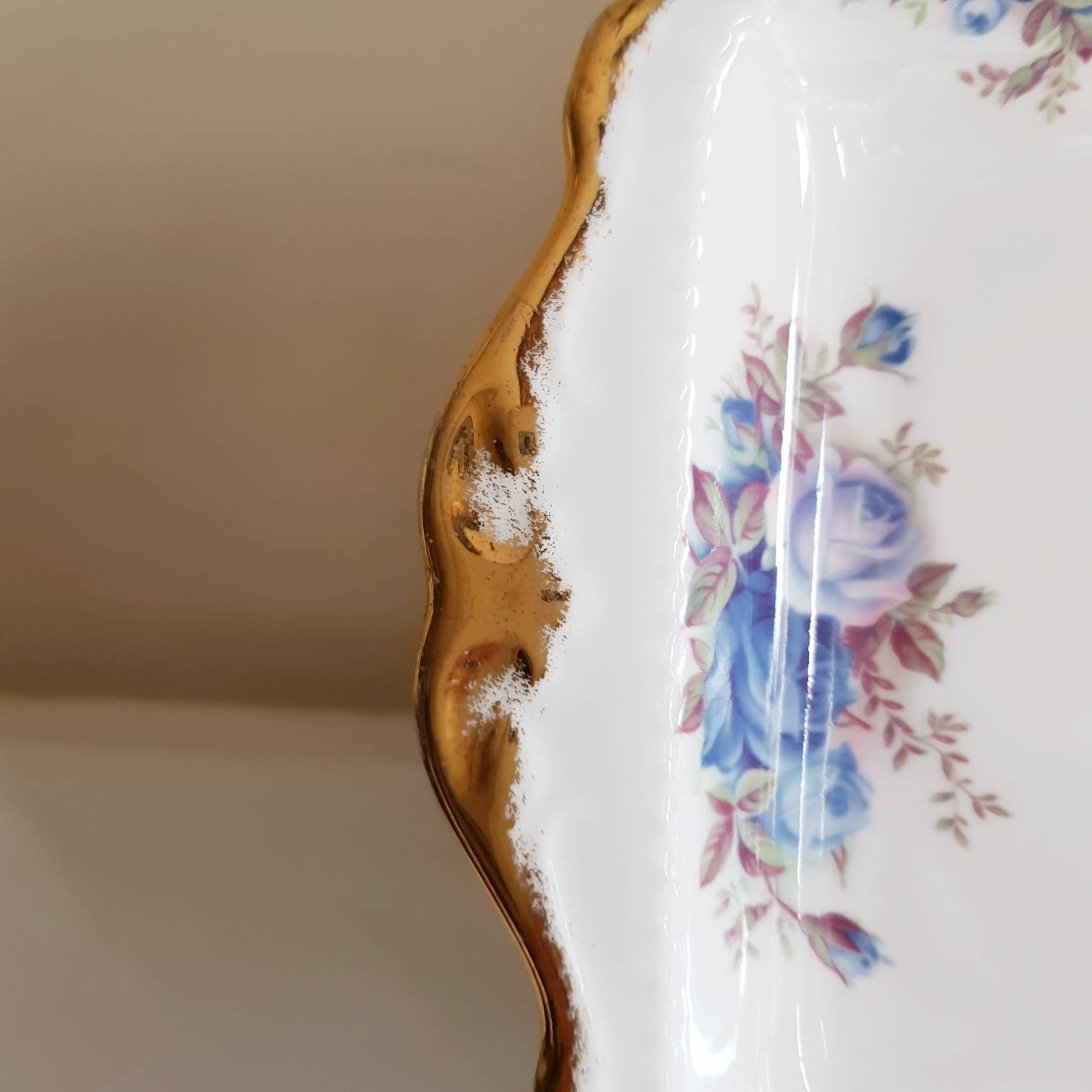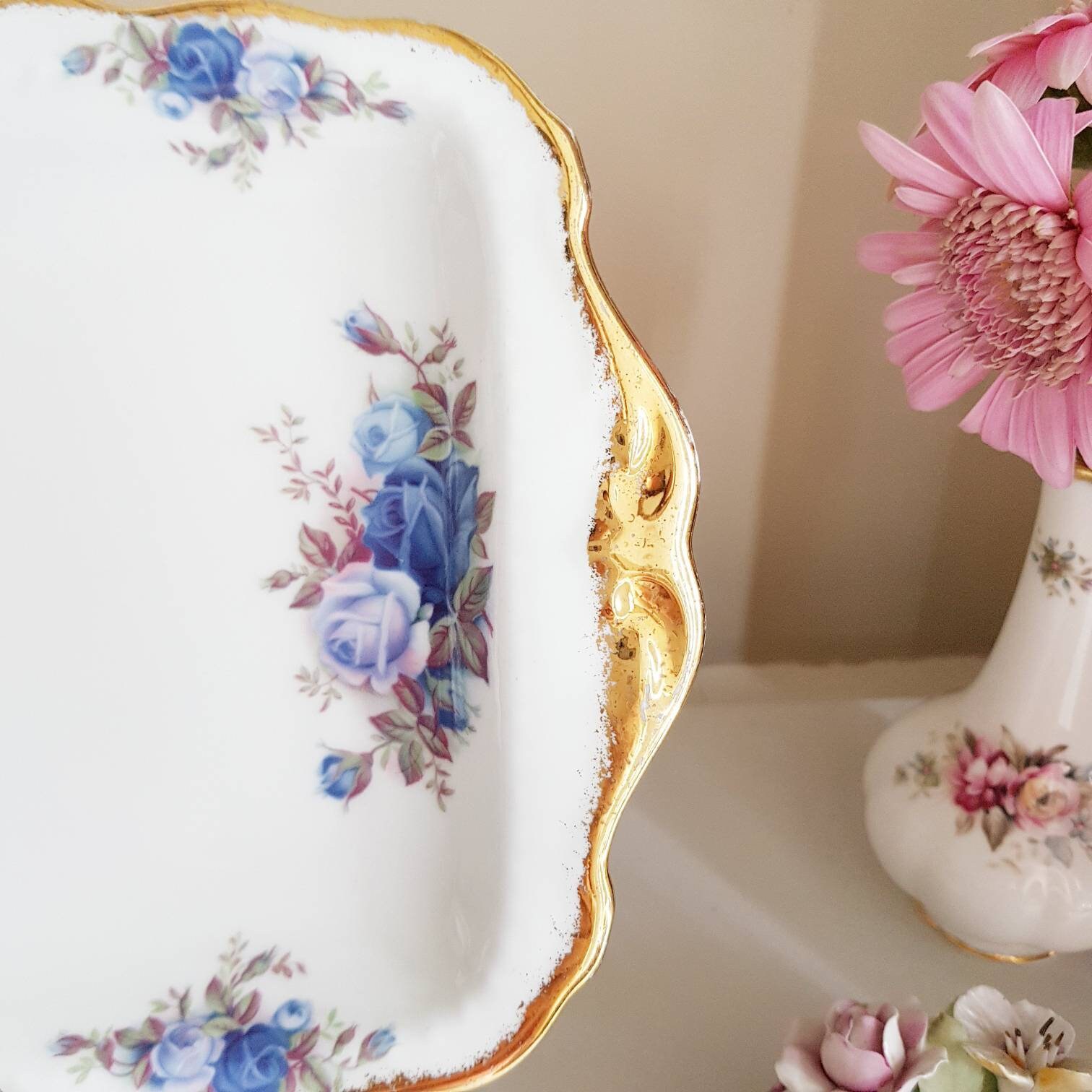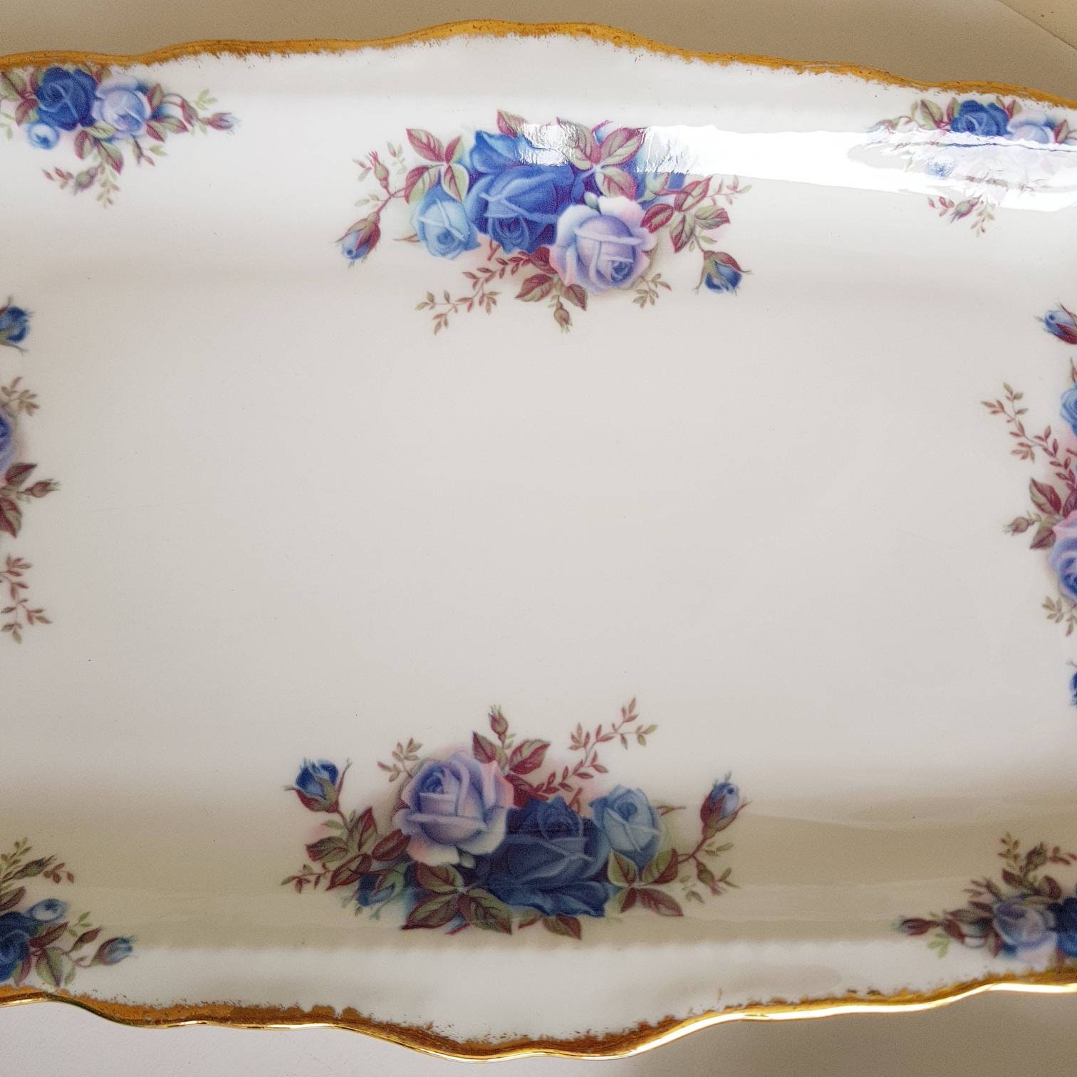 This is an original Royal Albert Moonlight Rose bone china sandwich plate, in a lovely pattern of blue panels with flowers and gilded gold edges.