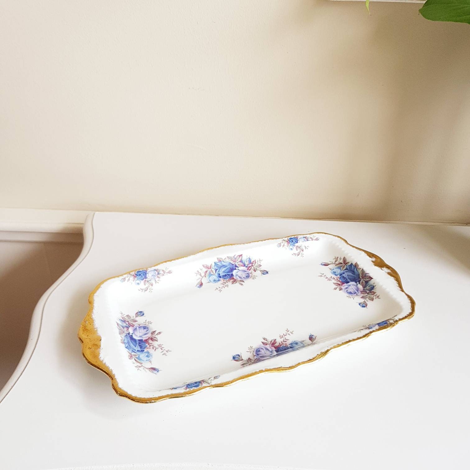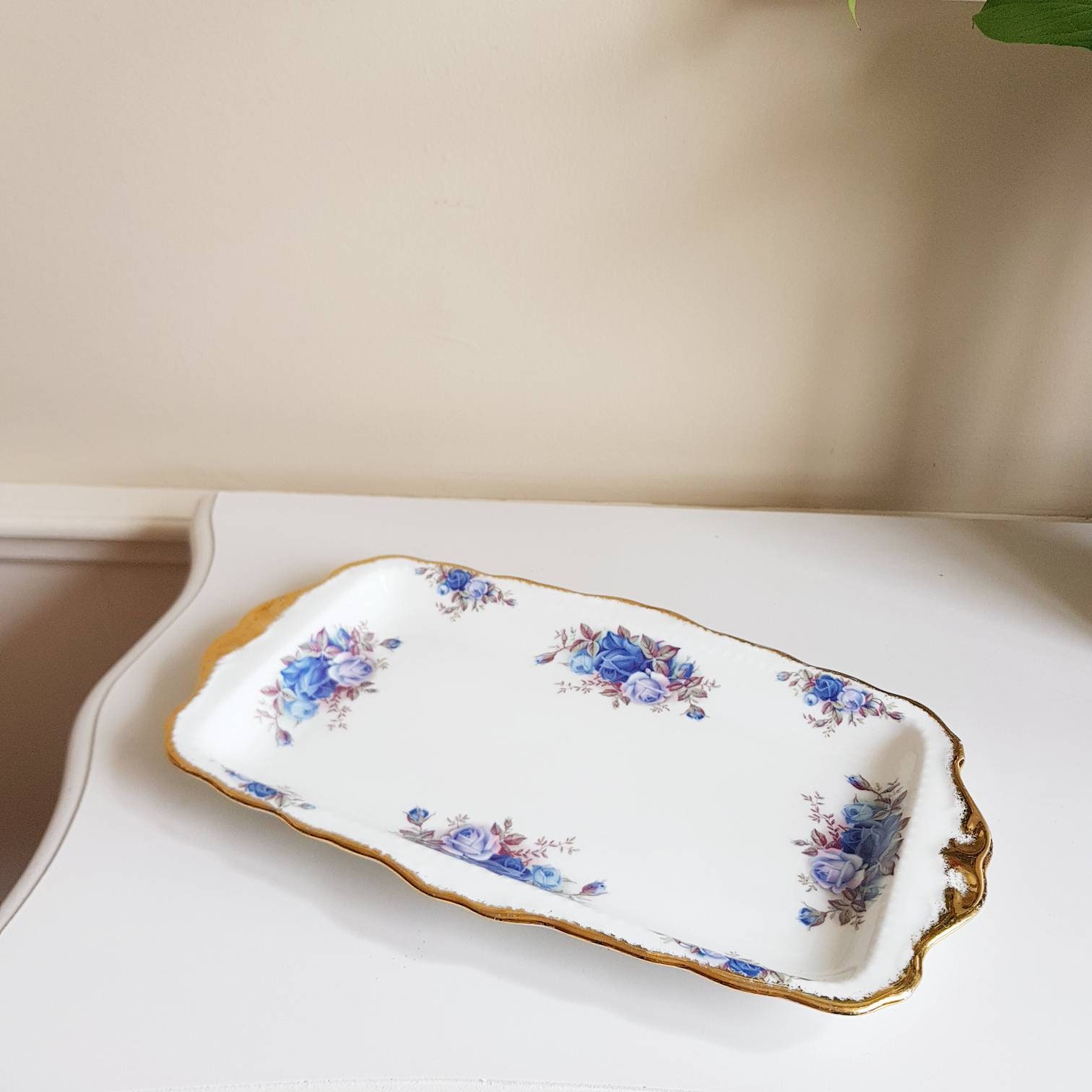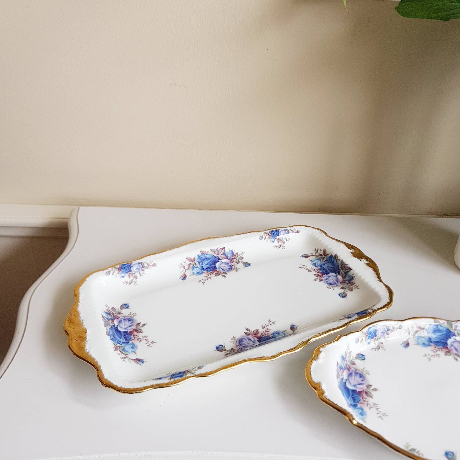 This is an original Royal Albert Moonlight Rose bone china sandwich plate, in a lovely pattern of blue panels with flowers and gilded gold edges.