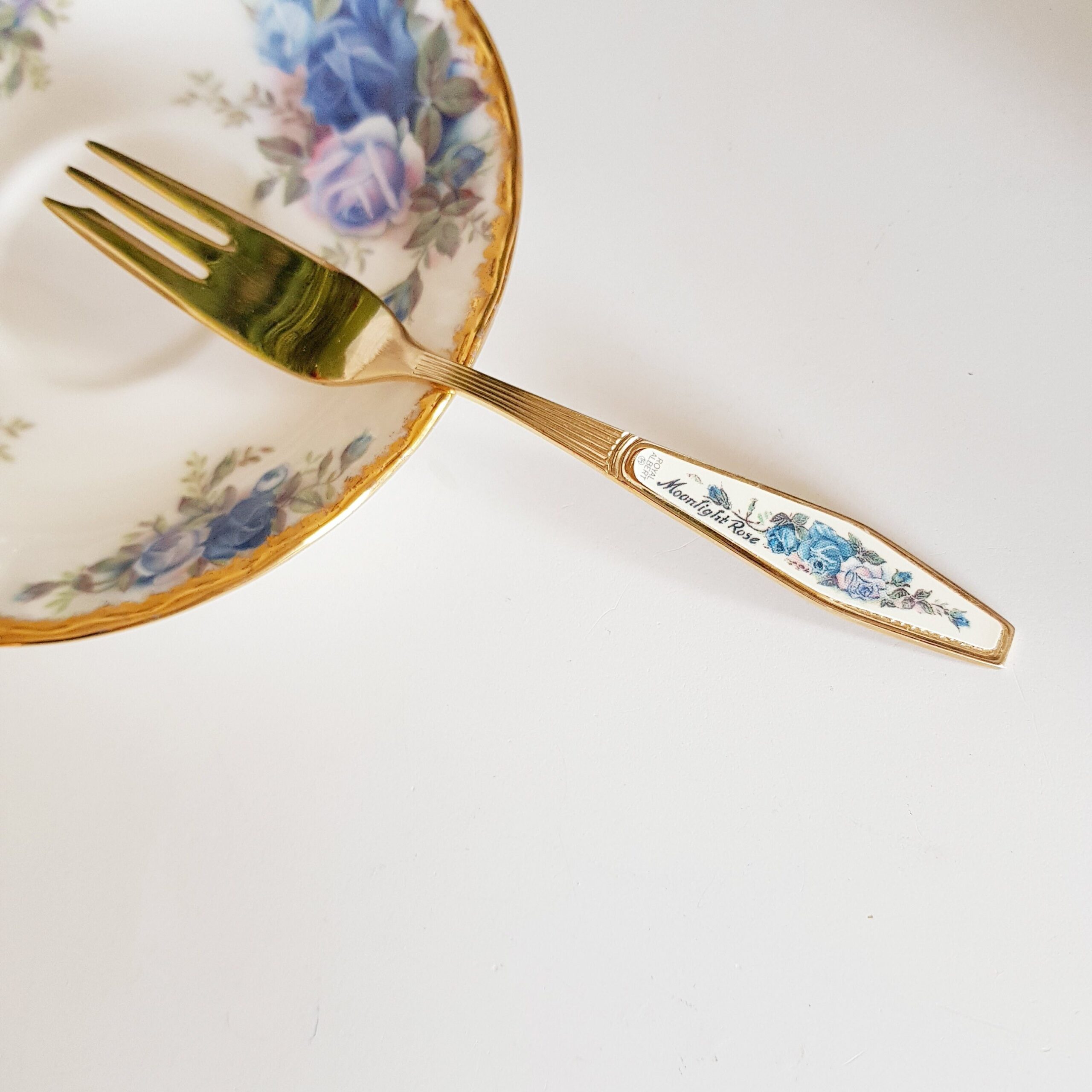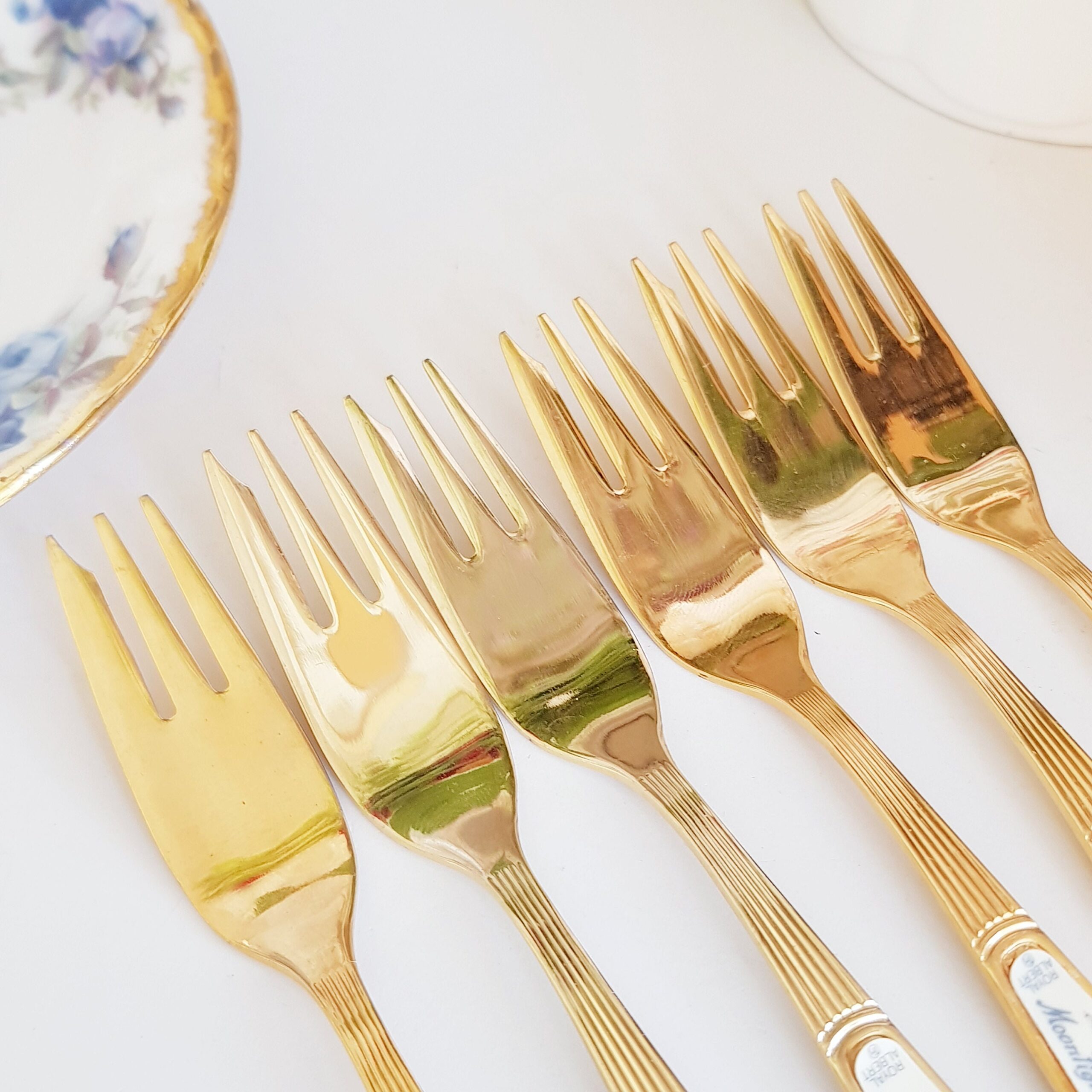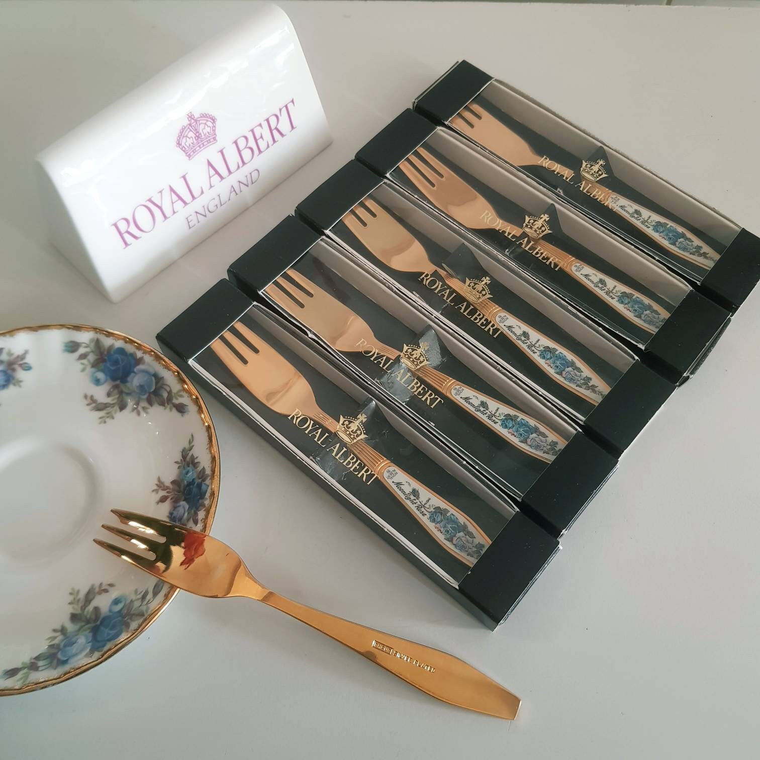 RARE Royal Albert ”Moonlight Rose” golden forks for pastry set, vintage crockery, tableware set, nice idea gift. In the original packaging.