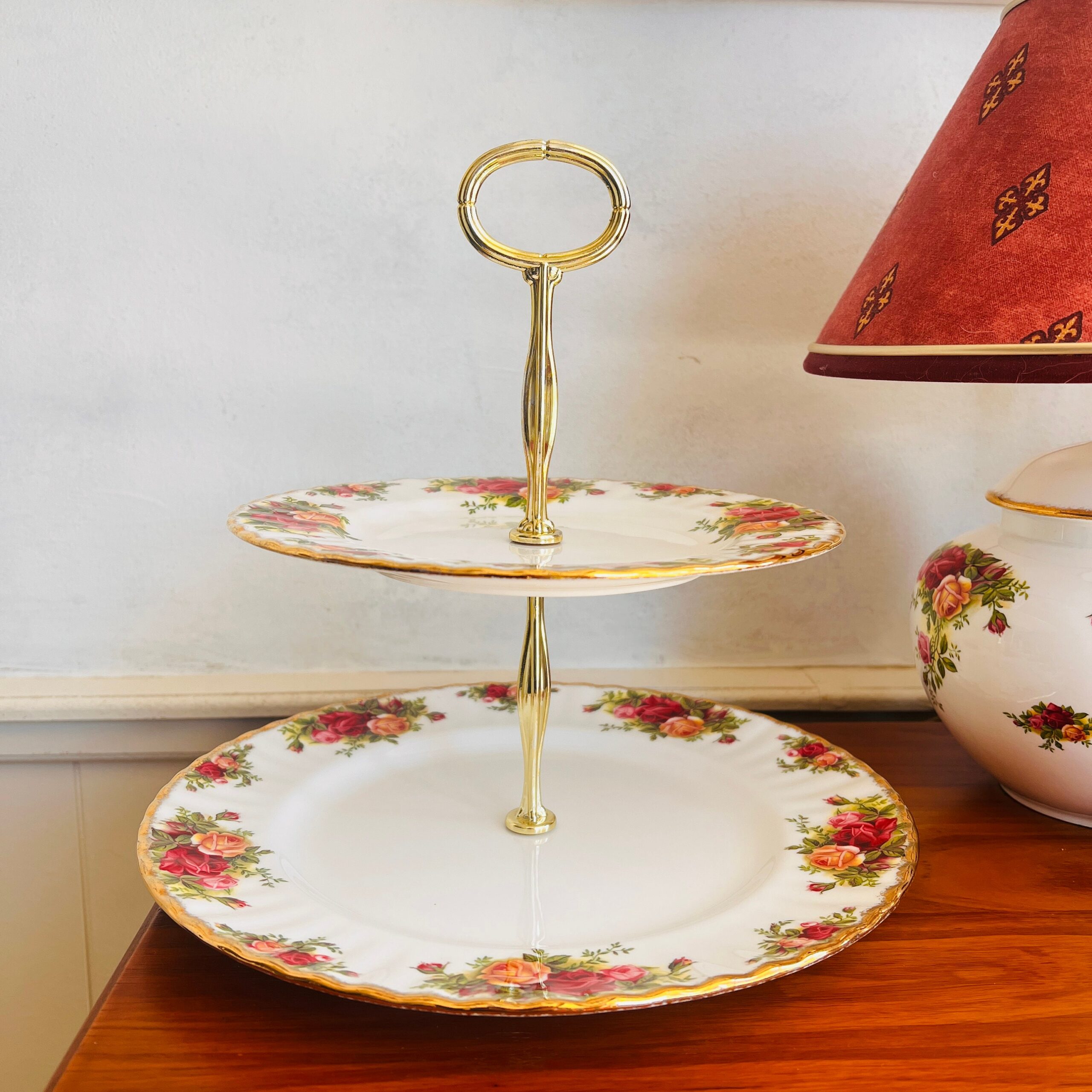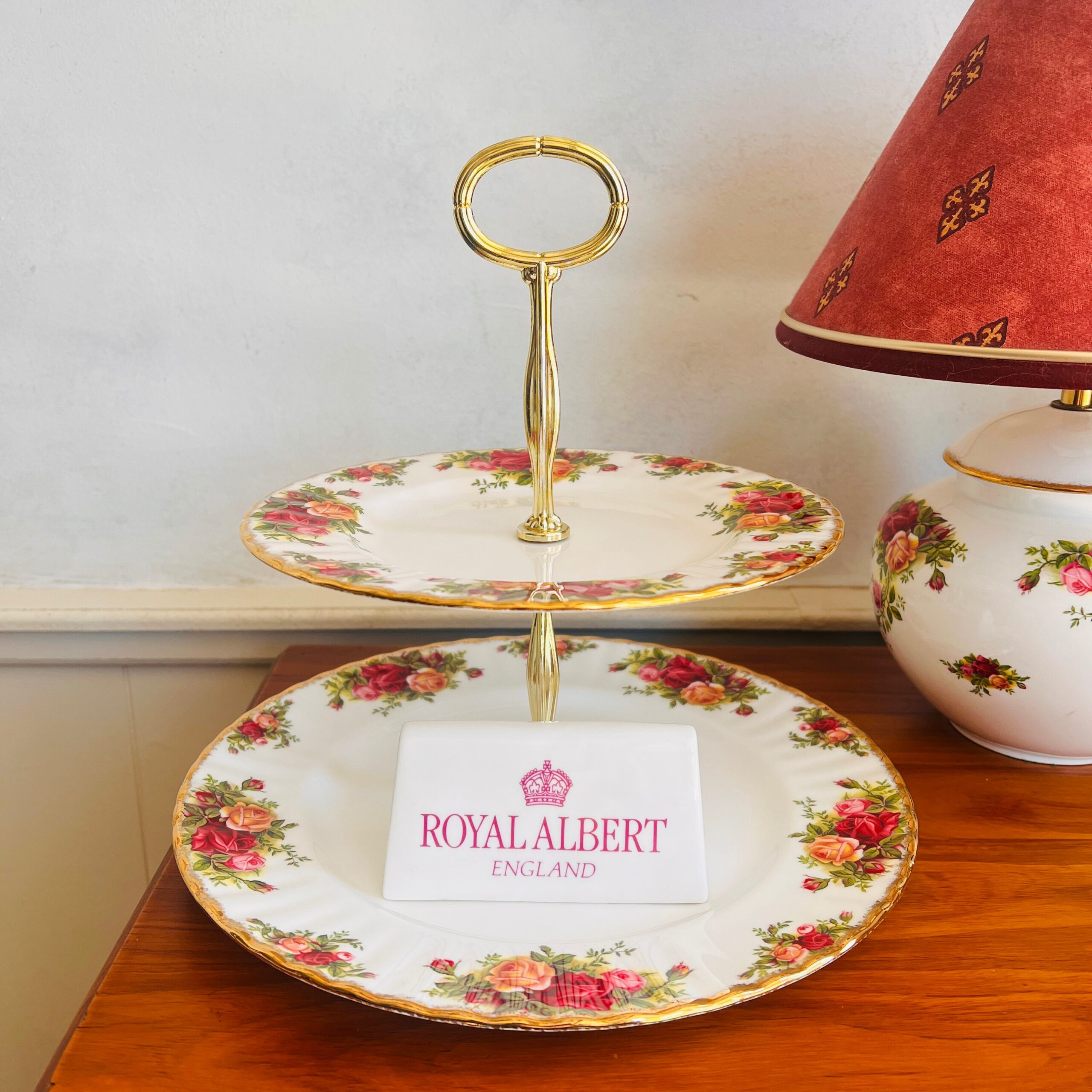 Original Royal Albert Old Country Roses Double Tier with Handle, Cake Stand, Made in England