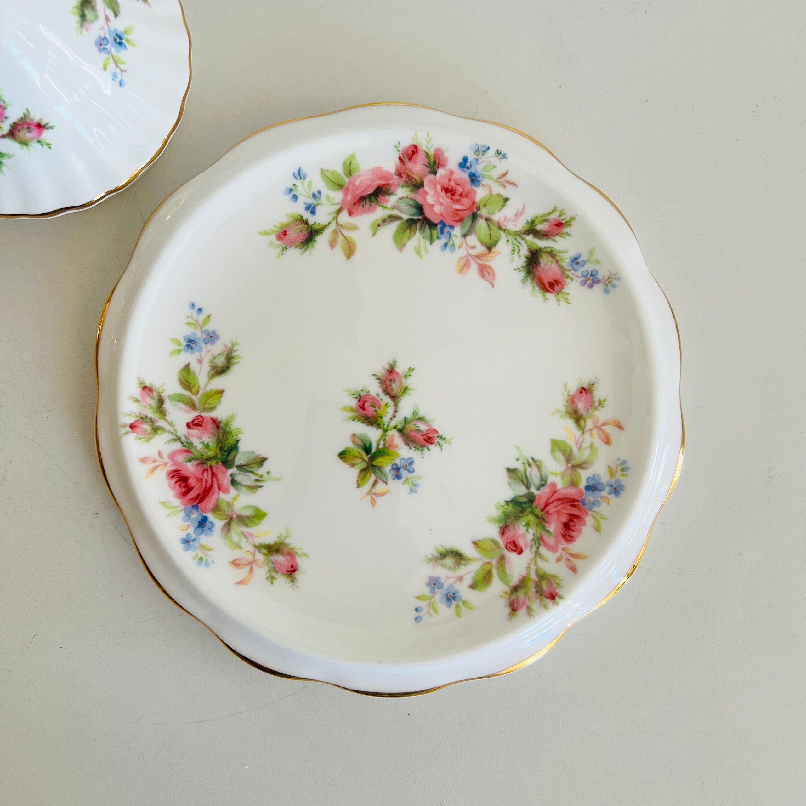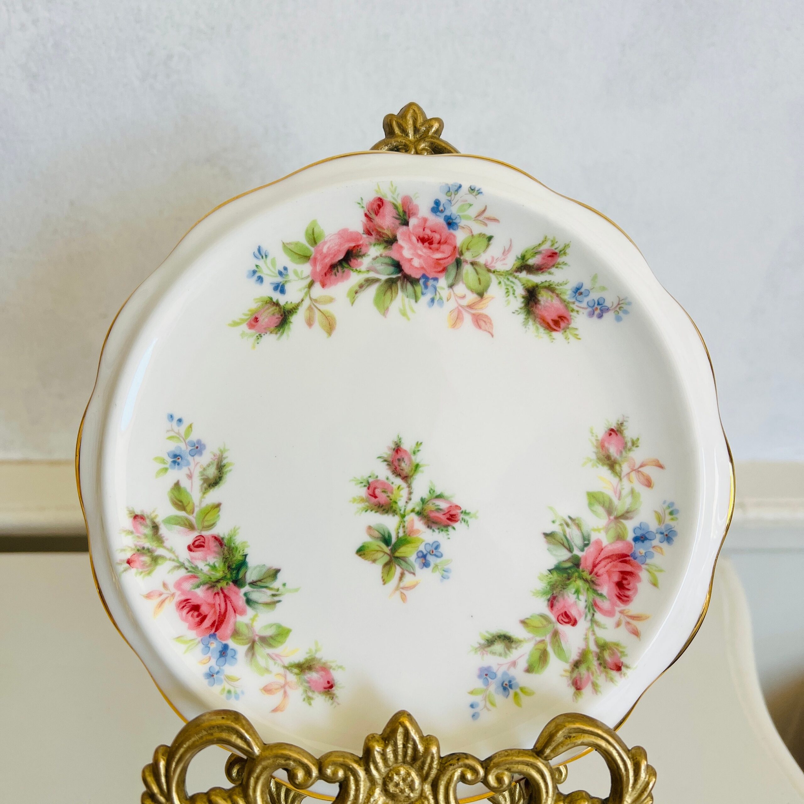 Delicate yet practical, this Royal Albert trivet in the Moss Rose pattern is a quietly elegant piece meant to serve and charm at once. Crafted in fine English bone china with soft pink blossoms and gentle green foliage, it’s the perfect mat for your vintage teapot – or a lovely way to add an old-world floral accent to your tea ritual.
