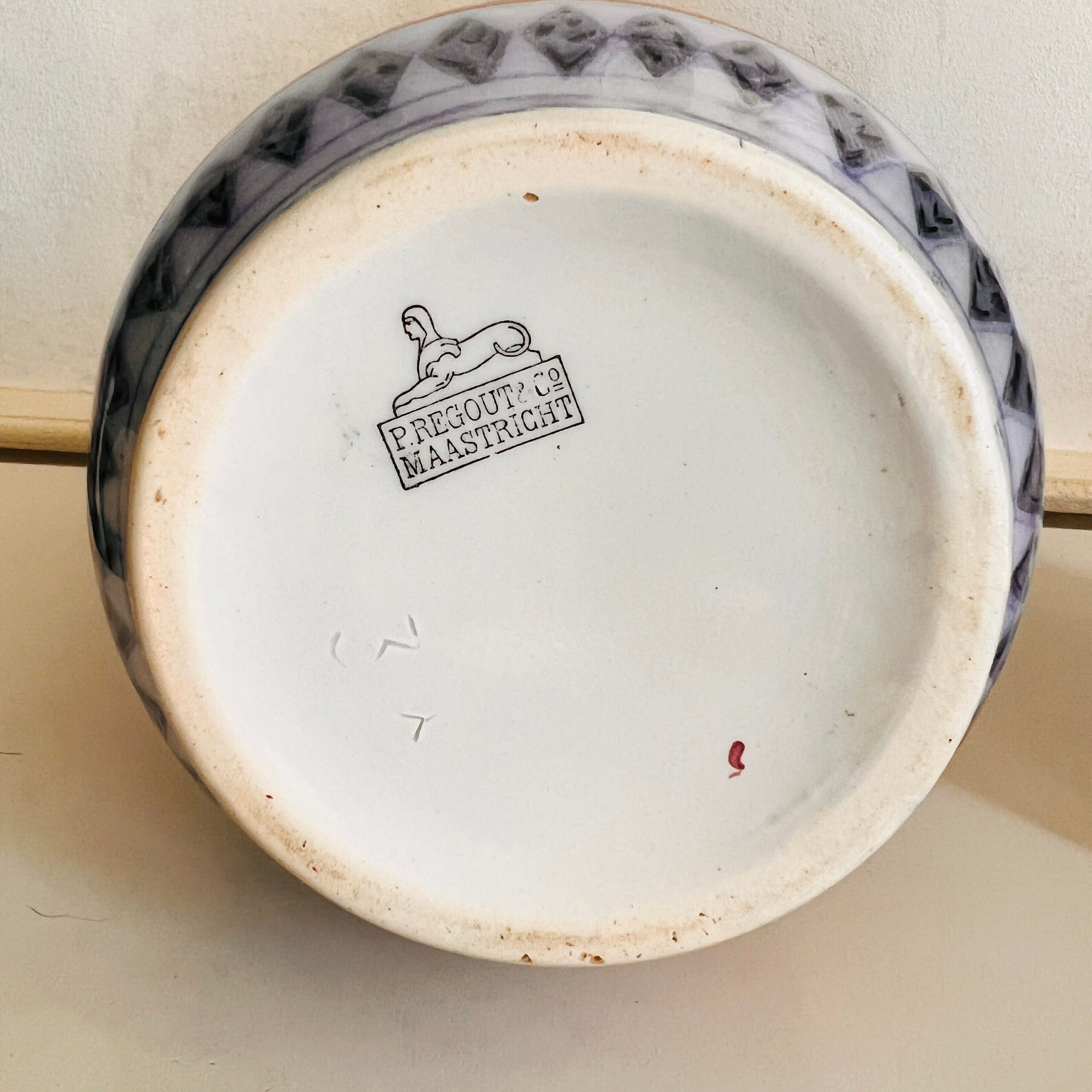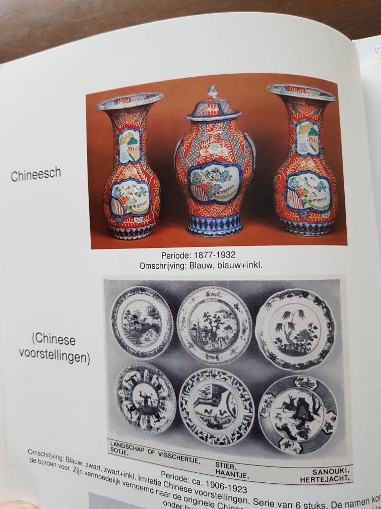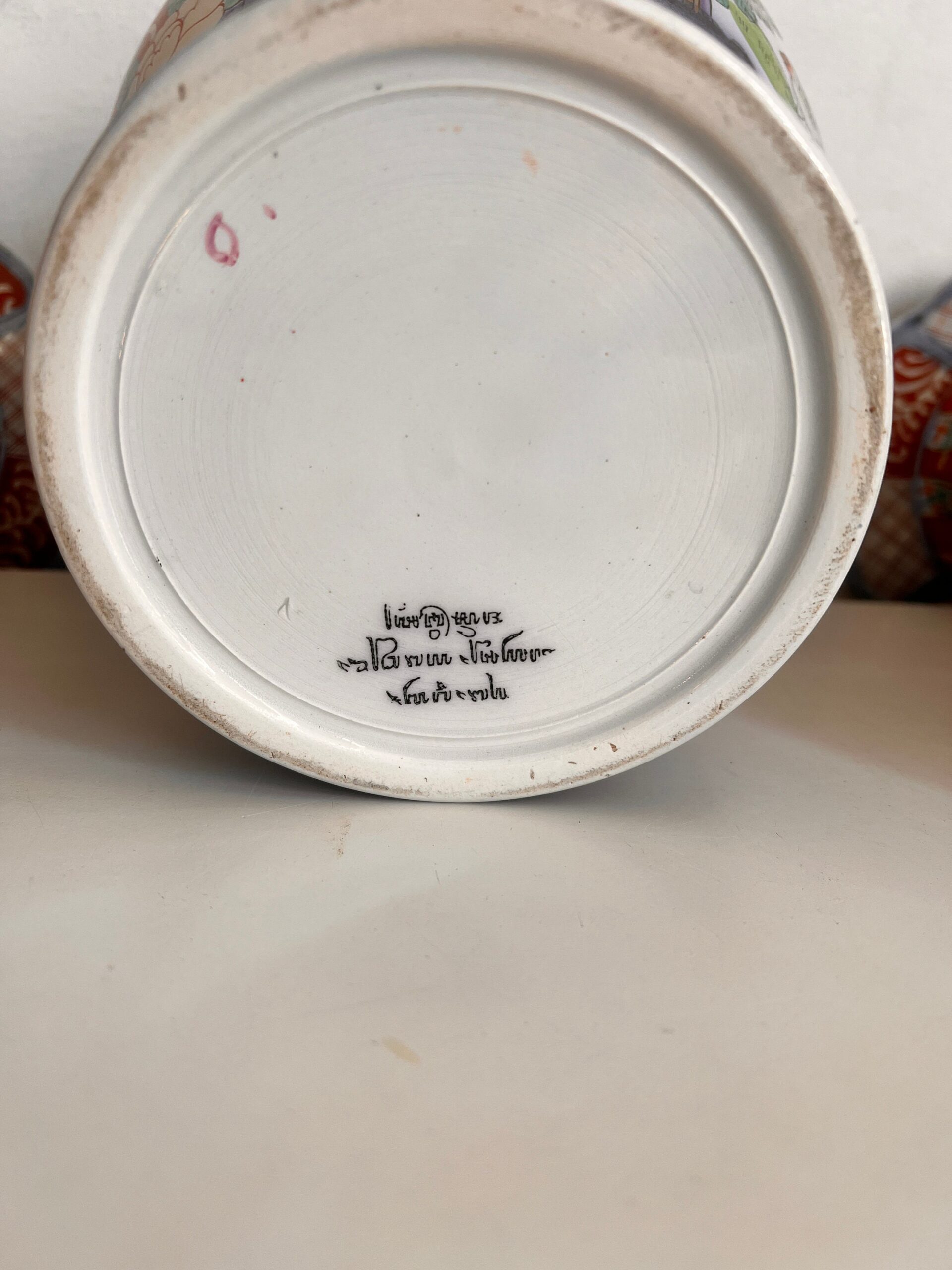 Regout in Maastricht, the Netherlands. The set includes two large (34 cm) collar vases and one large (30 cm) covered vase. The decorations were applied by underglaze transfer printing (the black lines and shadows and light blue color), on top of which other colors were handpainted overglaze. These overglaze colors include red, dark blue, pale green, dark green, white, peach metallic luster paint, and some gold paint. This is an unusual amount of hand painting for Petrus Regout, who typically produced transfer-printed vases with only a few added handpainted details. The resulting vases look oriental but have a distinct western (Delft style) look. An excellent combination of East meets West!