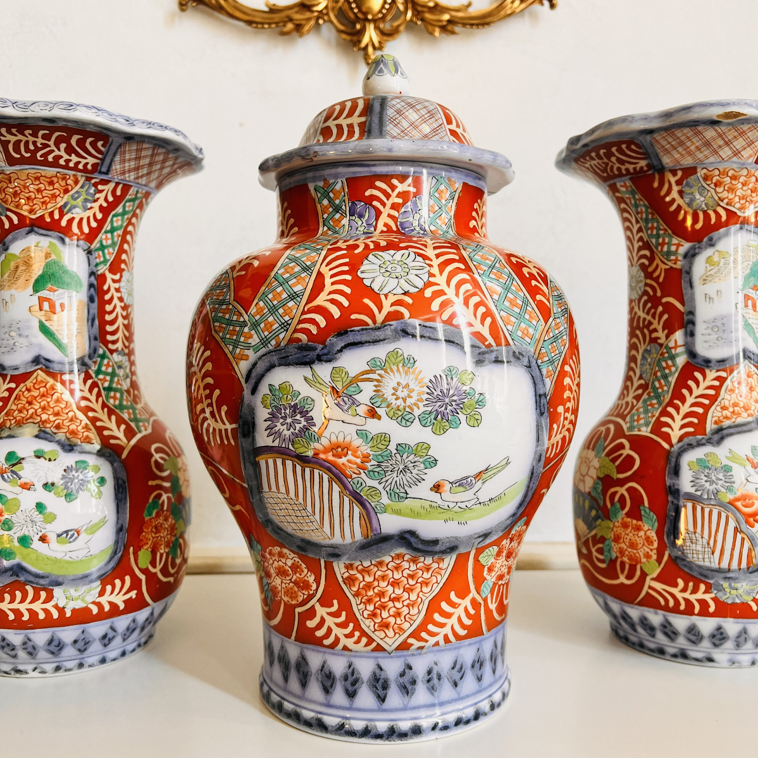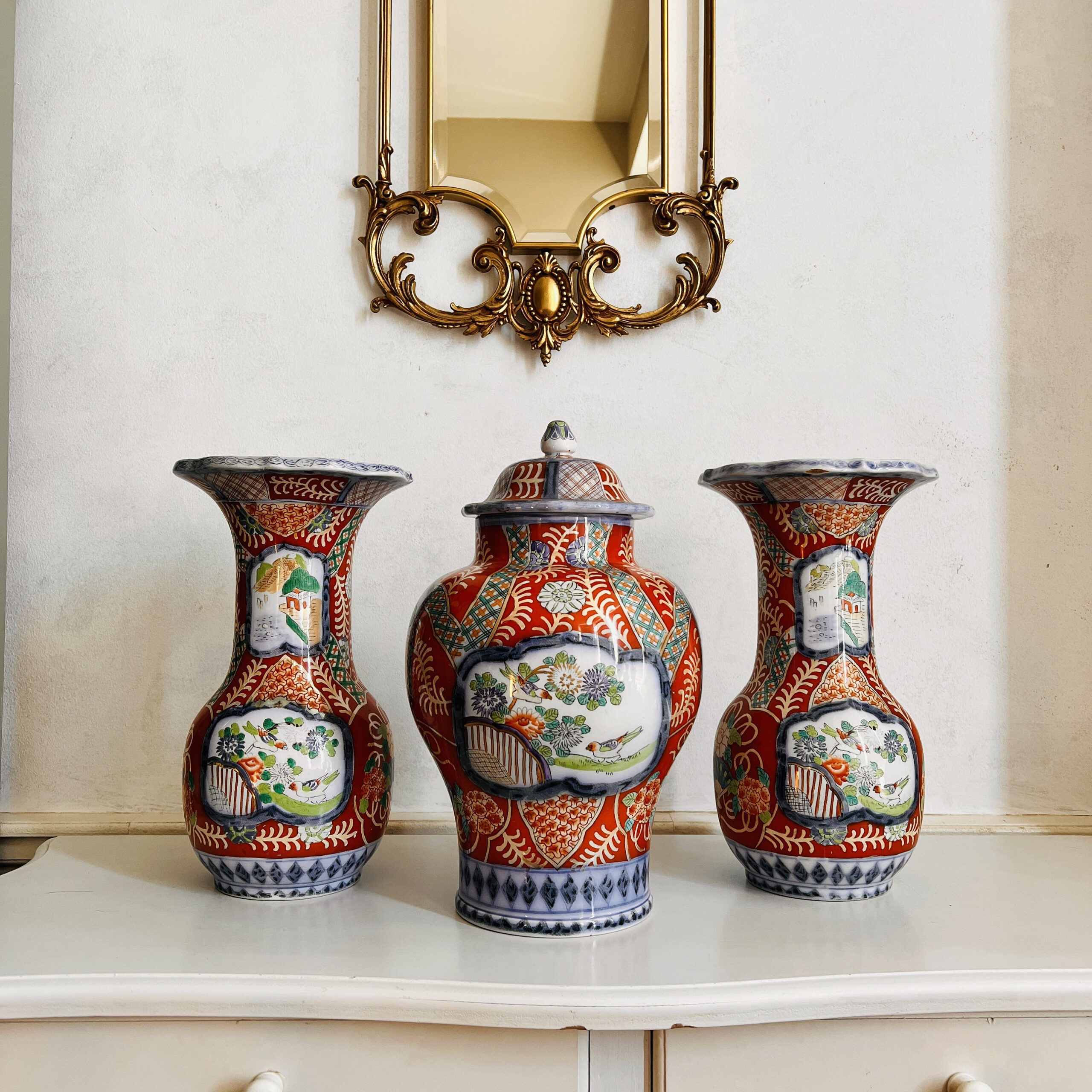 This is a lovely set of antique vases, very decorative and impressive! The Chinese imari style goes back to the roots of Dutch Delftware.