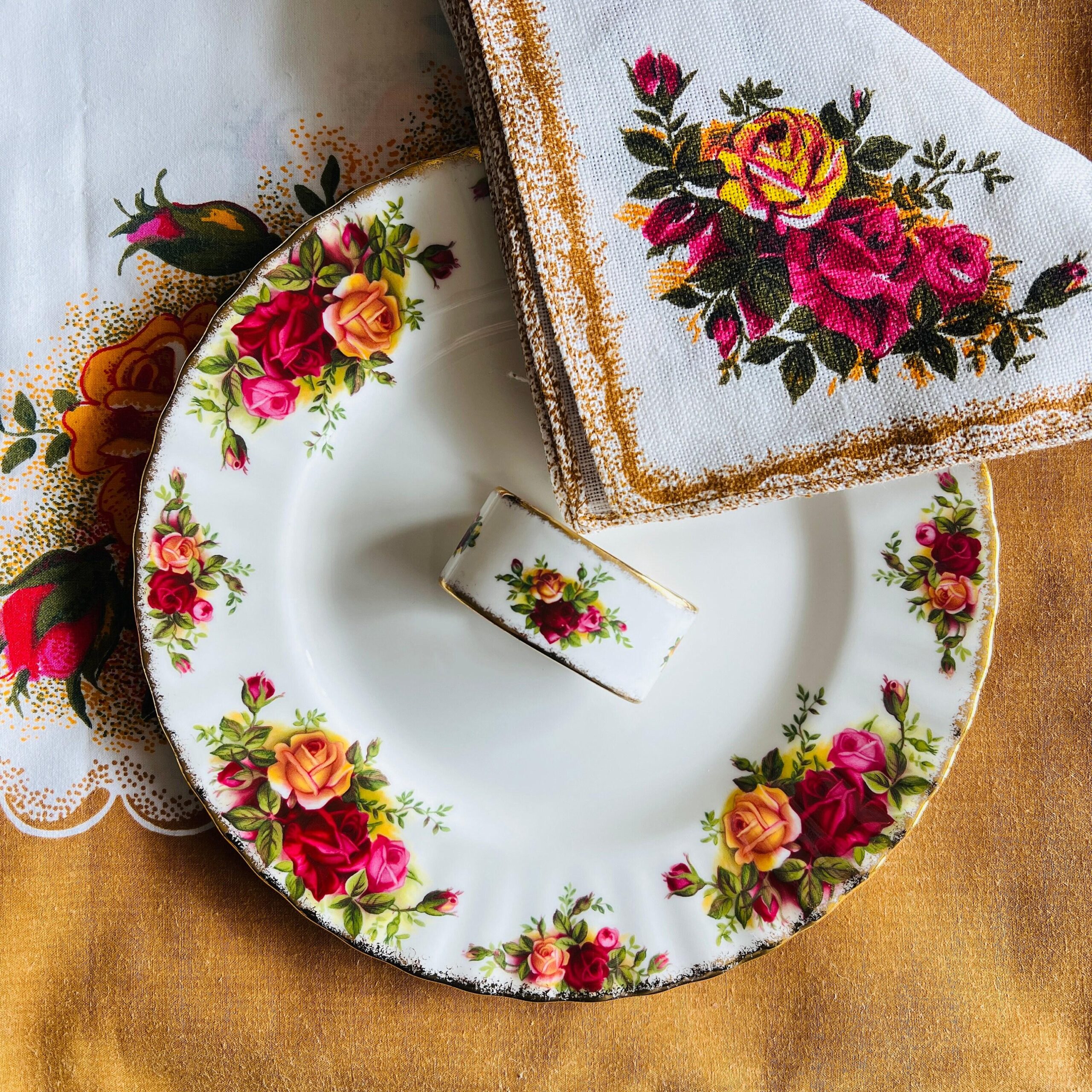 • Beloved ‘Old Country Roses’ pattern in red, pink, and yellow with gold trim
