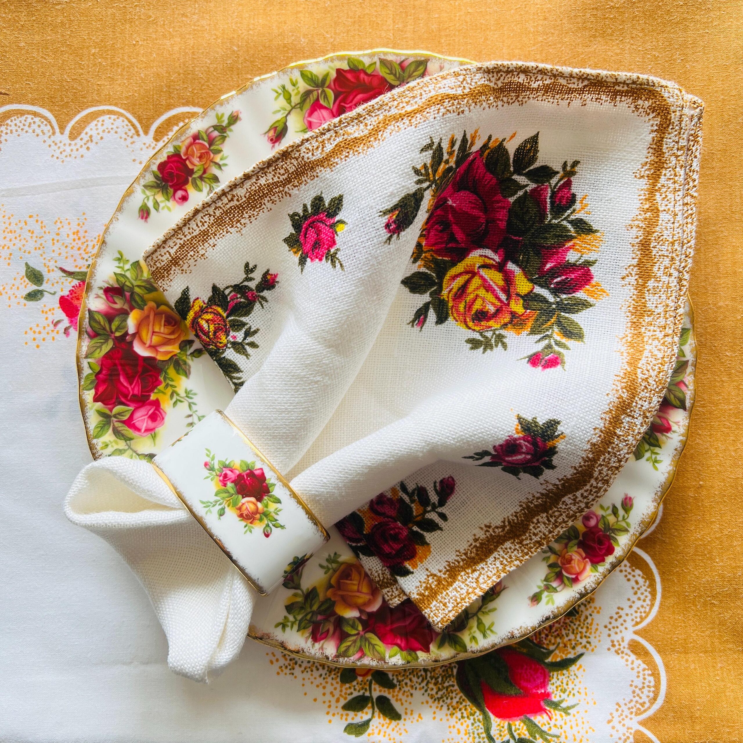 Royal Albert Bone China Napkin Rings – Old Country Roses, Set of 6 with Linen Napkins