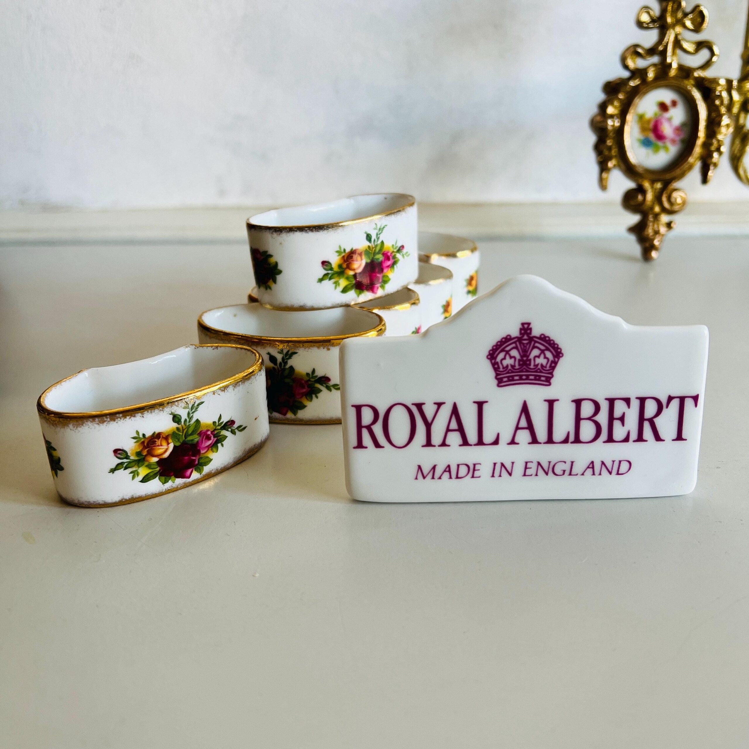 • Includes 6 vintage bone china napkin rings by Royal Albert