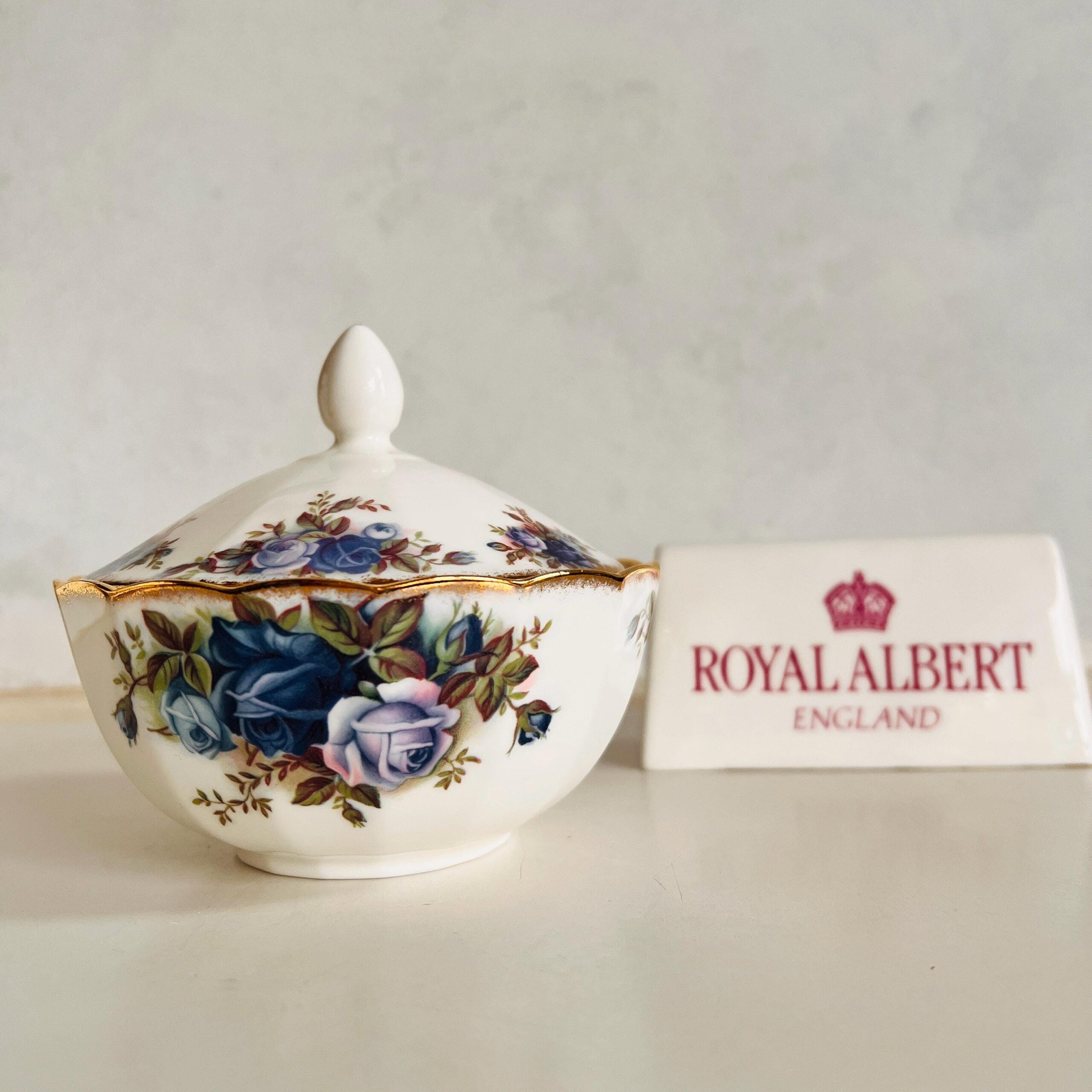 An exquisite piece of fine English porcelain, this Royal Albert Moonlight Rose candy bowl with lid brings a touch of timeless romance to any table or tea setting. Its delicate blue roses, gold trim, and classic silhouette speak to the grace and grandeur of vintage English crockery. Whether used to offer sweets, chocolates, or simply admired on display, it’s the perfect heirloom accent for collectors and hosts alike.