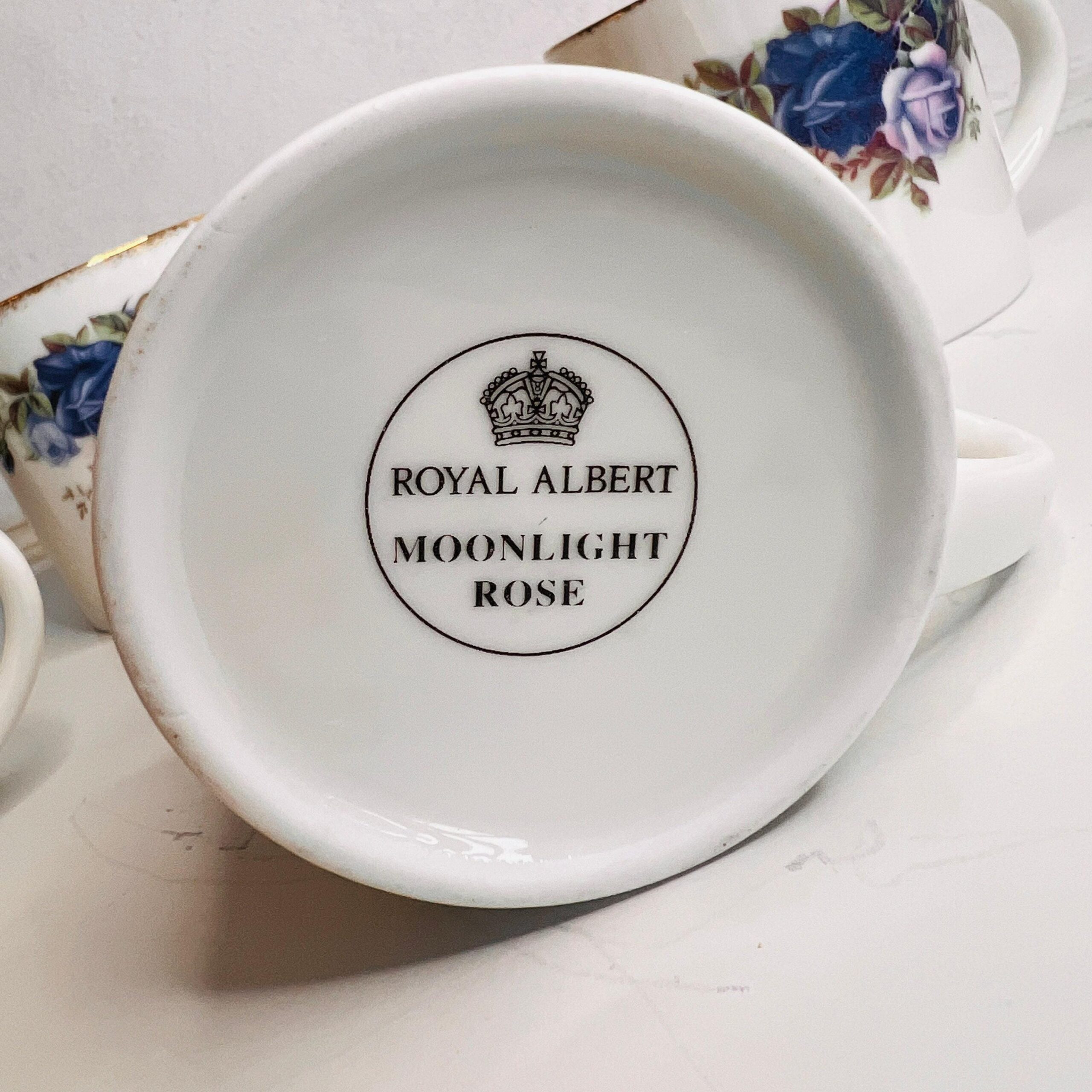 Softly floral with a timeless English charm, this 1987 Royal Albert Moonlight Rose teacup brings elegance and grace to your tea ritual. The iconic blue rose motif paired with gleaming gold trim is a signature of Royal Albert’s beloved pattern, making this porcelain mug both functional and collectible.