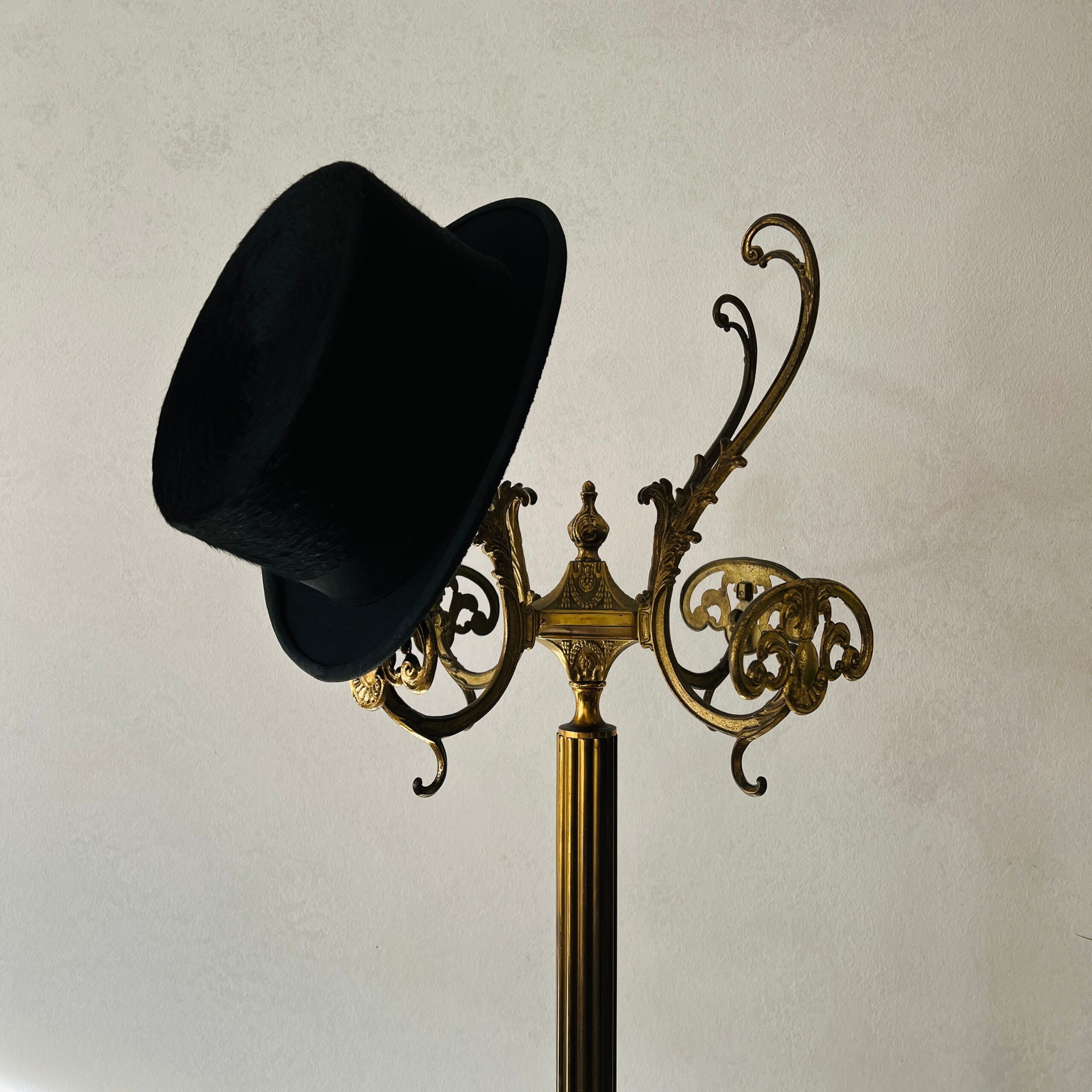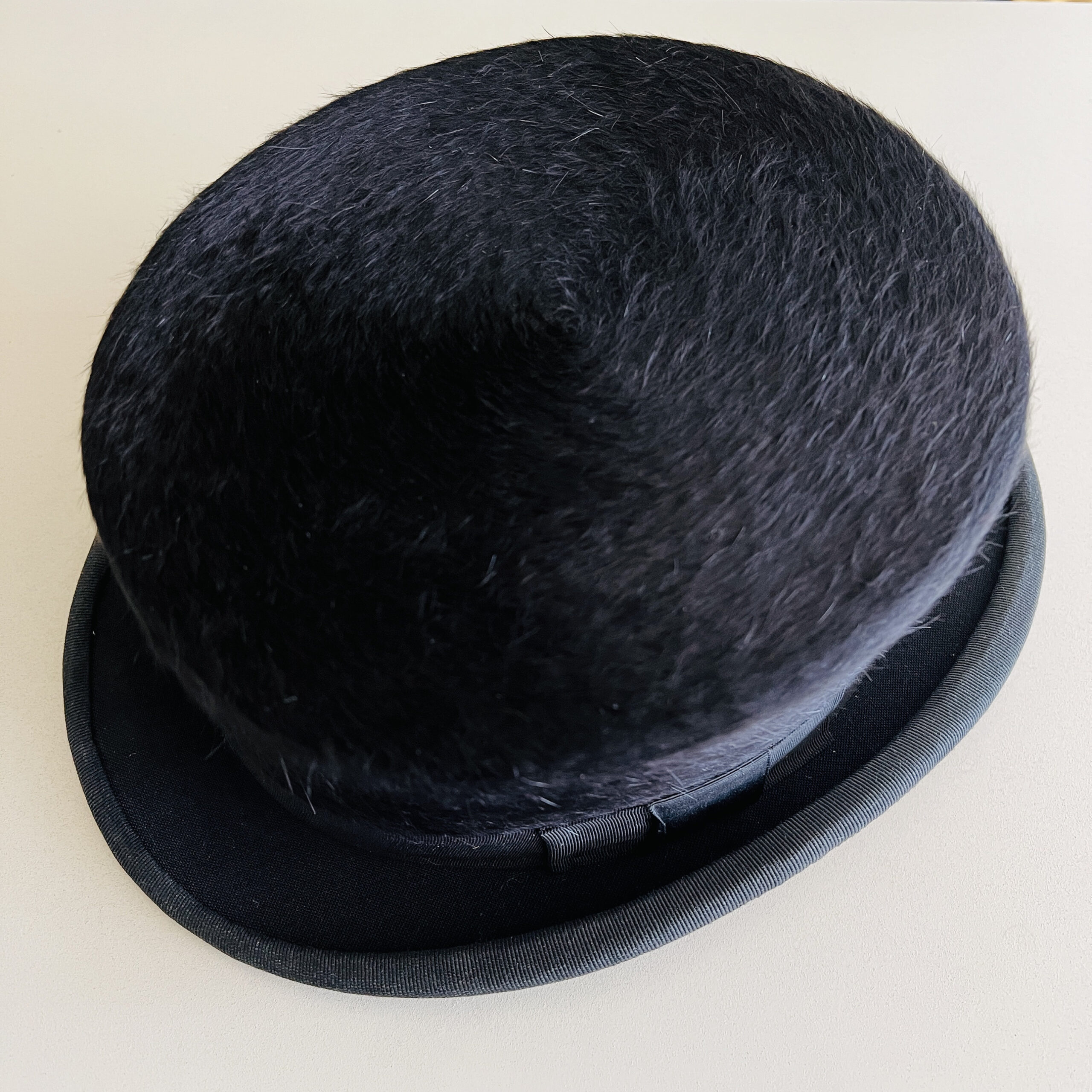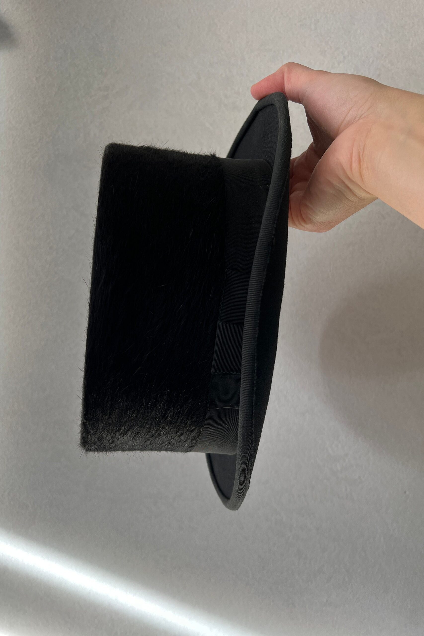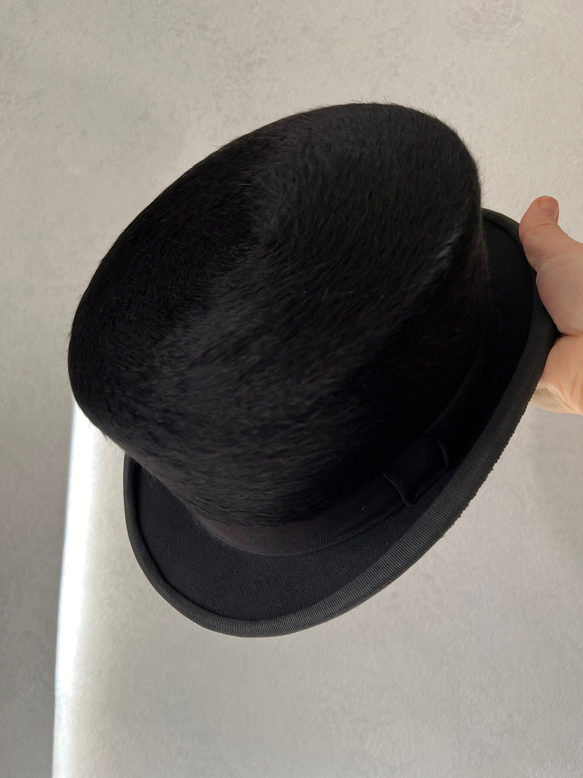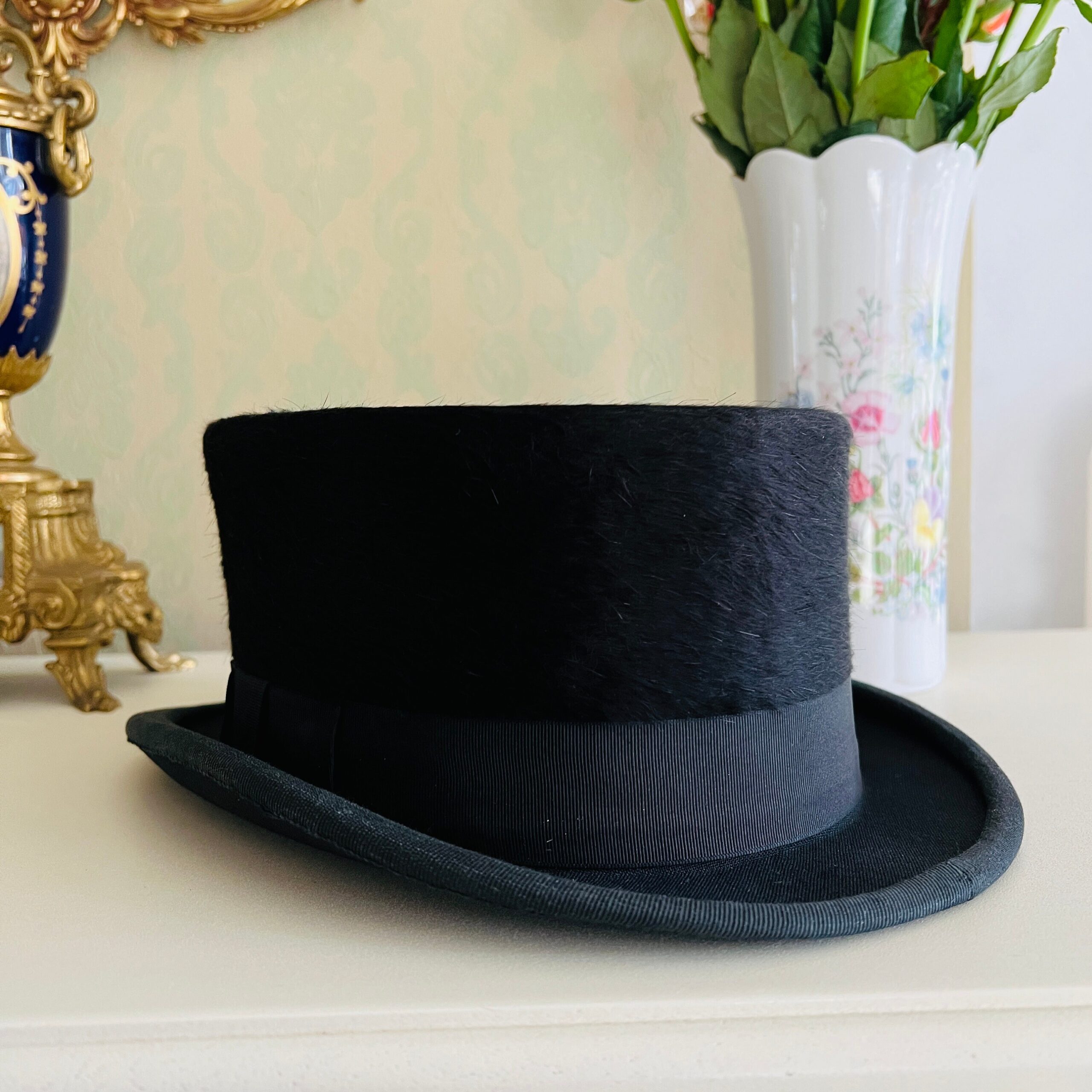 A timeless piece of mid-century elegance, this vintage black silk top hat arrives in its original storage box – a true collector’s item and a rare nod to classic formalwear. Whether styled for a historic costume, a photoshoot, or proudly displayed in a gentleman’s dressing room or boutique hat collection, its tailored silhouette and lustrous finish carry decades of story in every seam.