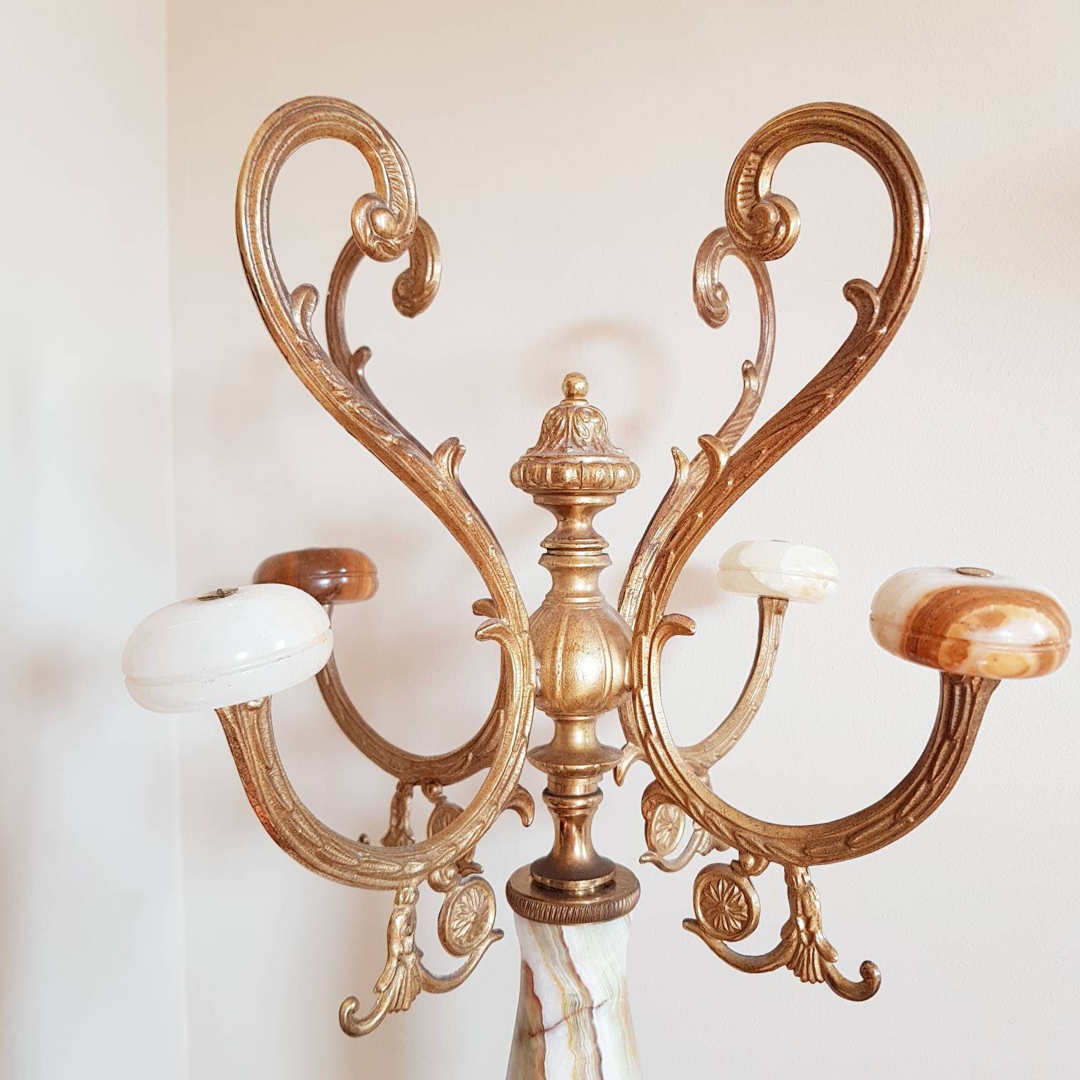 Standing Coat Rack, Marble Coat Stand, Brass stand with 4 Hooks, Italian Hallway Rack, Floor Stand, Hollywood Regency Style.